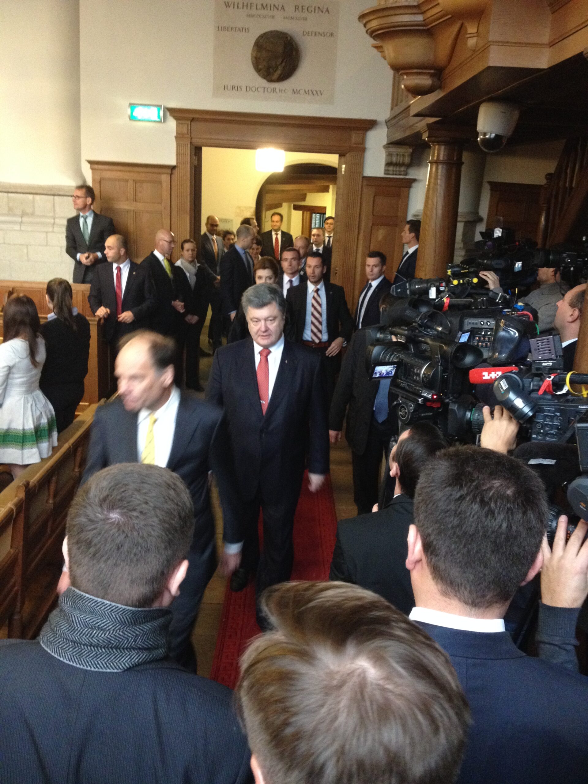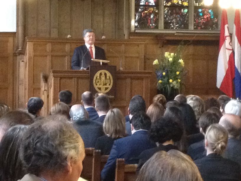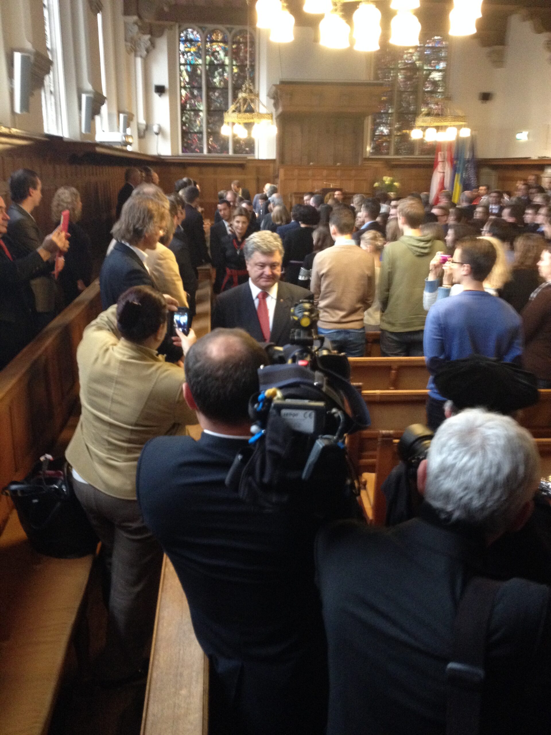 In het Groot Auditorium van de Universiteit Leiden zat ook Thierry Baudet – één van de initiatiefnemers van Geen Peil – te luisteren (en beleefd te applaudisseren na afloop). Aan hem en de zijnen maakte Poroshenko een bitter en vooral onverholen verwijt: “Veel Europeanen zijn moe en gedesillusioneerd: ‘Laat de Russen maar hebben wat ze willen’. Ze zijn lafaards.”. Voor degene die nu denkt ‘ik wil niet worden betrokken in een oorlog’; in het vragenkwartiertje maakte Poroshenko óók duidelijk dat militair ingrijpen geen oplossing is. De oplossing zal moeten komen uit een “verenigd en solidair Europa” (en dus een vrij Oekraïne). “Op de lange termijn geloof ik in Europa. Maar we moeten verenigd zijn”. Pikant is dat hij denkt “dat er zelfs in Moskou (personen) zijn die denken dat vrede mogelijk is”.