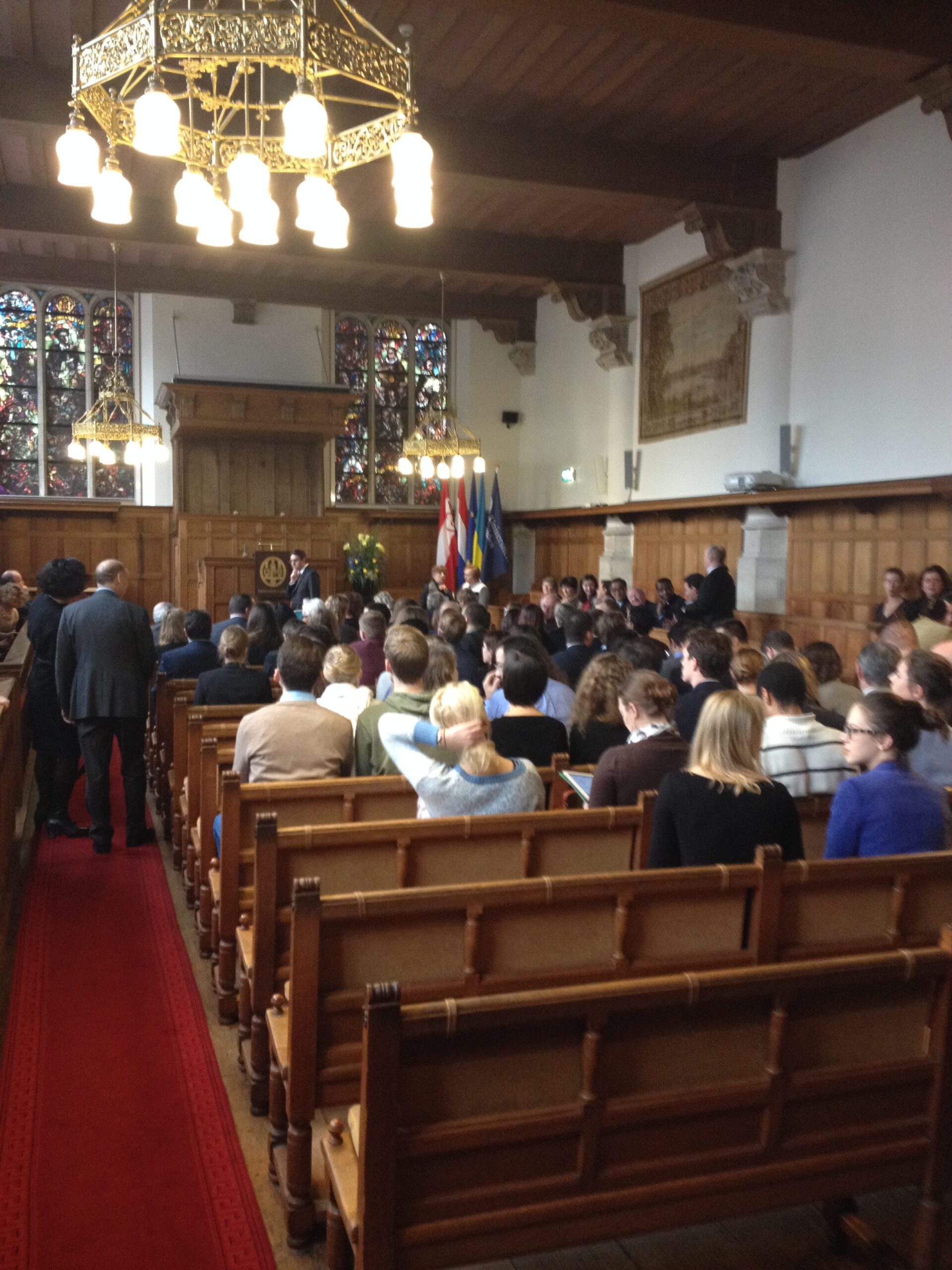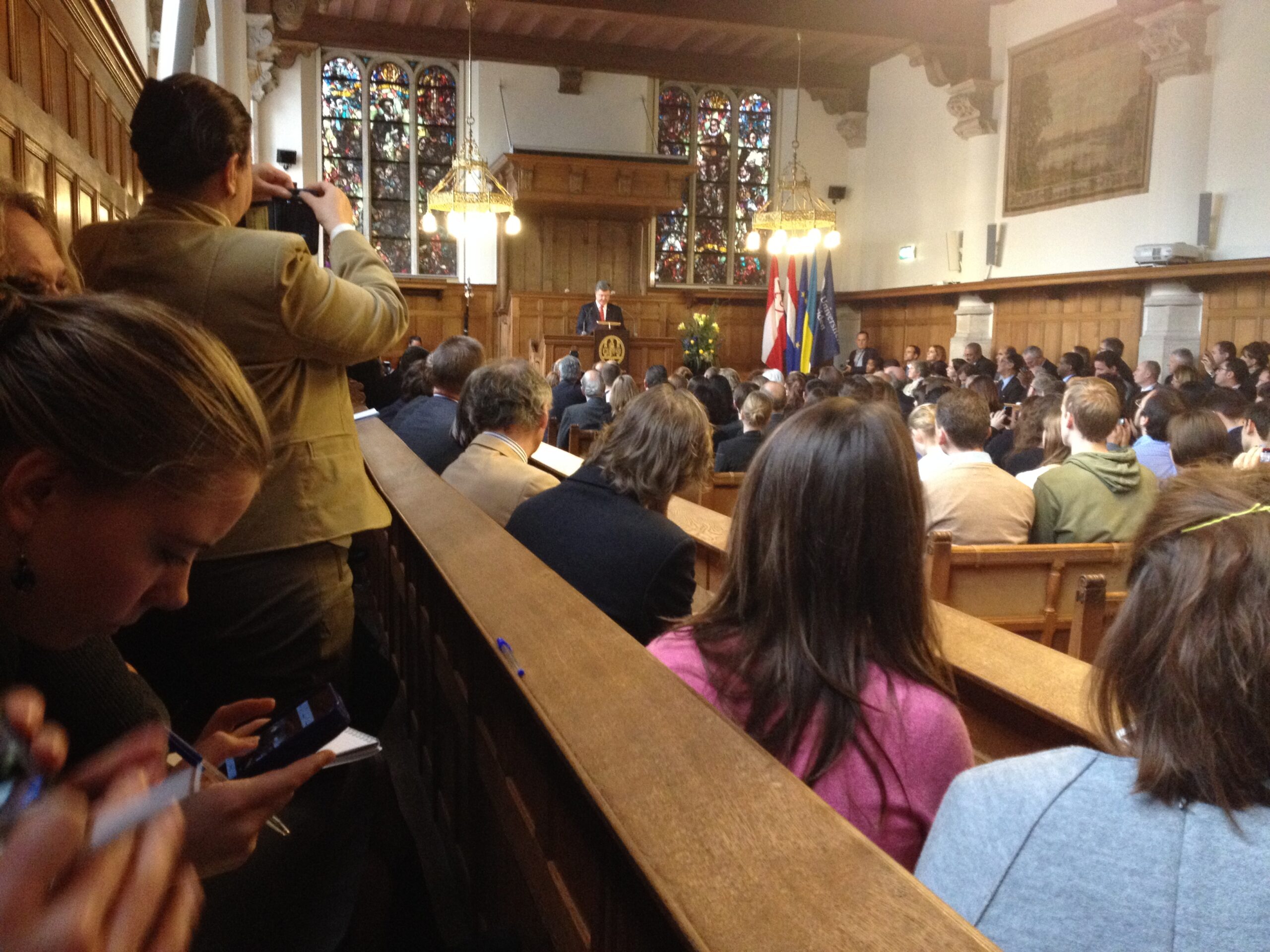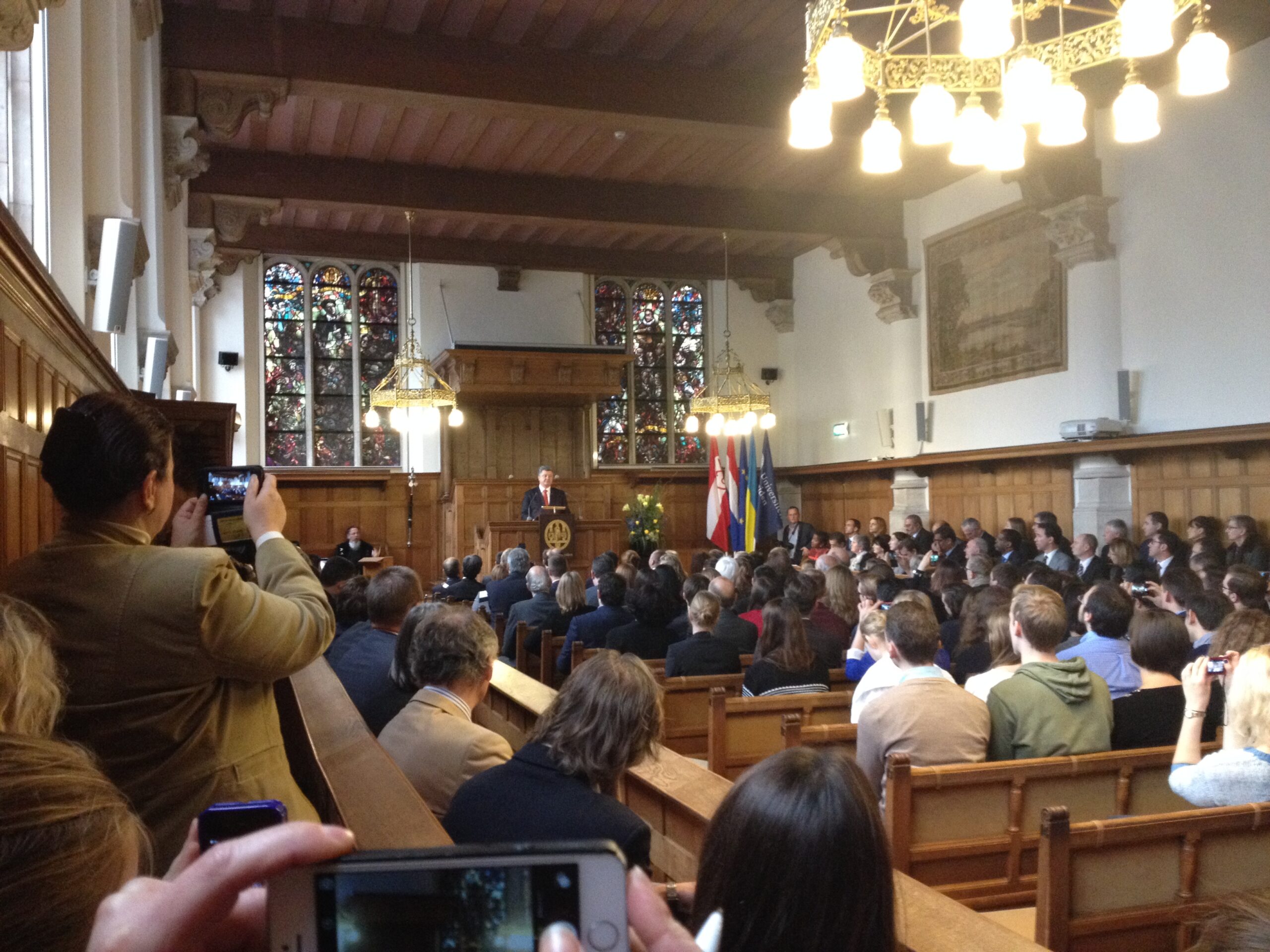 In het Groot Auditorium van de Universiteit Leiden zat ook Thierry Baudet – één van de initiatiefnemers van Geen Peil – te luisteren (en beleefd te applaudisseren na afloop). Aan hem en de zijnen maakte Poroshenko een bitter en vooral onverholen verwijt: “Veel Europeanen zijn moe en gedesillusioneerd: ‘Laat de Russen maar hebben wat ze willen’. Ze zijn lafaards.”. Voor degene die nu denkt ‘ik wil niet worden betrokken in een oorlog’; in het vragenkwartiertje maakte Poroshenko óók duidelijk dat militair ingrijpen geen oplossing is. De oplossing zal moeten komen uit een “verenigd en solidair Europa” (en dus een vrij Oekraïne). “Op de lange termijn geloof ik in Europa. Maar we moeten verenigd zijn”. Pikant is dat hij denkt “dat er zelfs in Moskou (personen) zijn die denken dat vrede mogelijk is”.