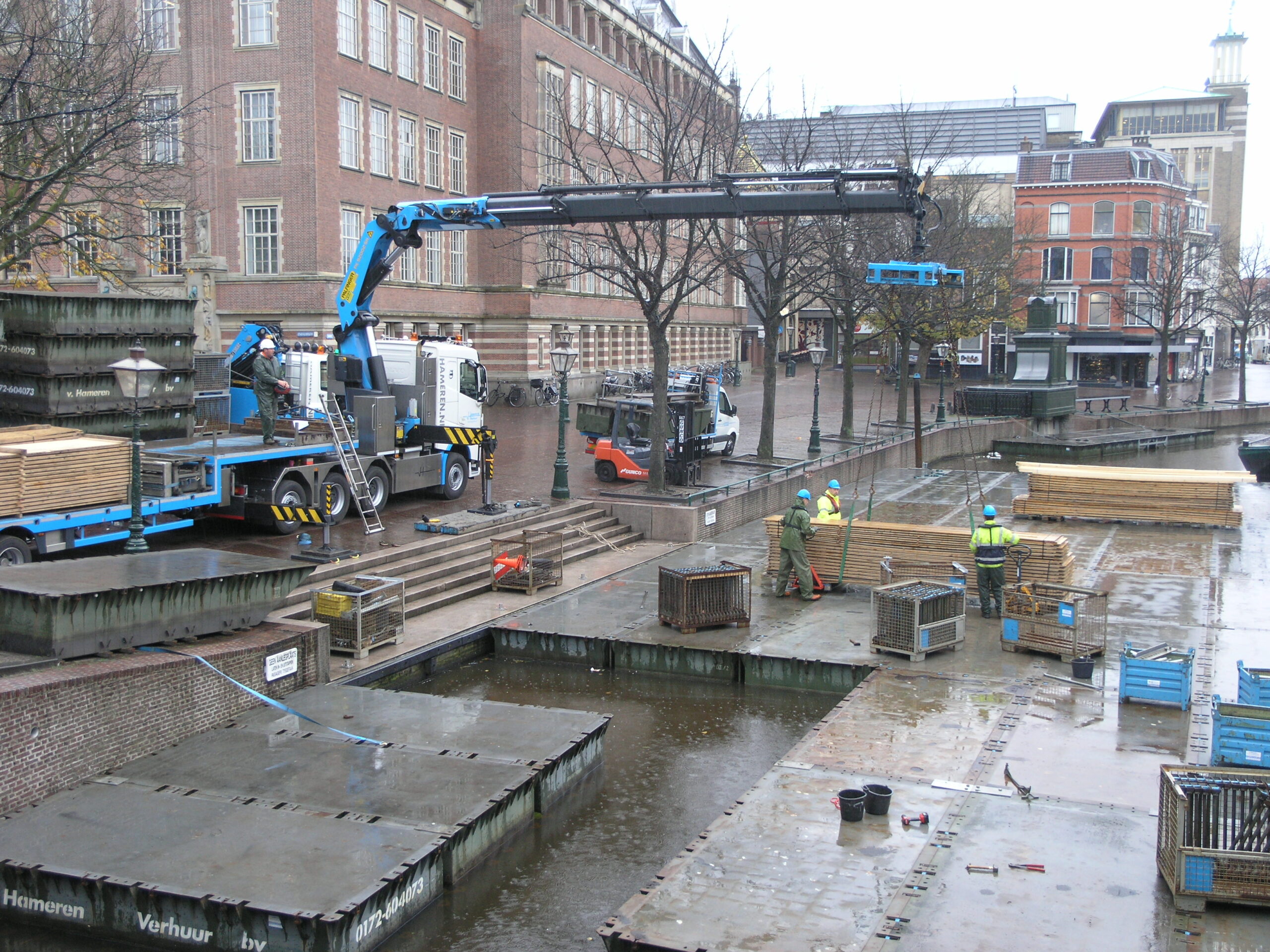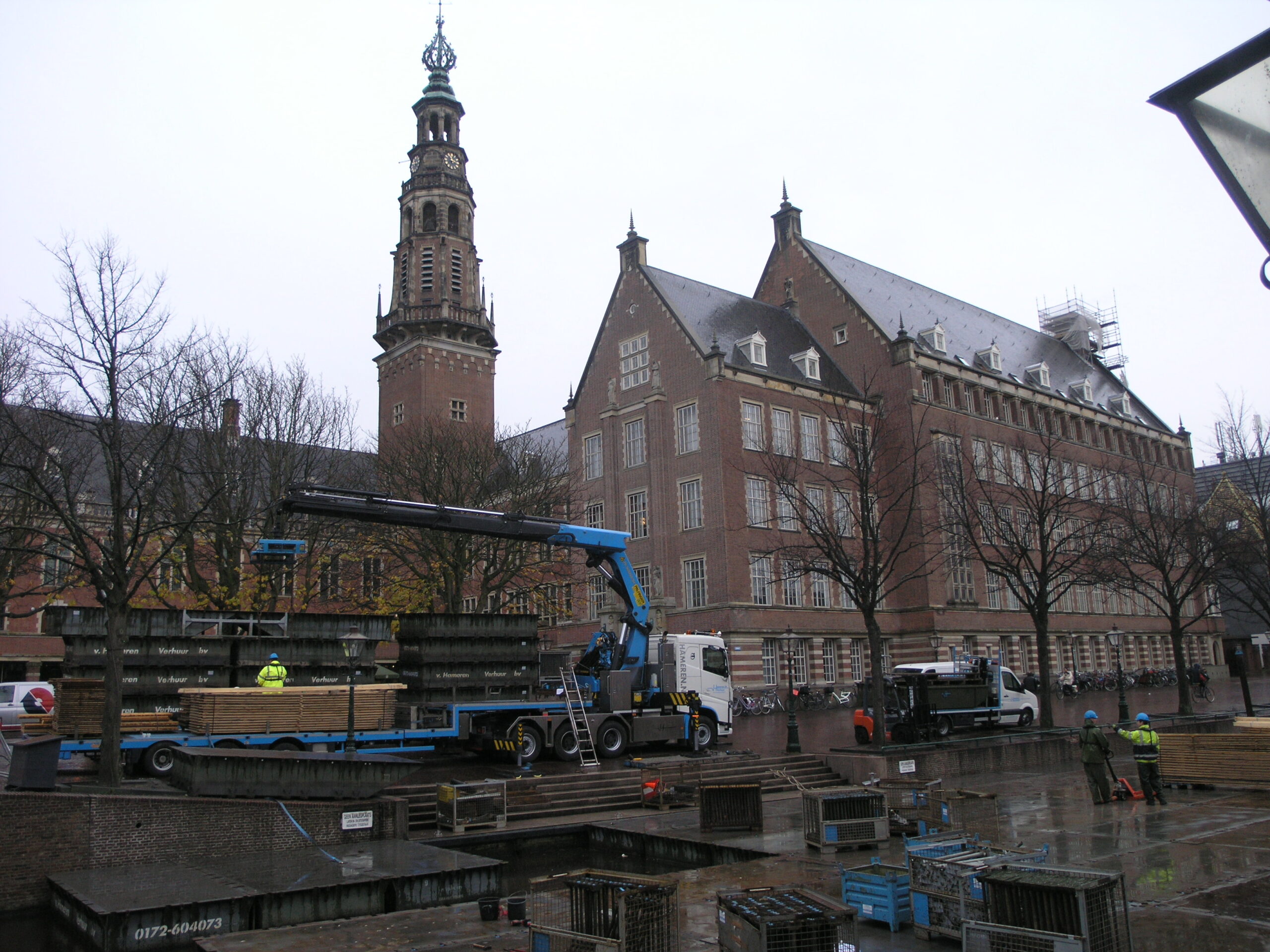 Vandaag worden de pontons voor de schaatsbaan op de Nieuwe Rijn neergelegd. De witte tenten die jaarlijks de schaatsbaan overdekken, worden morgen op de baan geplaatst. De ijsbaan wordt vrijdag om 17.00 uur geopend.
