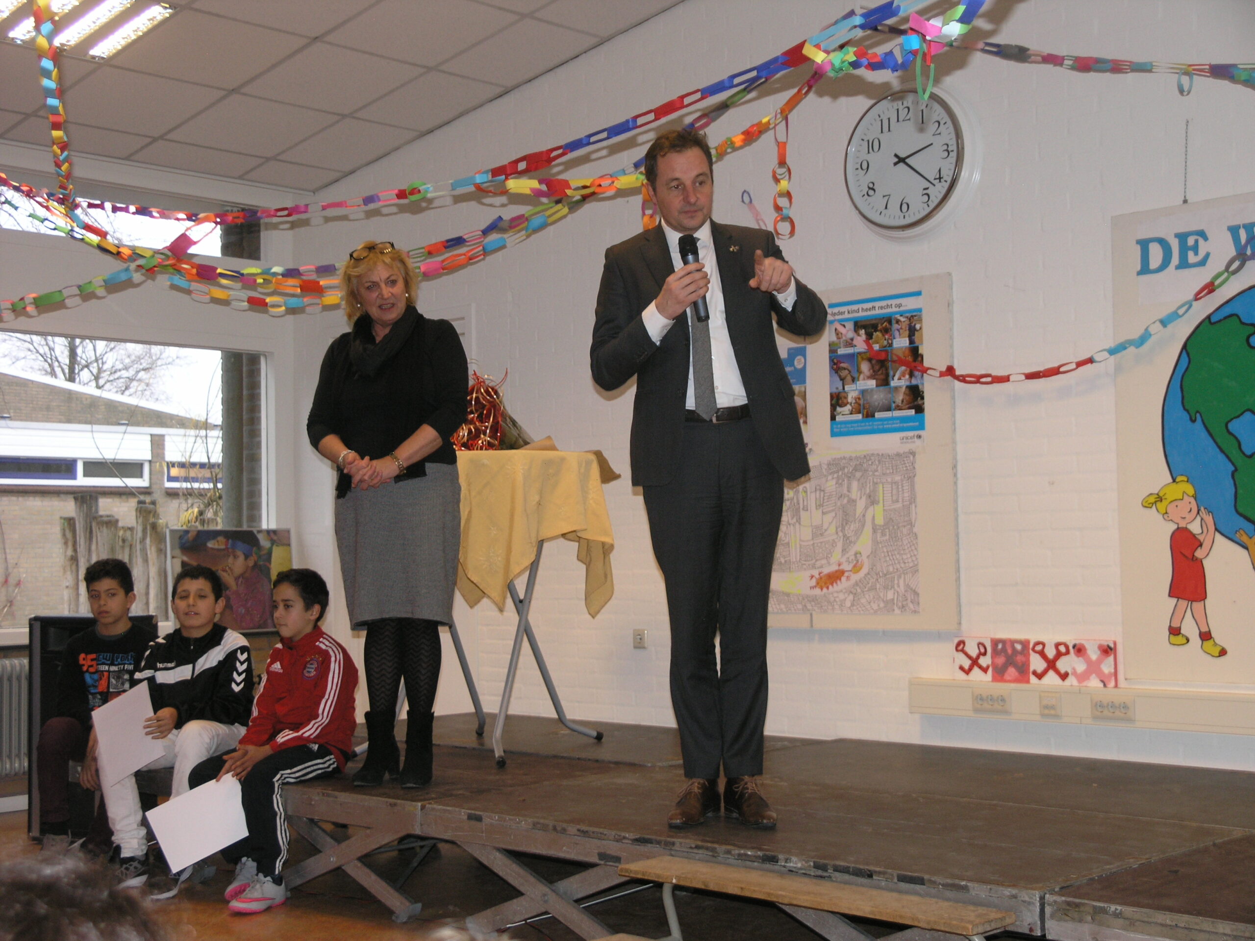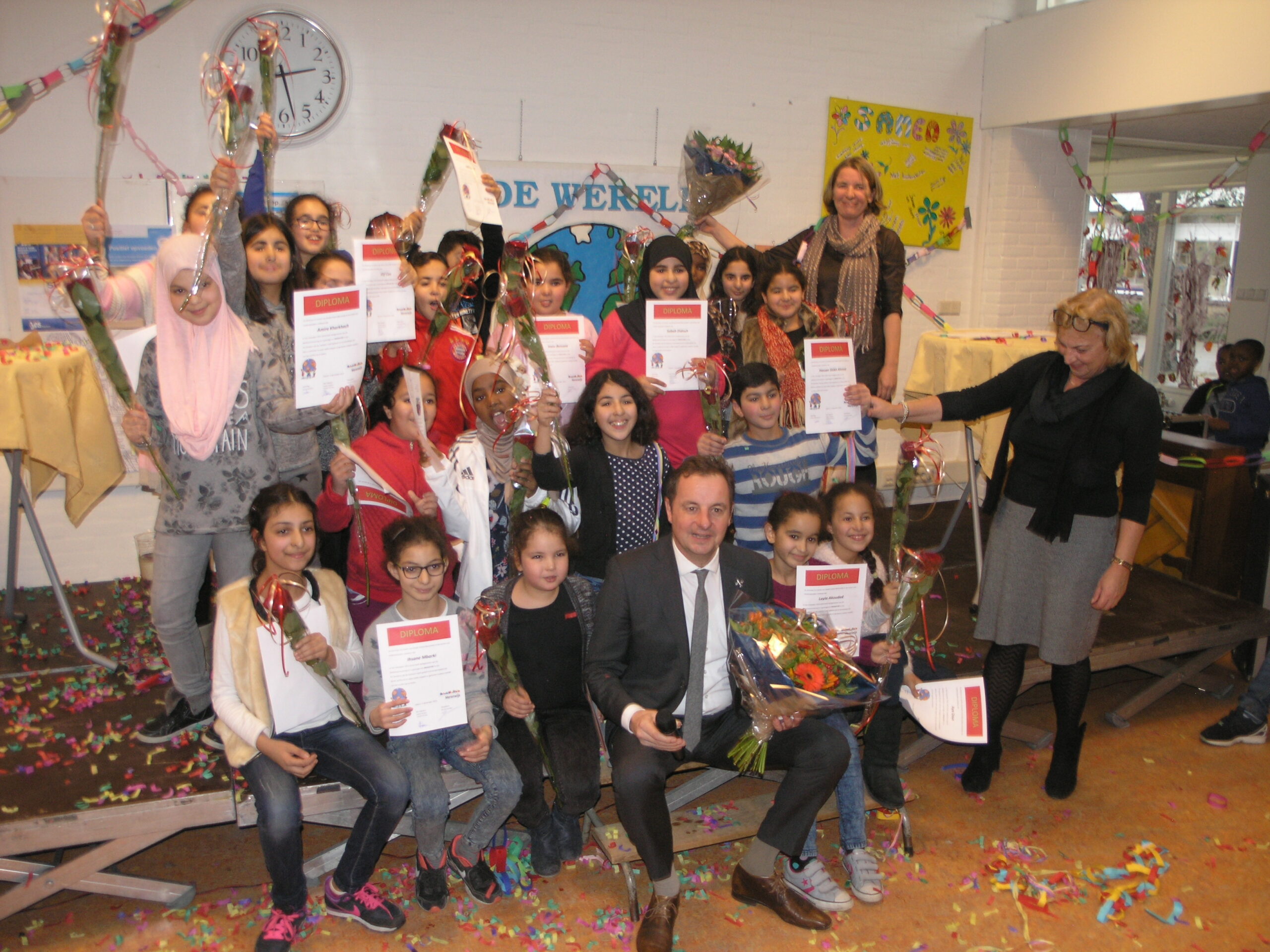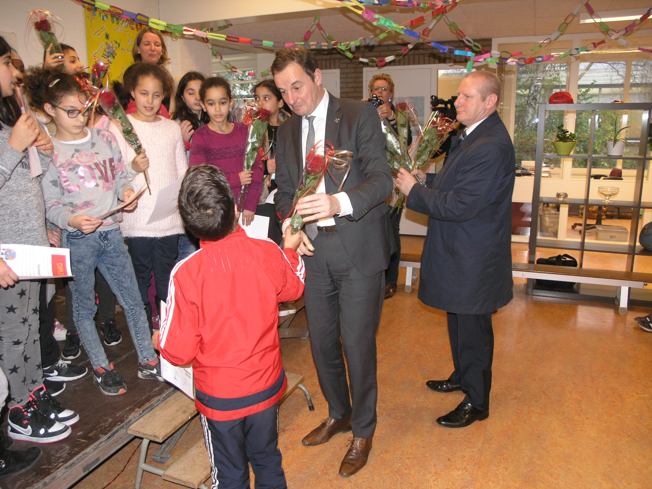 Wethouder Frank de Wit – “hulp van de burgemeester” in de belevingswereld van de kinderen – huldigde de geslaagden, “namens Burgemeester en Wethouders, namens de hele stad. Heel knap gedaan!”. Uiteraard hebben niet alle kinderen alles gehoord. Toespraken en stil zitten, zijn lastig. Ook als de directeur dat wil “op je billen zitten, je ogen hier, en je mond op slot” en, als (bijna) iedereen écht stil is: “Hier word ik blij van”. Voor de wethouder was dat echt ietsje moeilijker.