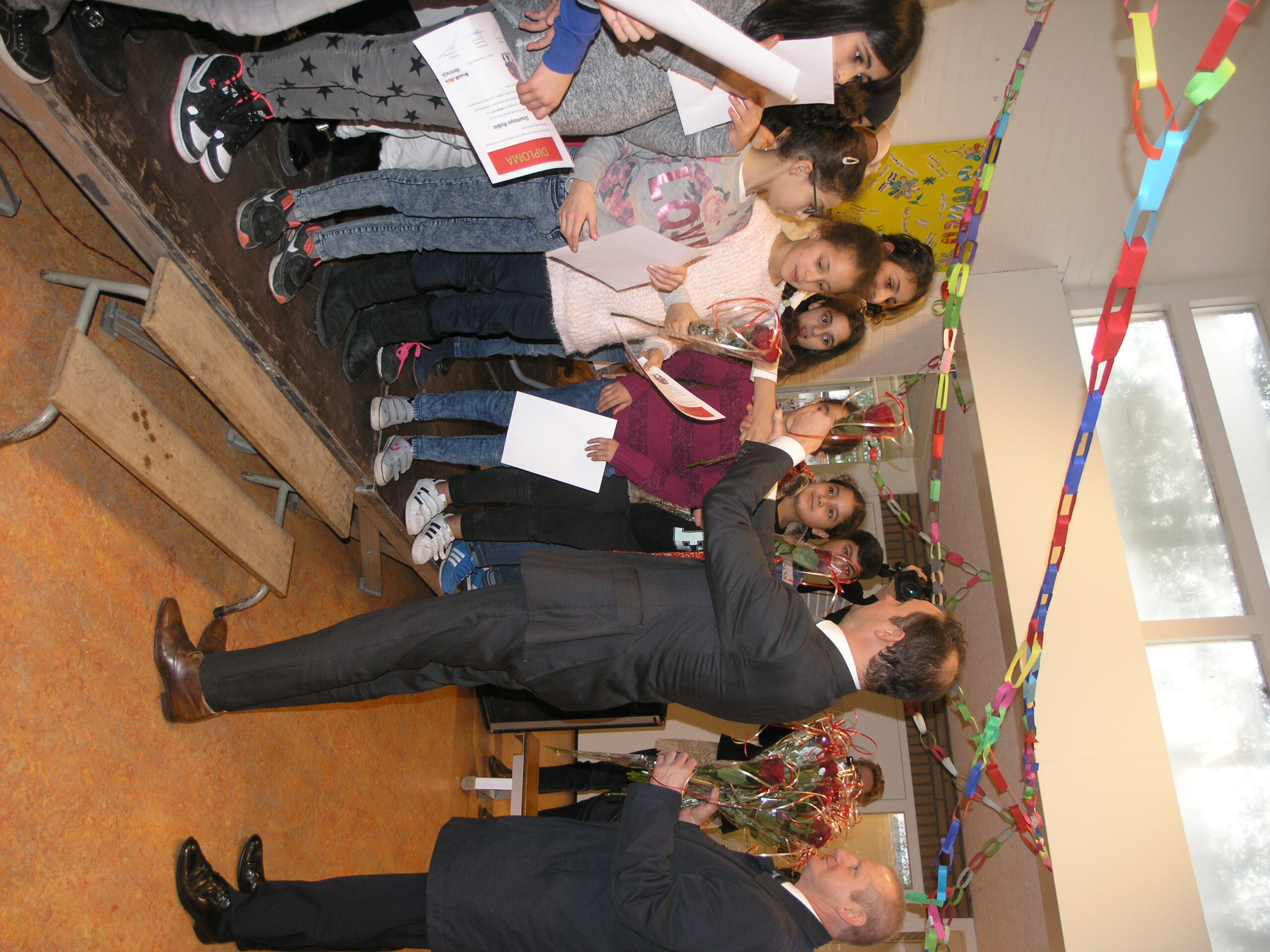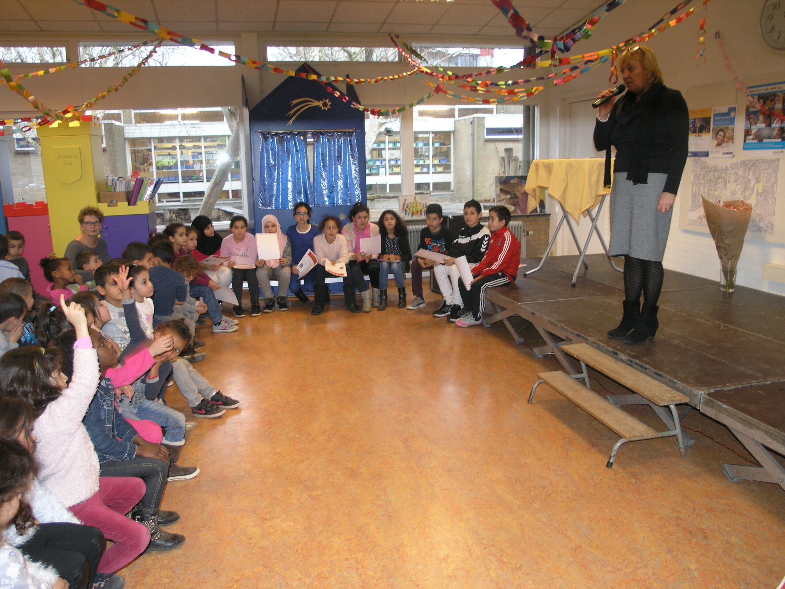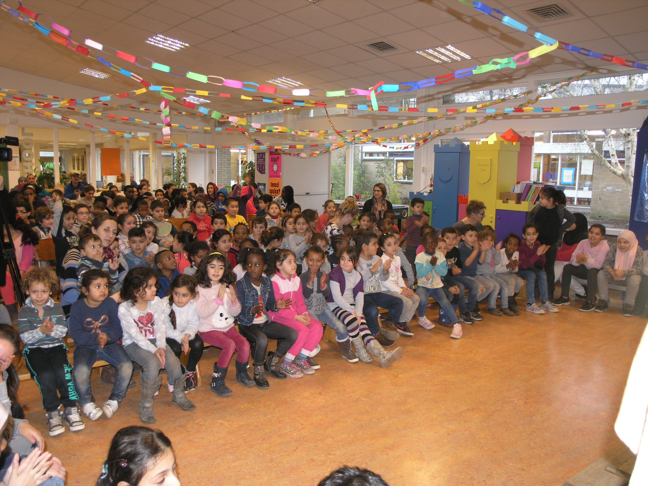 Wethouder Frank de Wit – “hulp van de burgemeester” in de belevingswereld van de kinderen – huldigde de geslaagden, “namens Burgemeester en Wethouders, namens de hele stad. Heel knap gedaan!”. Uiteraard hebben niet alle kinderen alles gehoord. Toespraken en stil zitten, zijn lastig. Ook als de directeur dat wil “op je billen zitten, je ogen hier, en je mond op slot” en, als (bijna) iedereen écht stil is: “Hier word ik blij van”. Voor de wethouder was dat echt ietsje moeilijker.