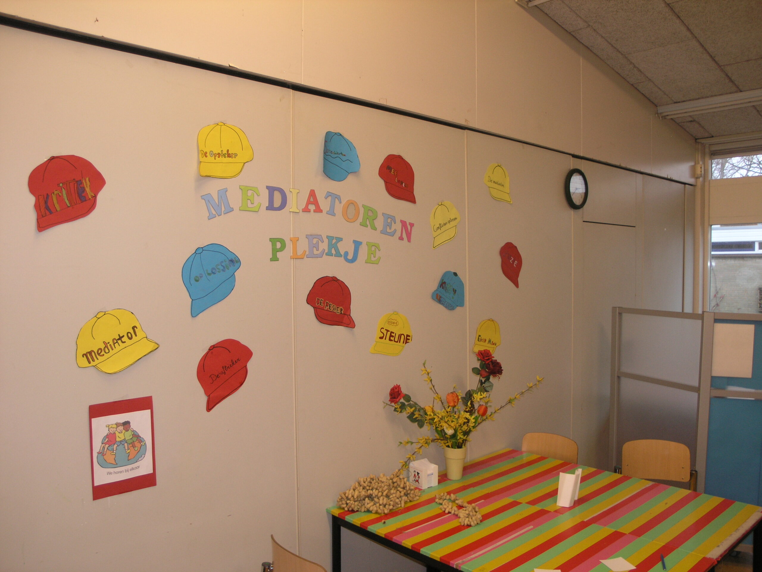 Per schooldag hebben drie bemiddelaars dienst. Ze zijn herkenbaar aan hun hesjes. Wat ze níet zijn, is politieagent. Andrea Heyboer van van het Leidse bedrijf Onderwijszaken heeft de leerlingen getraind. “In principe is een mediator reactief: een leerling moet op hén afstappen met een vraag te helpen”. In een speciale hoek op school, de mediatorplek, kun je zien welke drie die dag dienst hebben en je dus kunt aanspreken. Doordat er zoveel mediatoren zijn én de leerlingen allemaal wat ze kunnen verwachten, zijn de mediatoren geen buitenbeentjes. Ze horen er ‘gewoon’ bij.