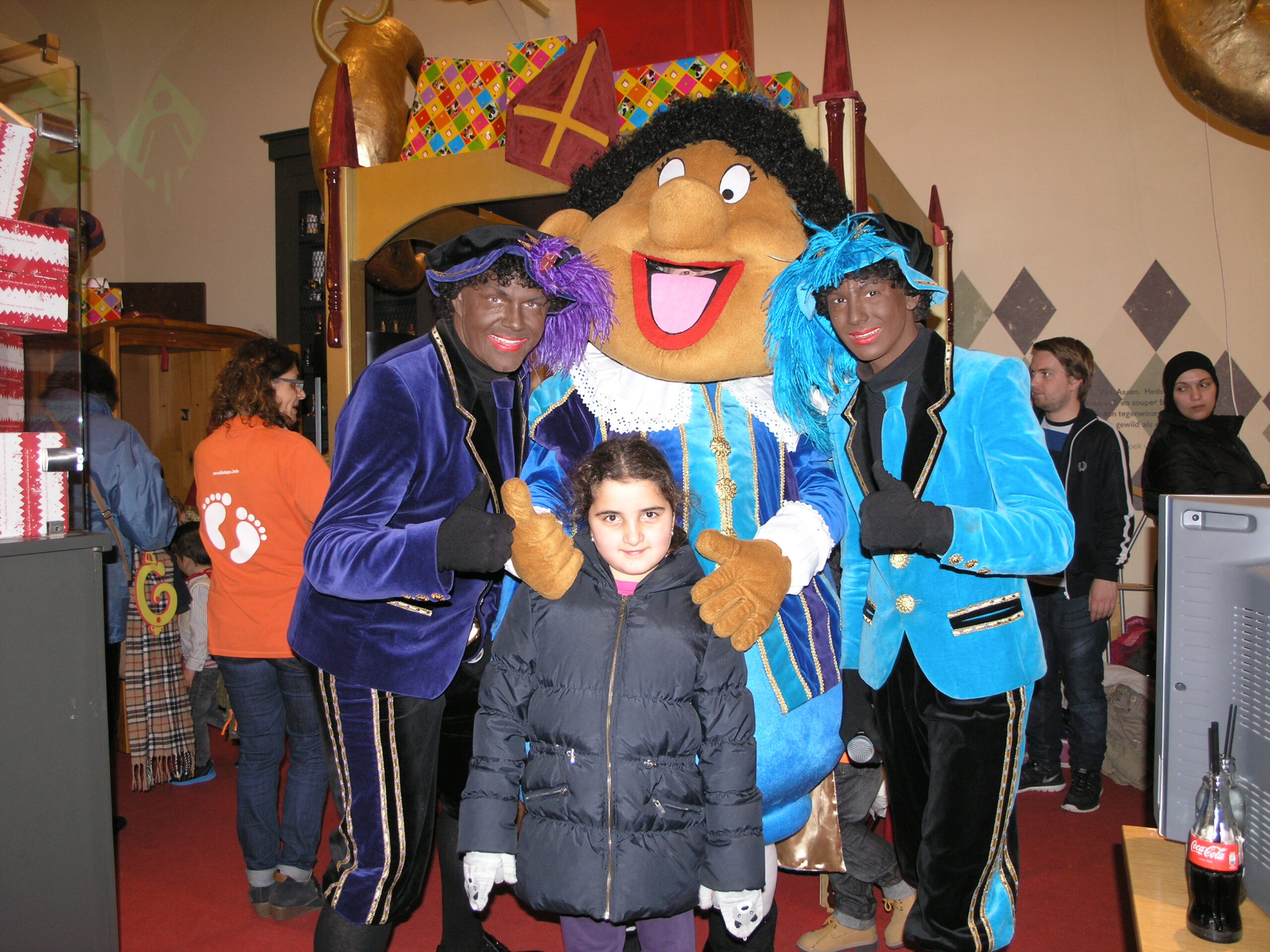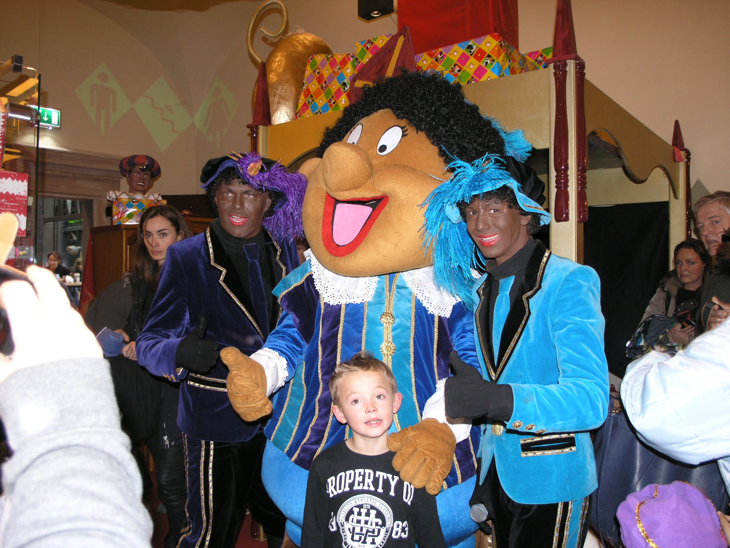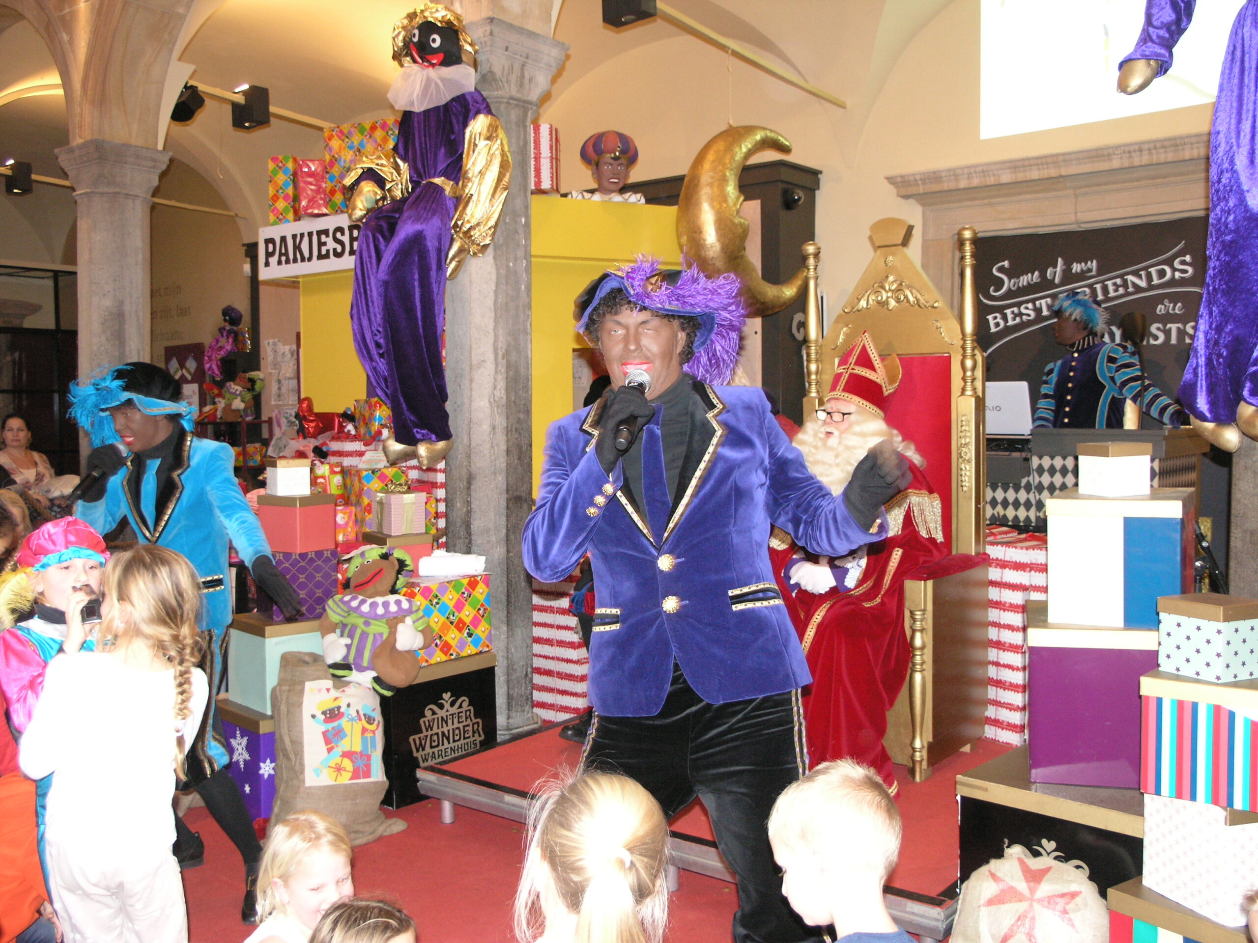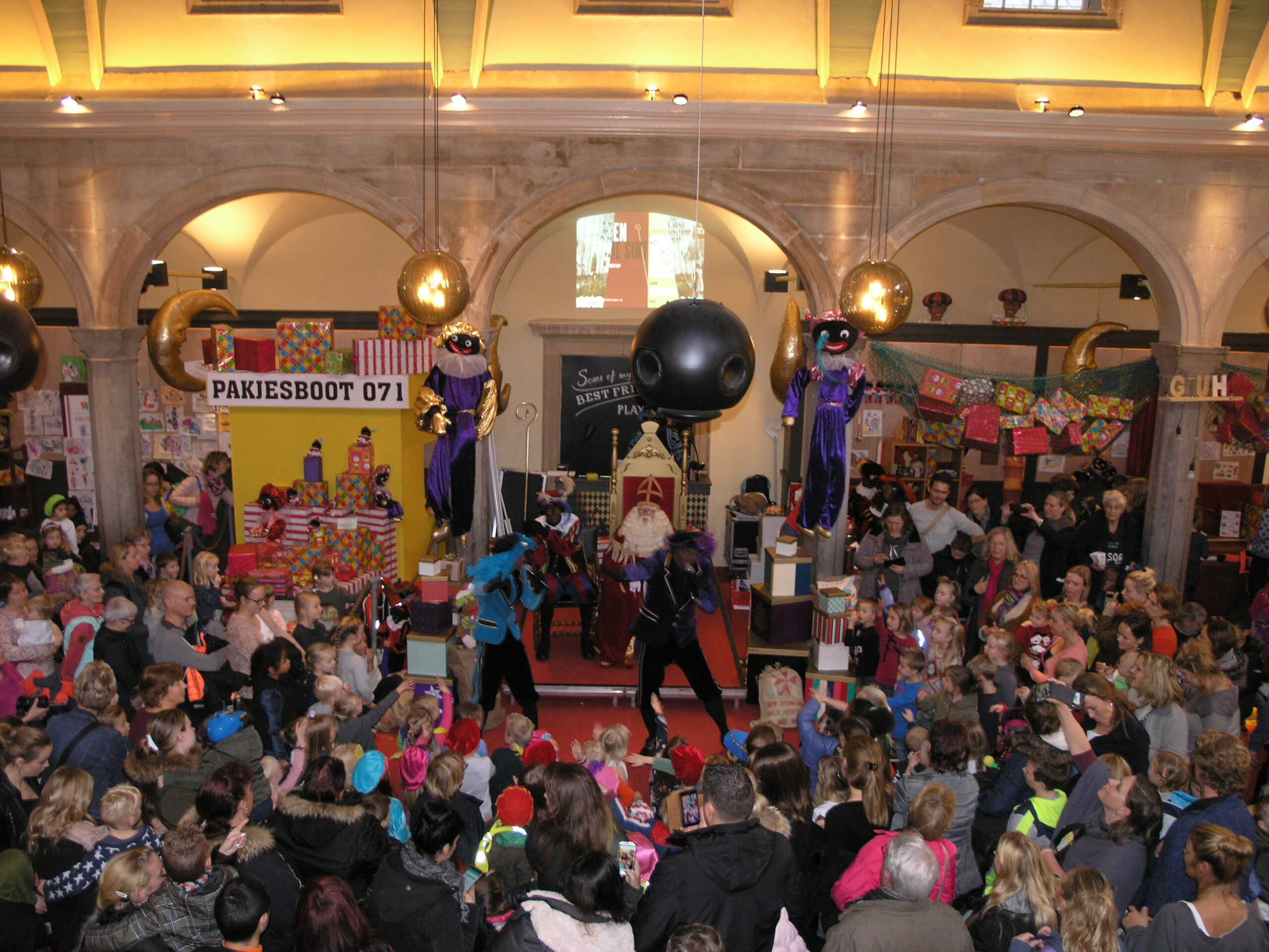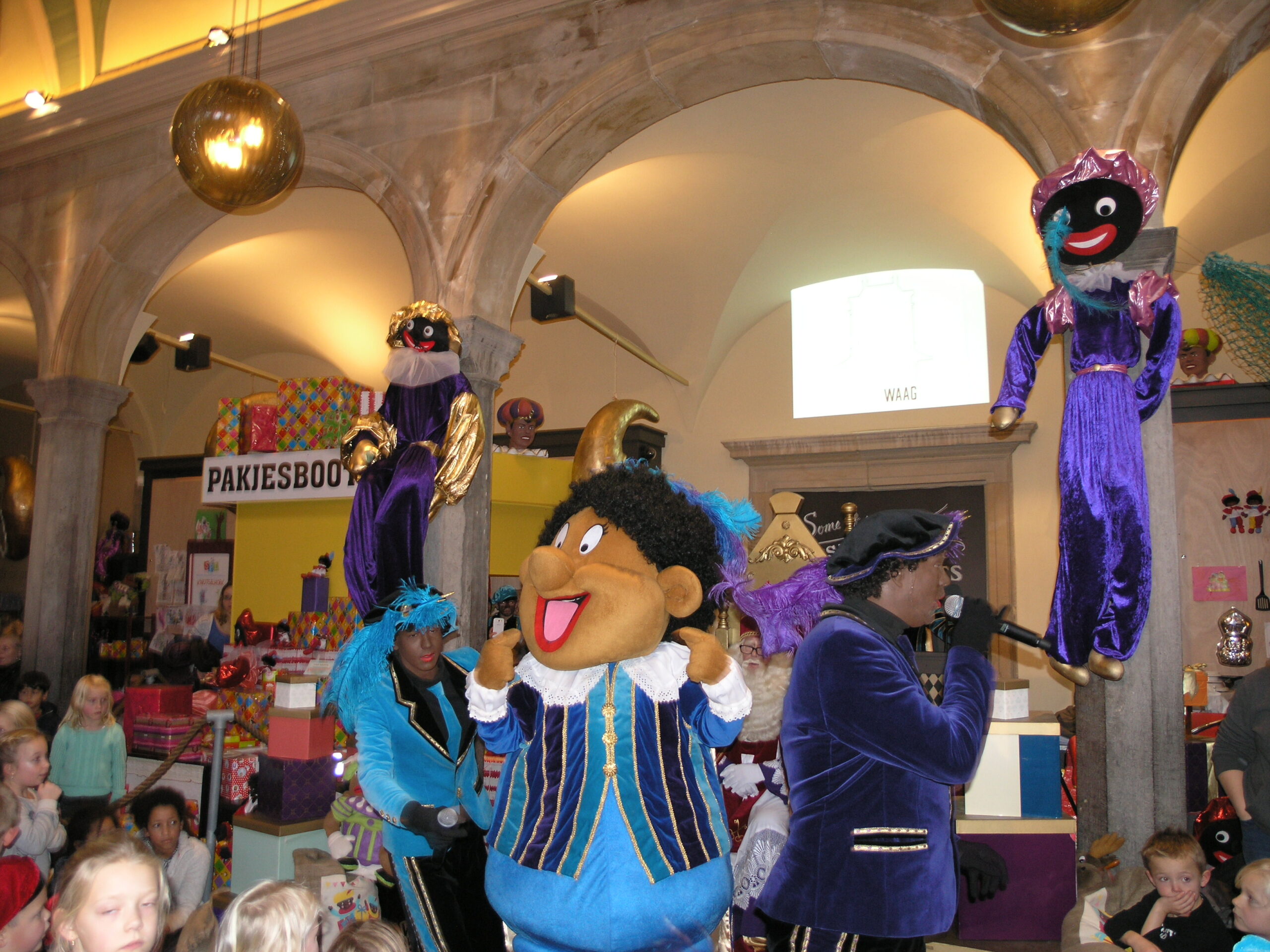 Vanmiddag stond De Waag in het teken van Knuffelpiet. Daar gaven de pieten Martino, Rayano en Knuffelpiet een optreden voor de Goedheiligman. Nog voordat het optreden begon, stond De Waag al vol met ouders en kinderen die schreeuwend het pietenduo Martino en Rayano riepen voor hun show. Niet alleen het duo stond te swingen op het podium. Ook Knuffelpiet danste samen met de pieten op moderne sinterklaasliedjes.