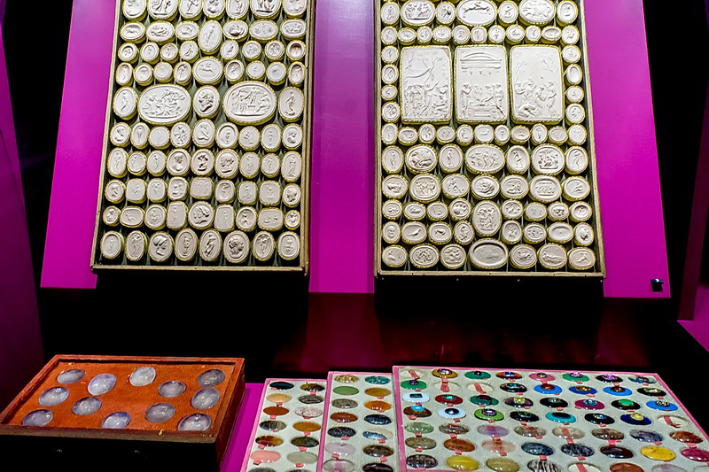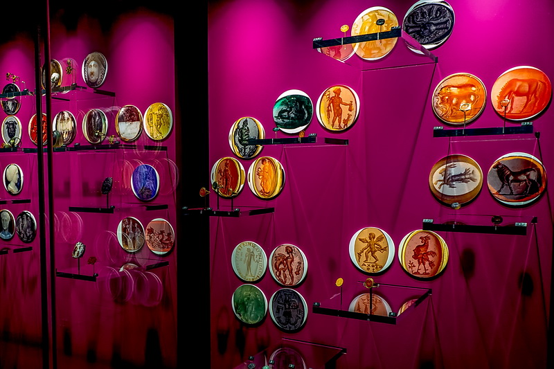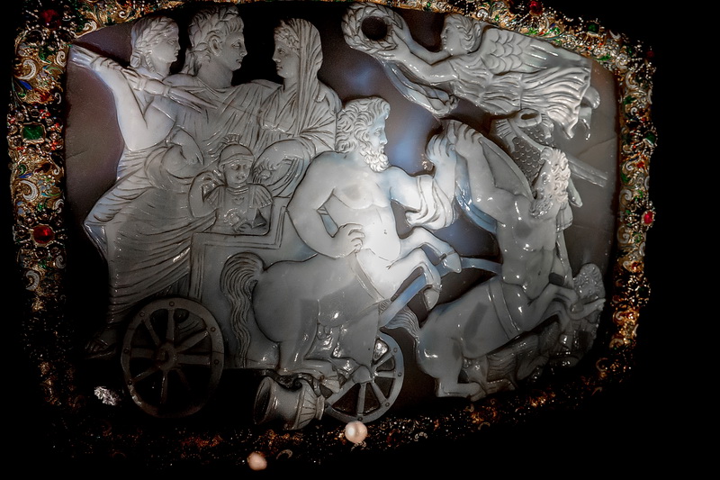 Hoe belangrijk achtergrondkennis is, realiseer je je misschien nog het meest bij de tentoonstelling Pracht en Precisie, over de camee. Dat zijn stenen waarin een tafereel is uitgesneden, vaak heel klein tot zéér klein (de grootte van een luciferkop). Maar ook een enkele exorbitant rijk versierde. Het is niet het gepriegel aan de miniaturen die bewondering afdwingt, maar ook de wetenschap dat één klein tikje verkeerd zo’n steen kan vernielen. Of de wetenschap dat de kleuren in de grotere stenen alleen mogelijk zijn door die stenen met de juiste kleurlagen uit de natuur te halen. Meer dan indrukwekkend vakmanschap. Waarover overigens zowaar ook enkel moderne kunstenaars beschikken.