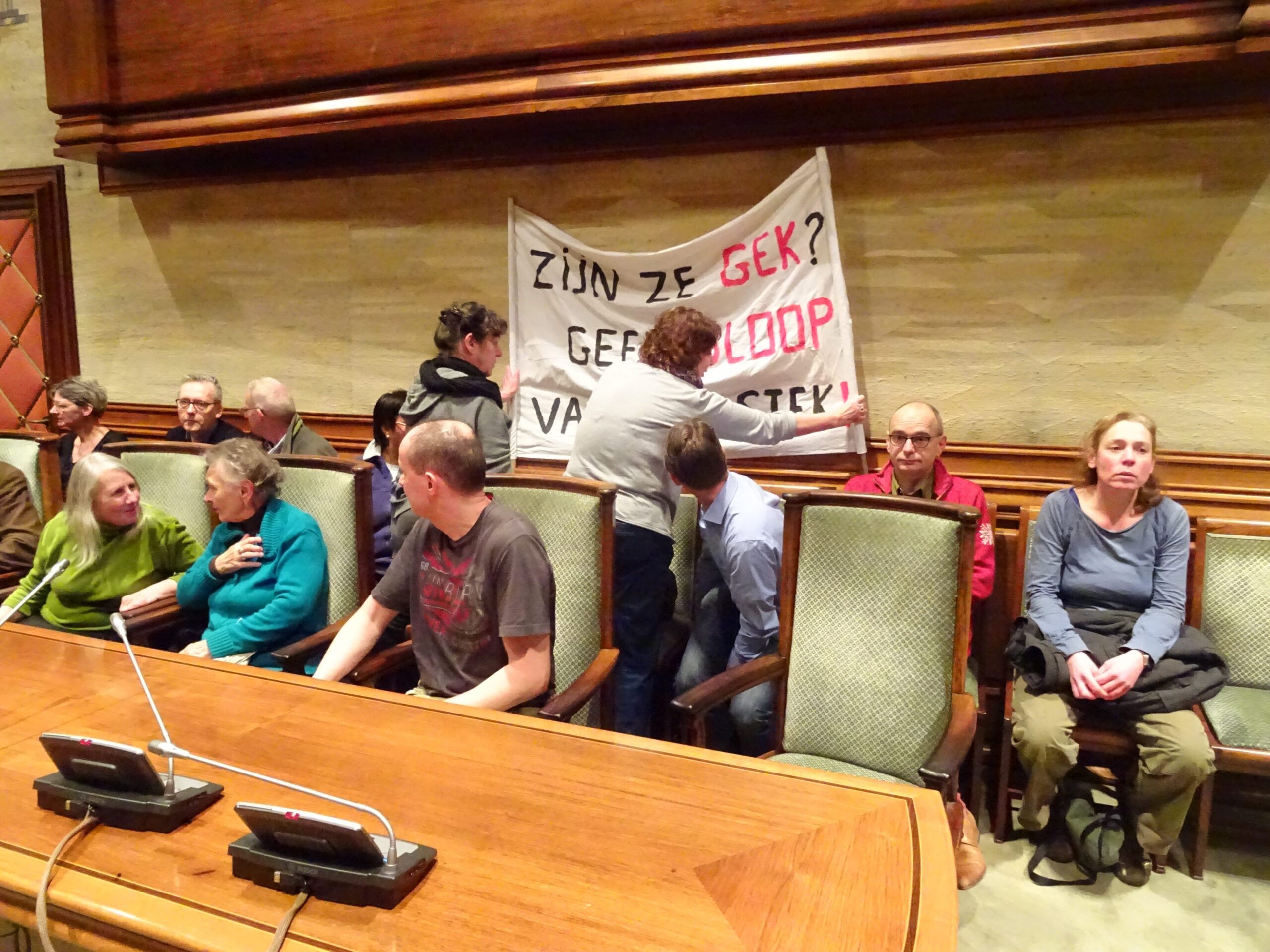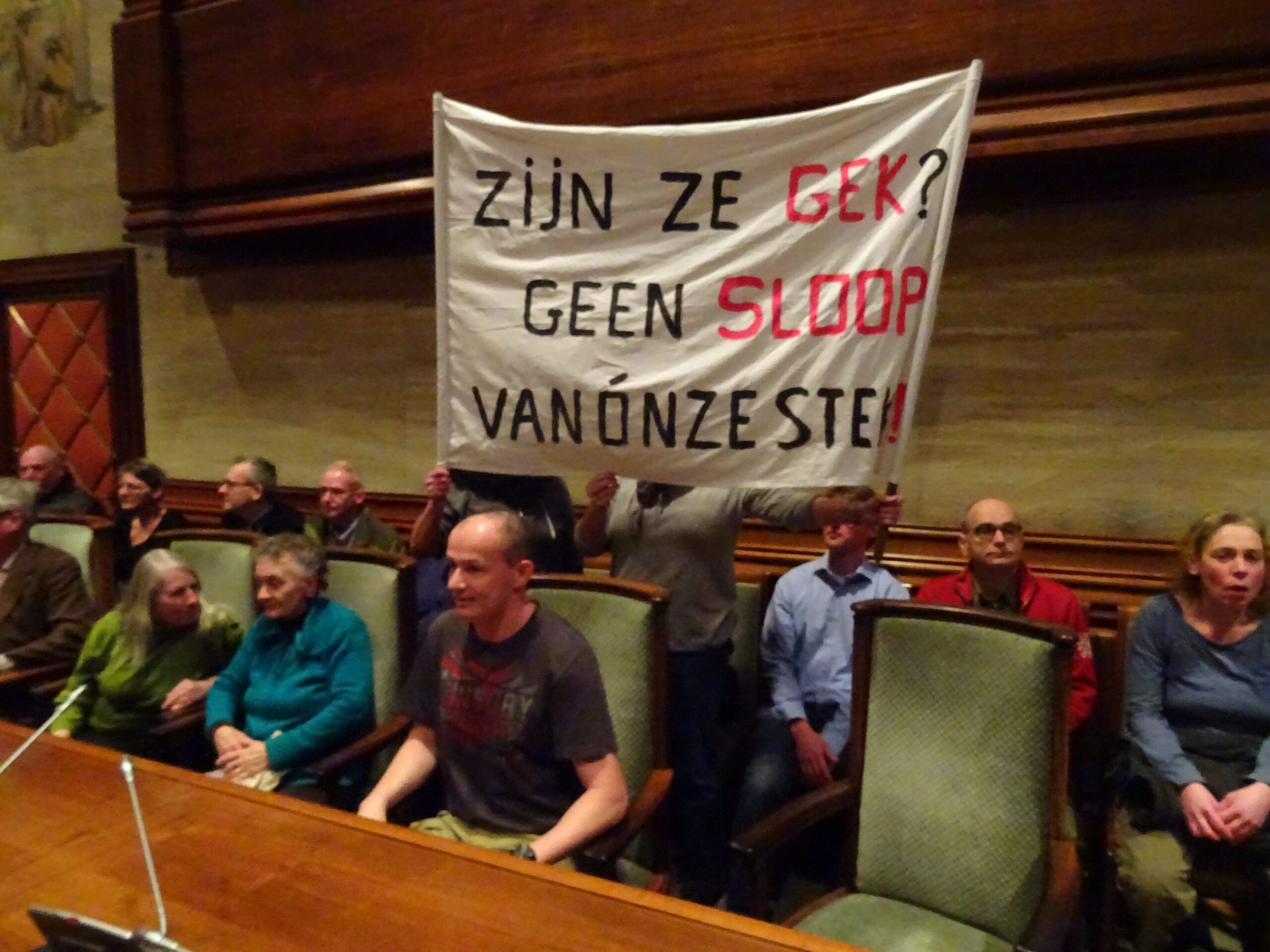 ‘Zijn ze gek? Geen sloop van onze stek!’ staat te lezen op een meegedragen spandoek. In de voorkeursvariant van de universiteit worden 58 sociale huurwoningen gesloopt. De bewoners dringen aan op een variant waarbij de woningen behouden kunnen blijven.