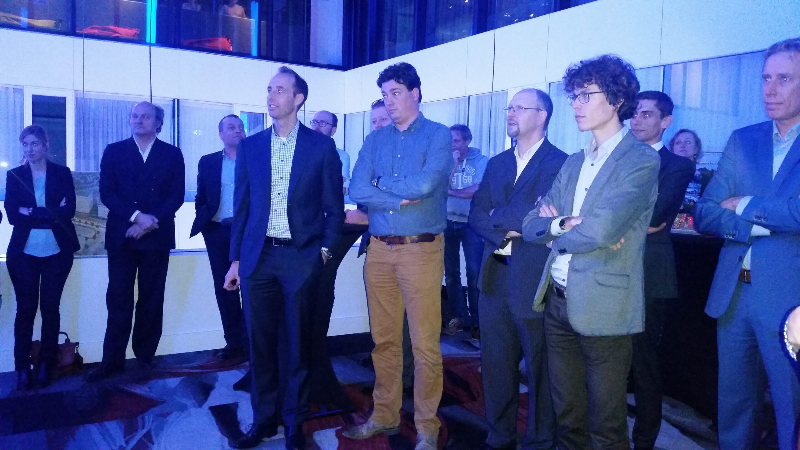 Vertegenwoordigers van de vier betrokken partijen onthullen het bouwbord met daarop het definitief ontwerp van De Lorentz. Van links naar rechts Theo Rook (Van Wijnen), Paul Laudy (wethouder Bouw), Wilem-Jan Neutelings (architect) en Rob Vester (Syntrus Achmea). (Foto: Hielco Kuipers).
