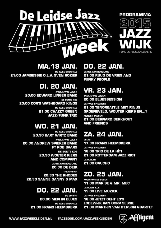 Op maandag 18 januari wordt de Leidse Jazzweek geopend in café De Twee Spieghels. Om 19.30 uur vindt er een workshop plaats en vervolgens vindt eer een jamsessie plaats. Op dinsdag 19 januari wordt het eerste officiële optreden verzorgd door ‘De Nieuwe Band van Wouter Kiers’. Tijdens de dagen daarna zijn er optredens in onder andere de de Uyl van Hoogland, The Church en de Burcht.