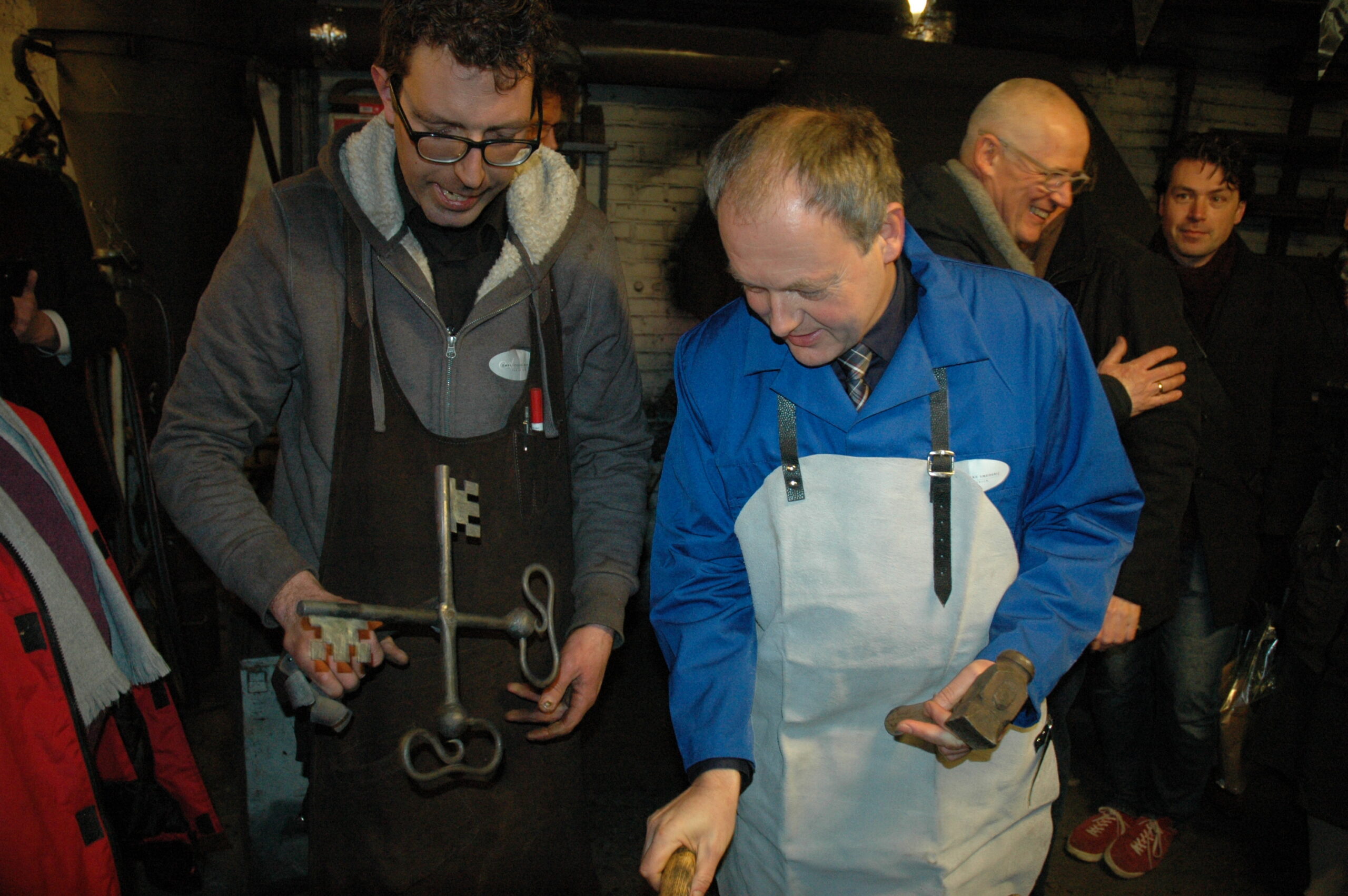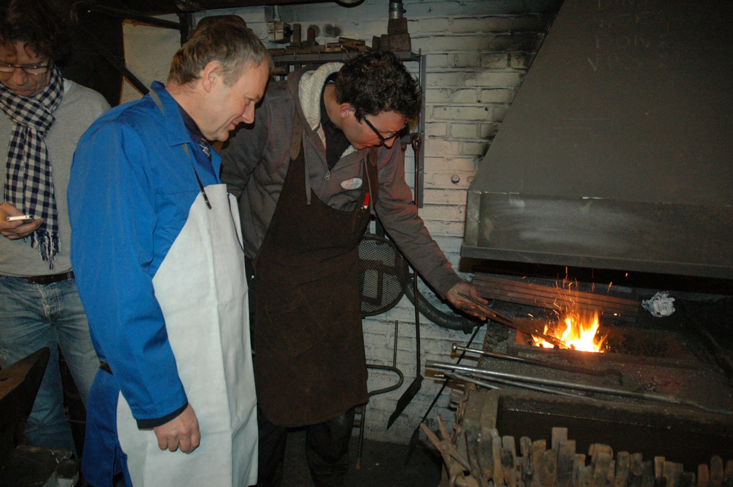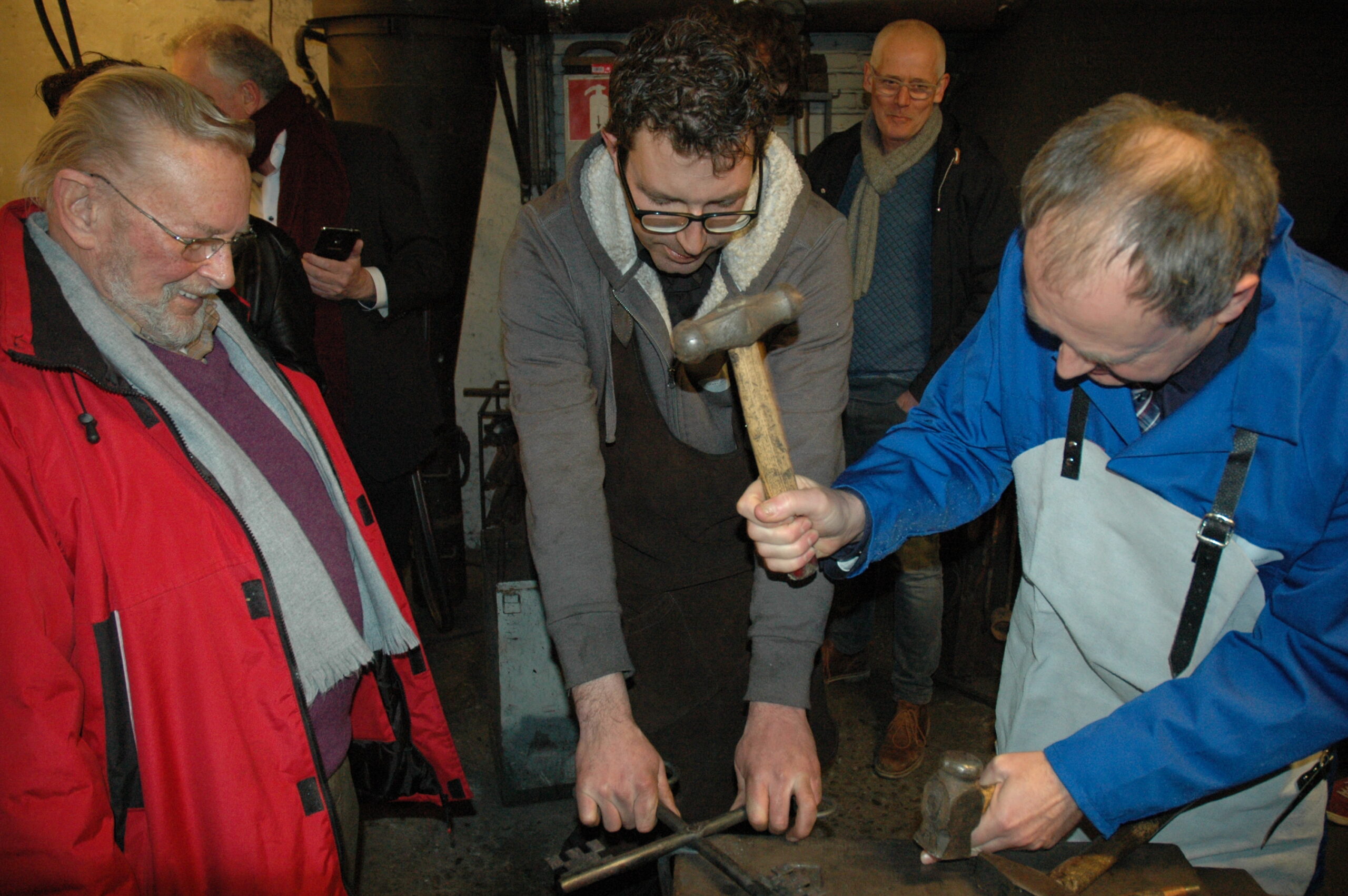 Het smidsvuur brandt weer binnen de singels. In Smederij van de Geijn aan de Oude Varkenmarkt is Martijn van den Berg sinds de jaarwisseling aan het werk. Vrijdag was de officiële opening. Die werd verricht door smidszoon Henri Lenferink.