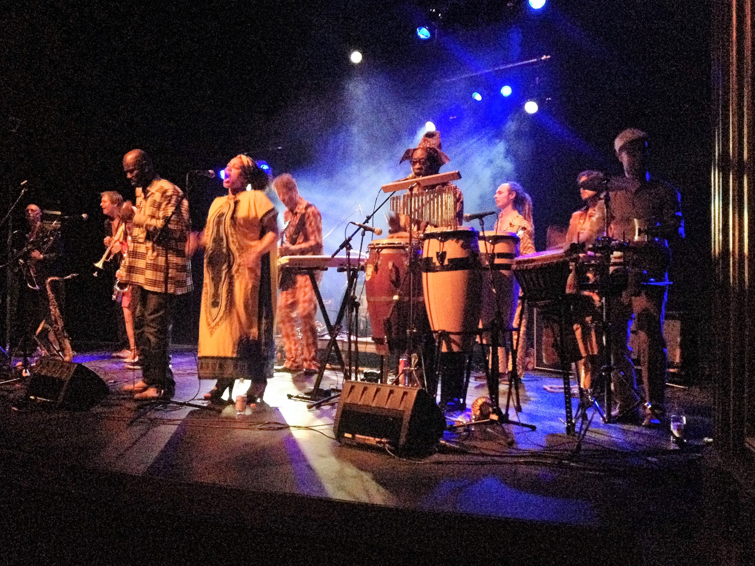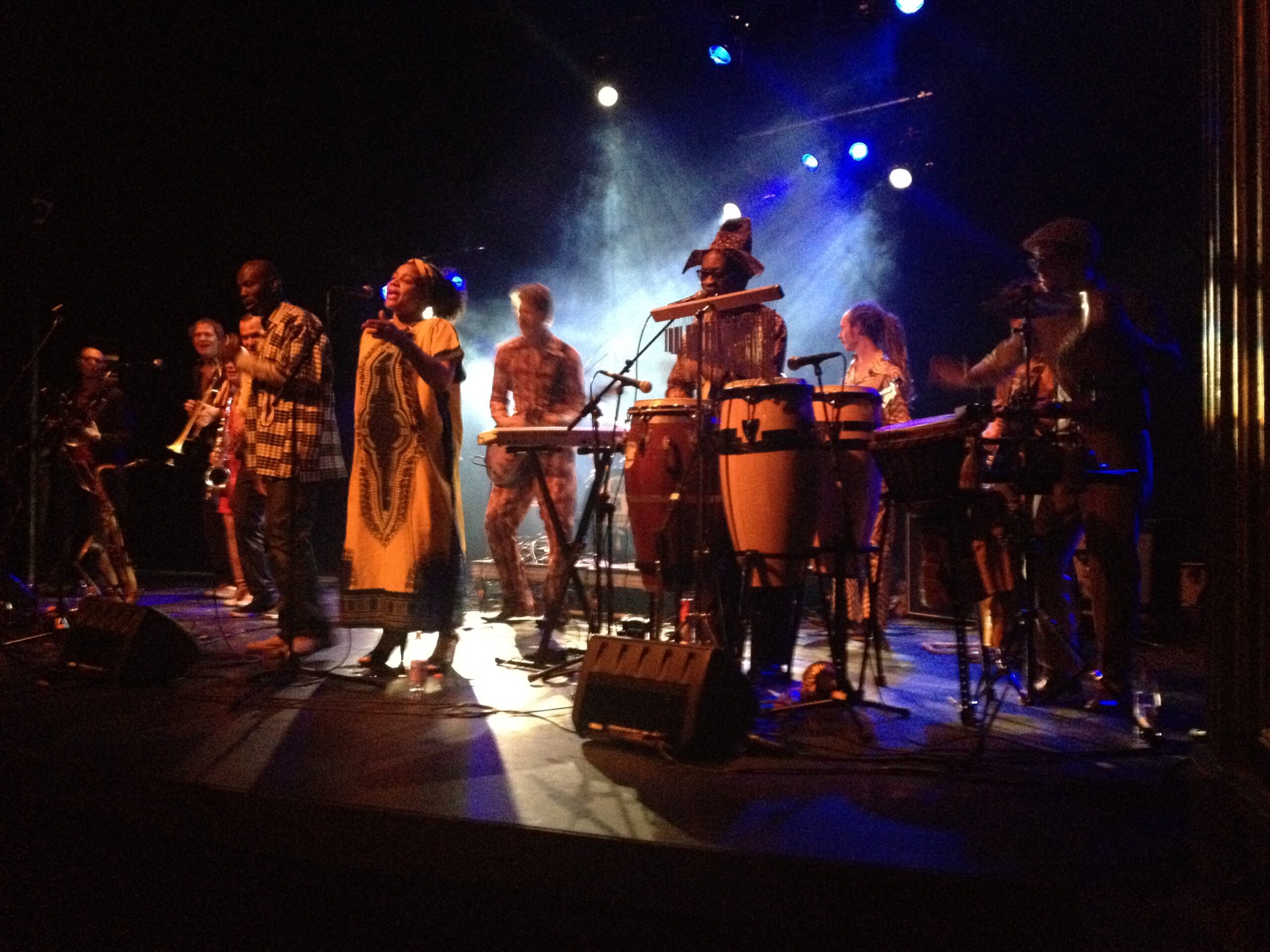 Waar Urvanovic zondagavond weer met de boot terug moet – de studie van enkele bandleden wacht – heeft Liquid Sun Orchestra het een stuk gemakkelijker. Leiden is hun thuisbasis. Met woest aanstekelijke African/Caribean/Jazz-beat sleurde de band de toeschouwers uit de stoelen. Onontkoombaar deed de muziek al snel de veel mensen meewiebelen in hun stoel om te eindigen in een feestzaalsfeer, swingend als een … .