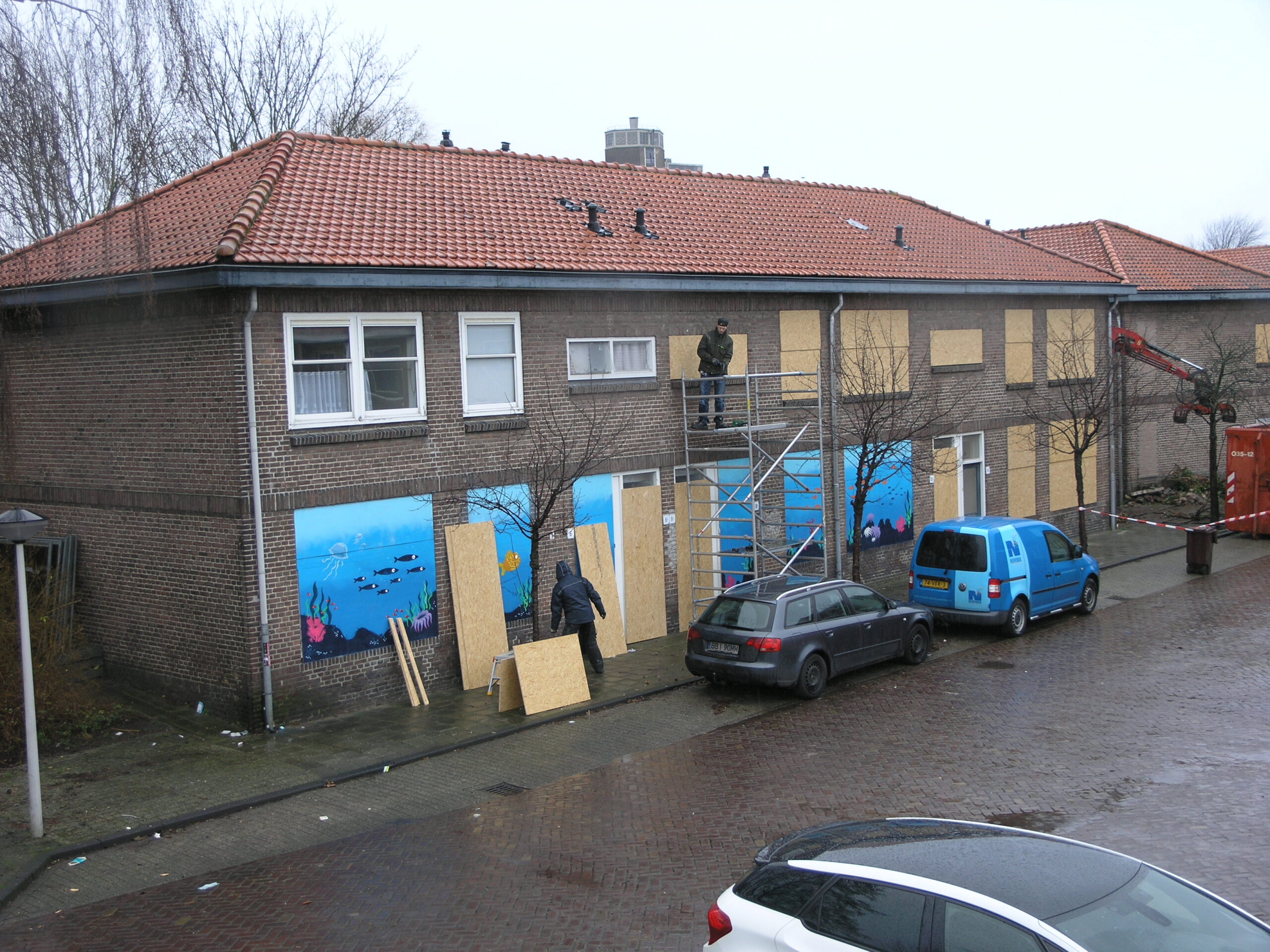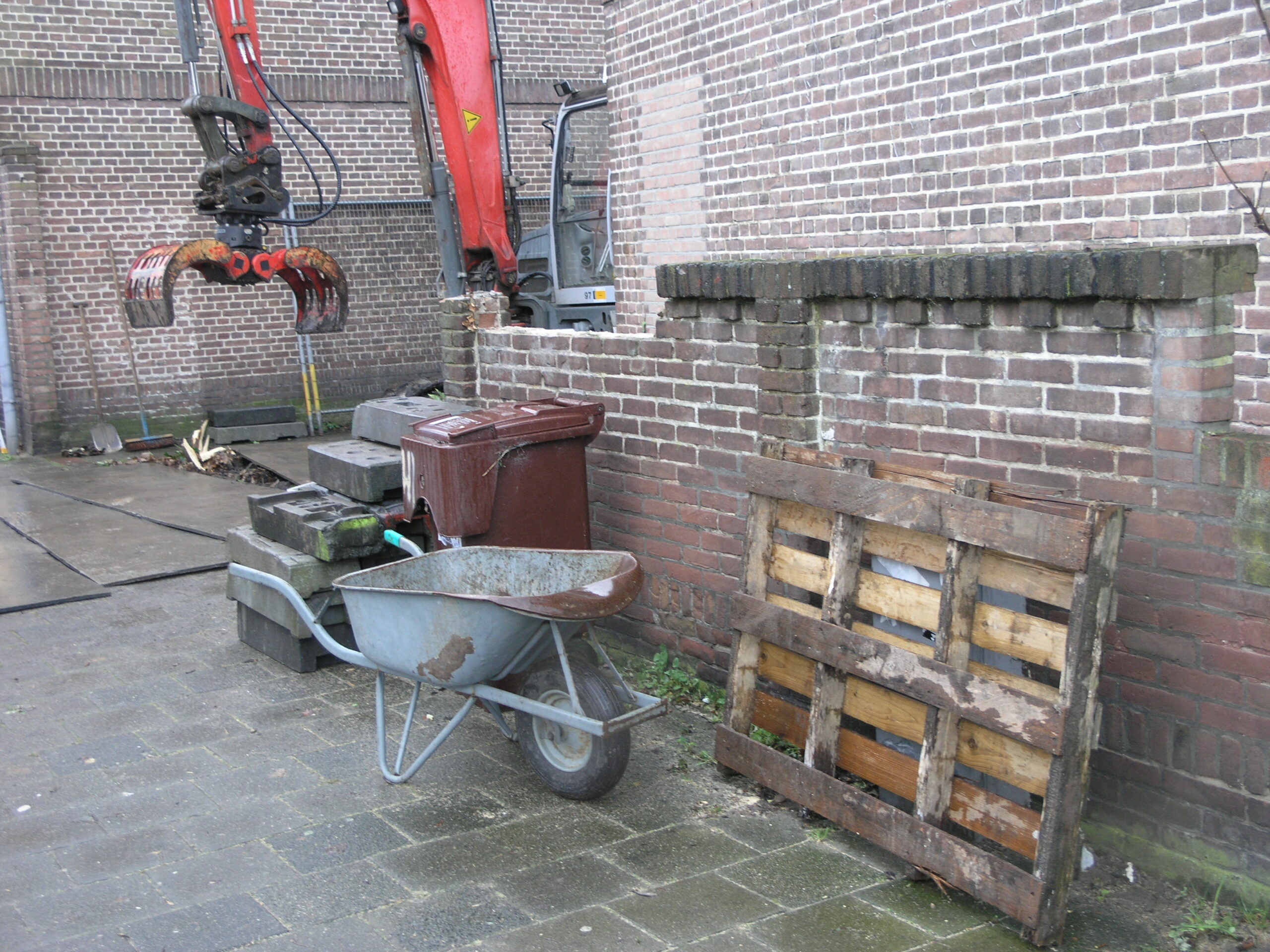 Om het terrein tussen de huizen (waar het groen verwijderd wordt) met een graafmachine te kunnen bereiken, moest een muurtje aan de Van Speykstraat alvast gesloopt worden. Wanneer de werkzaamheden klaar zijn, wordt deze bres in de muur afgesloten met een metalen hekwerk. Bij het ruimen van het groen werd een aantal kleine bomen omgezaagd.