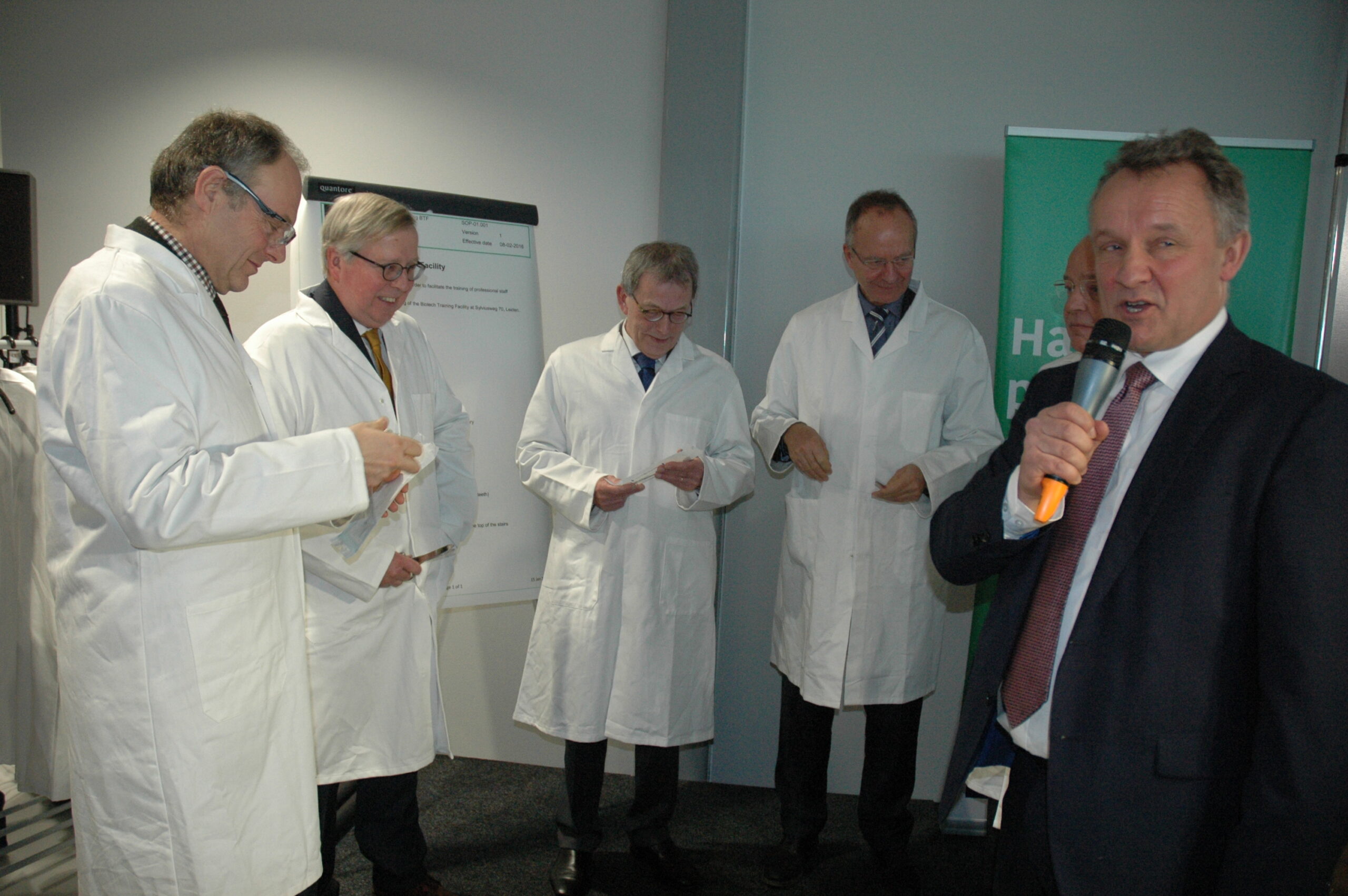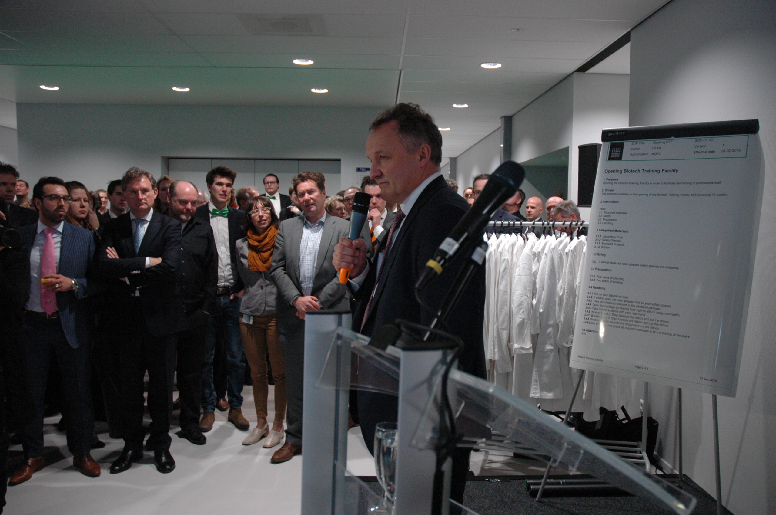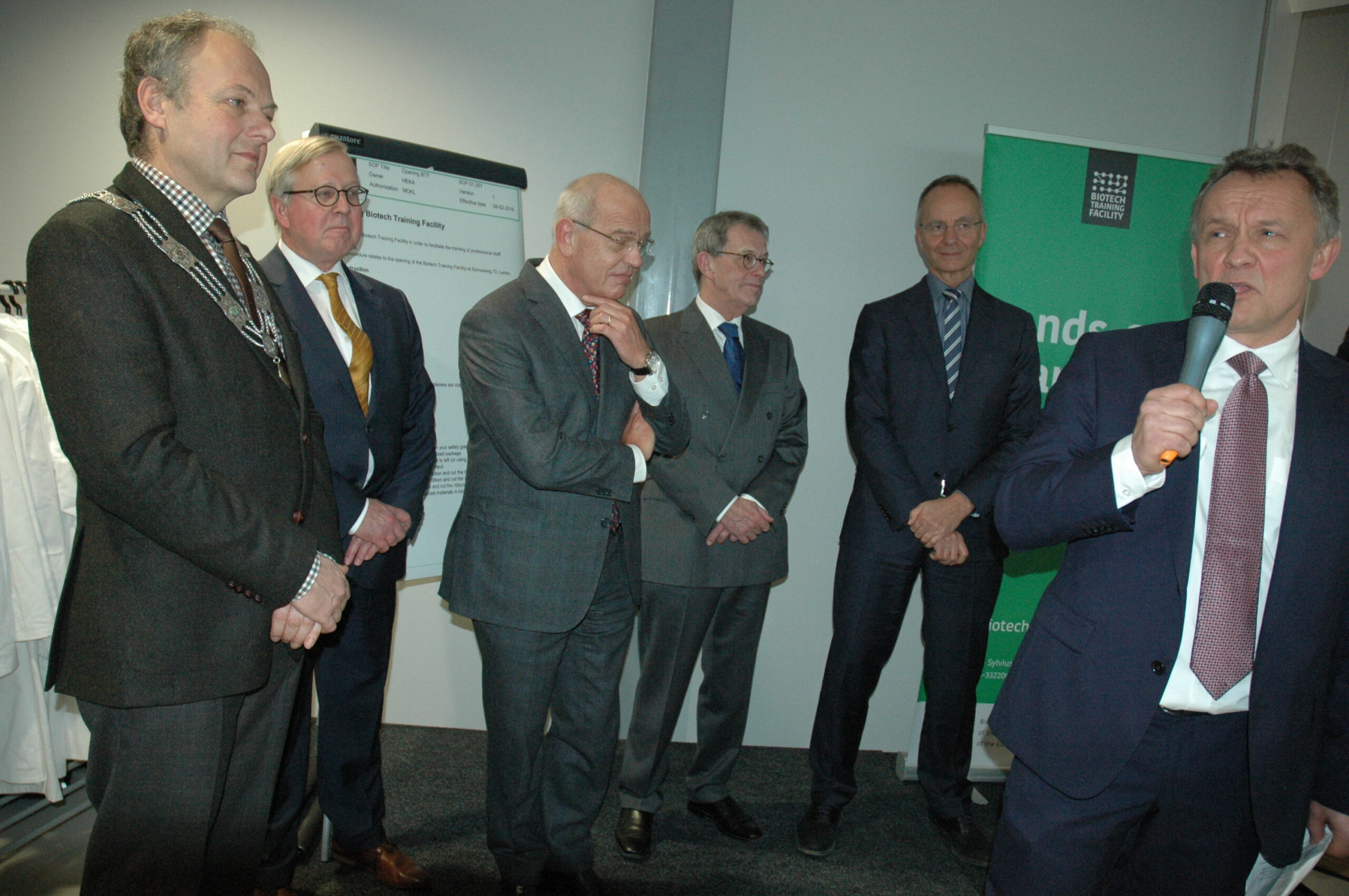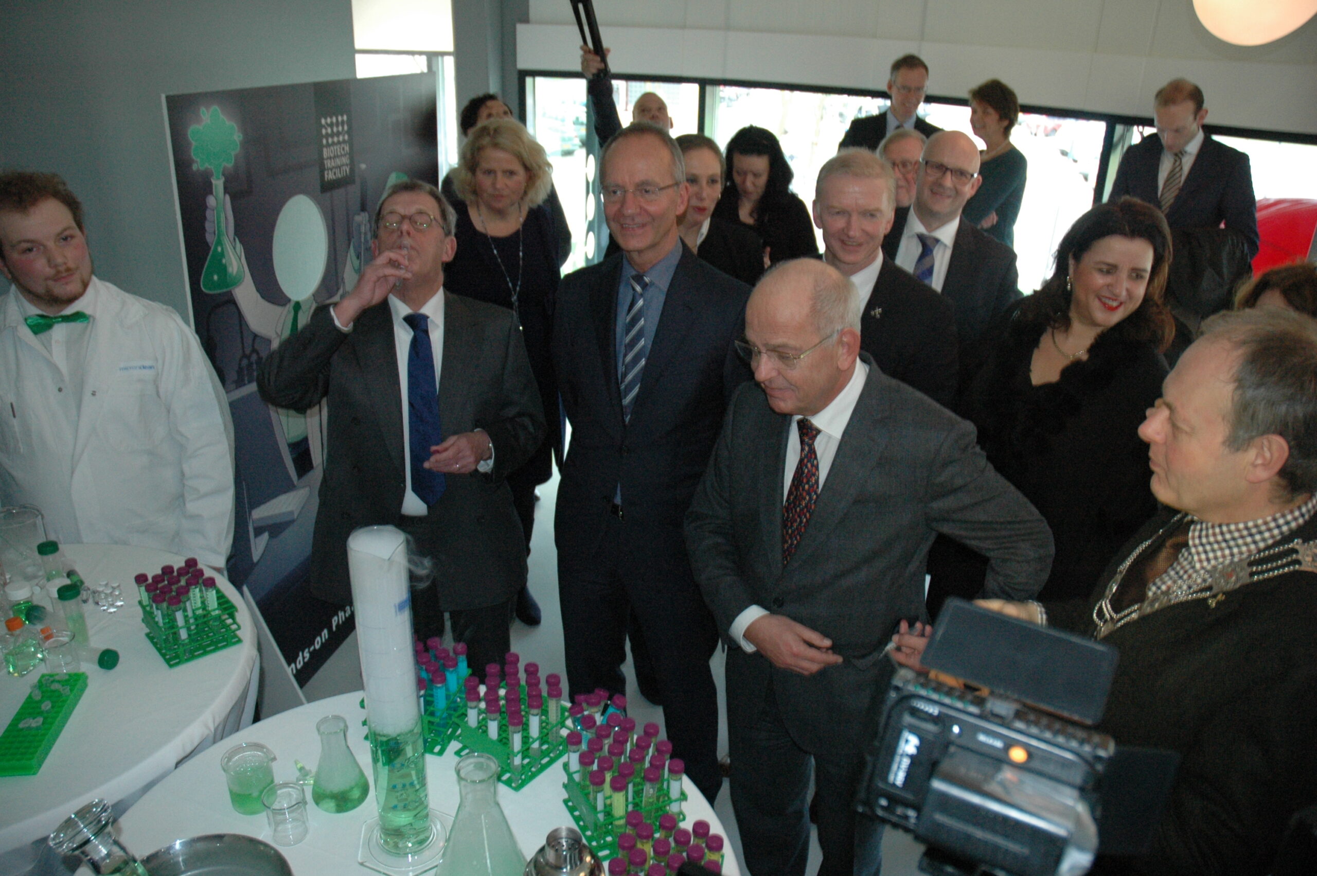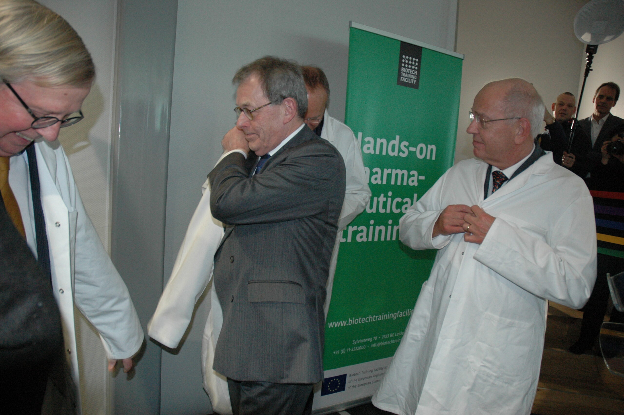 Sinds vandaag staat het enige opleidingscentrum voor laboranten dat Nederland telt in Leiden. Ook in Europa de trainingsfaciliteit uniek. Alleen Ierland heeft ook een dergelijk centrum. Onder enorme belangstelling openden vertegenwoordigers van de vijf initiatiefnemers vanmiddag de Biotech Training Facility. Dat waren Minister Kamp van Economische Zaken, voorzitter Gerrit Zalm van de Raad van Bestuur van de ABN AMRO Bank, dat het unieke centrum mede financierde, burgemeester Lenferink, vice-voorzitter Willem te Beest van de universiteit Leiden en voorzitter Harry Flore van de Ondernemersvereniging Bio Science Park.