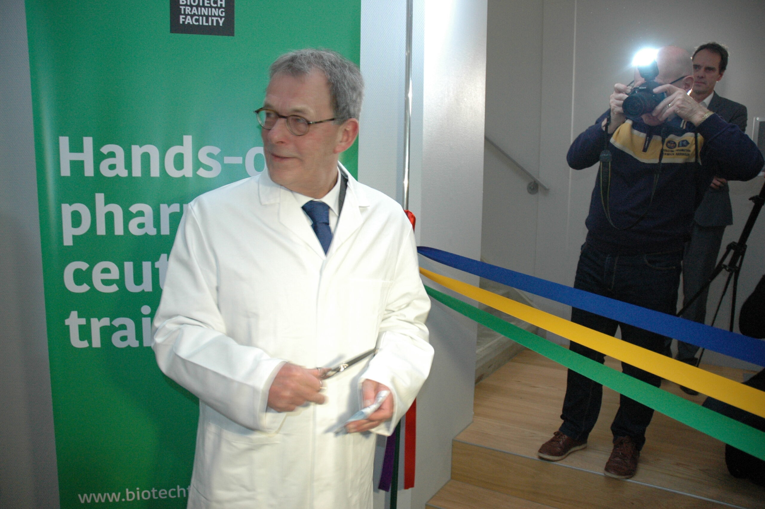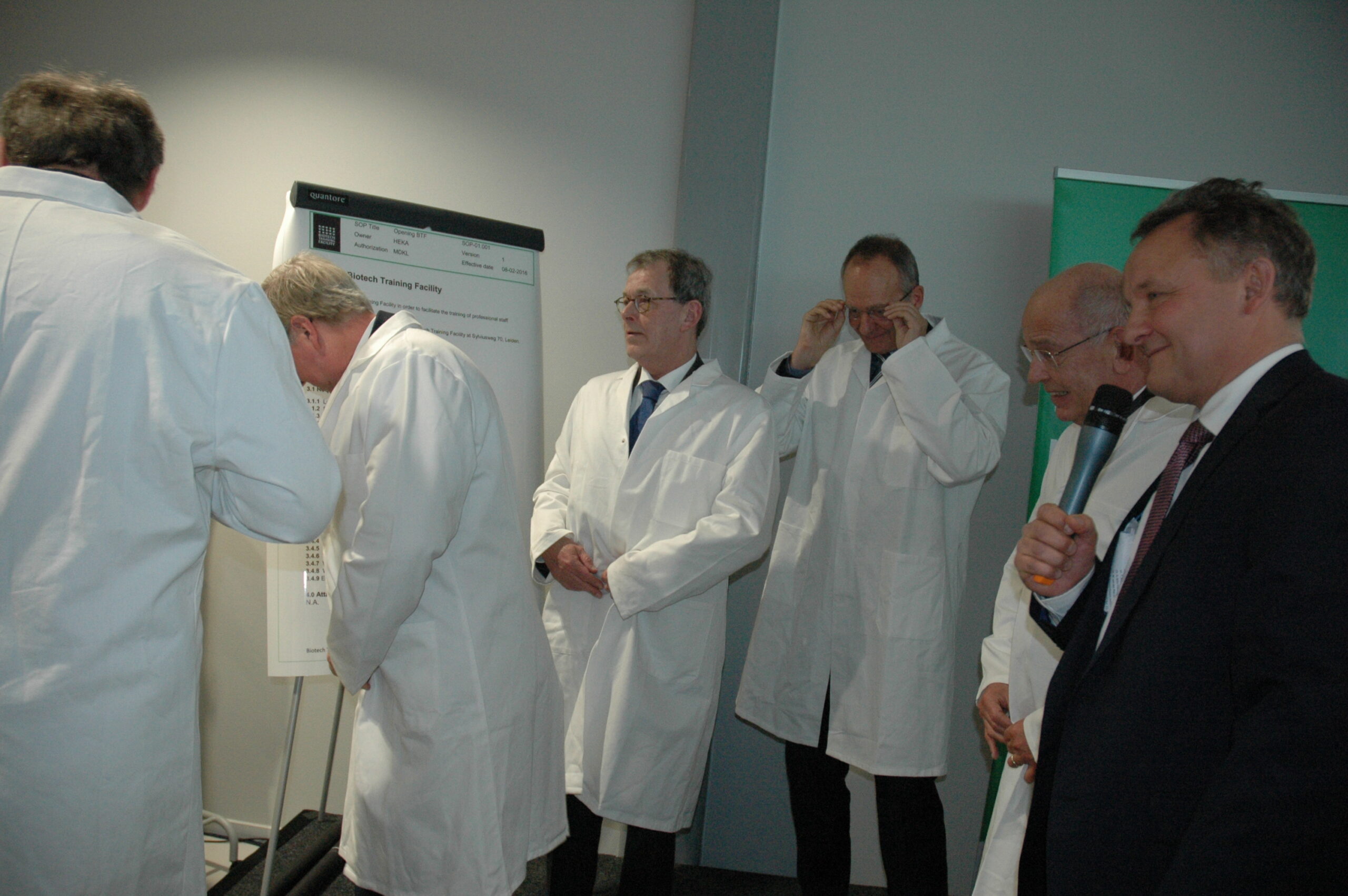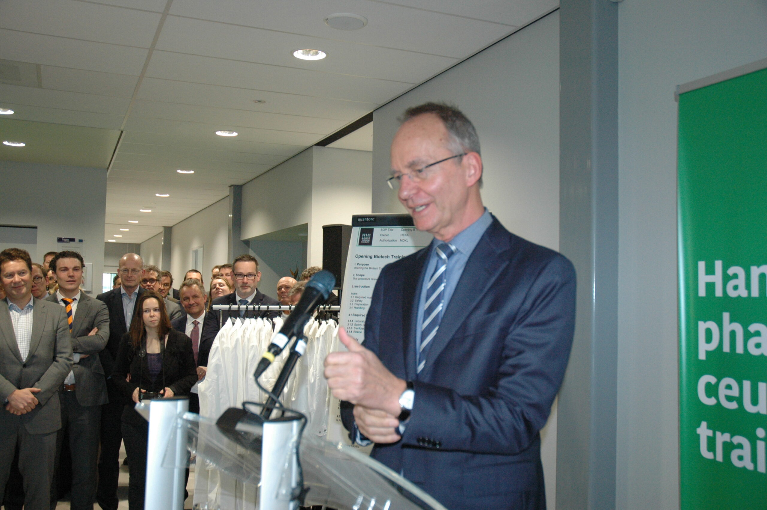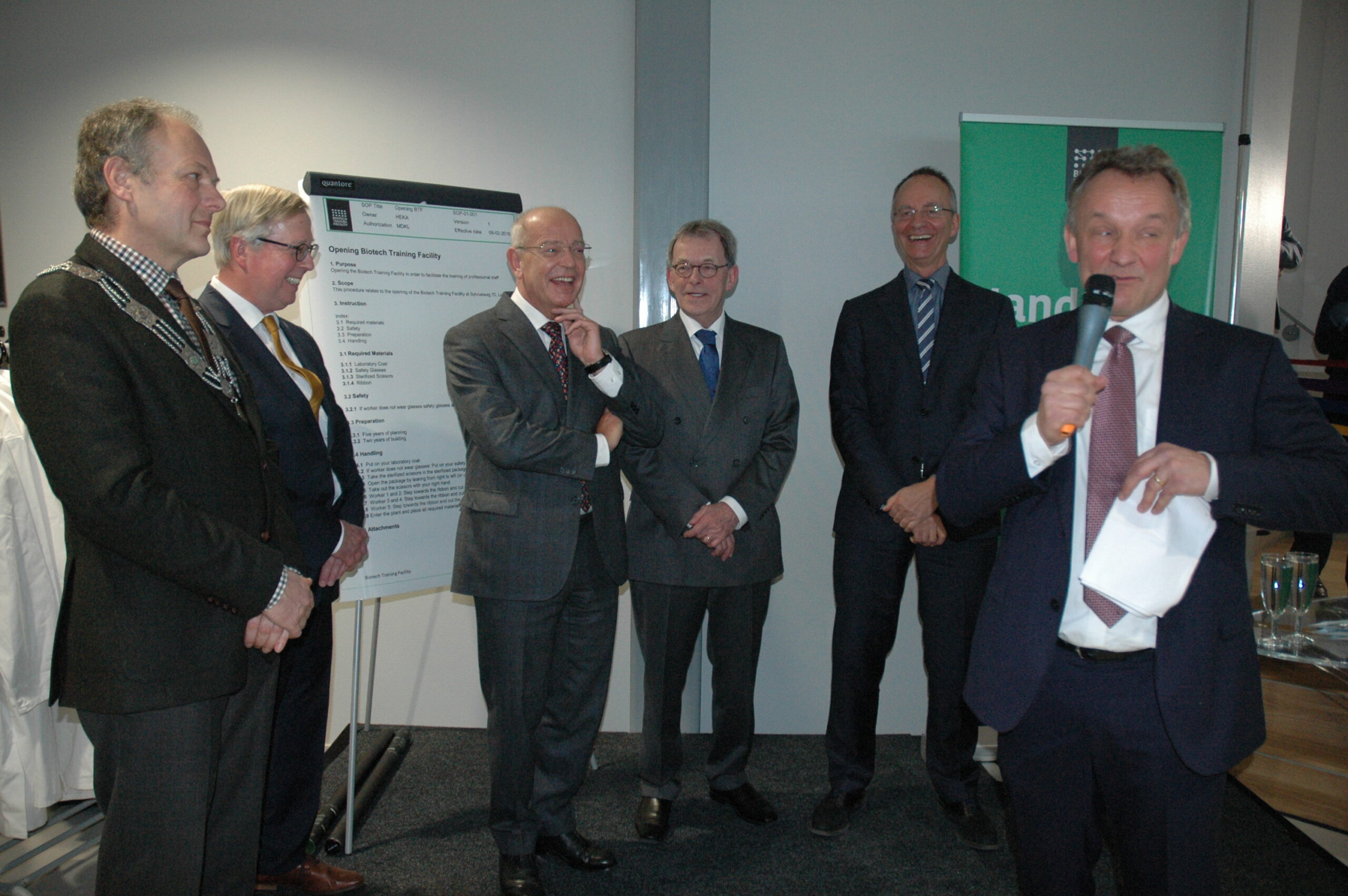 Sinds vandaag staat het enige opleidingscentrum voor laboranten dat Nederland telt in Leiden. Ook in Europa de trainingsfaciliteit uniek. Alleen Ierland heeft ook een dergelijk centrum. Onder enorme belangstelling openden vertegenwoordigers van de vijf initiatiefnemers vanmiddag de Biotech Training Facility. Dat waren Minister Kamp van Economische Zaken, voorzitter Gerrit Zalm van de Raad van Bestuur van de ABN AMRO Bank, dat het unieke centrum mede financierde, burgemeester Lenferink, vice-voorzitter Willem te Beest van de universiteit Leiden en voorzitter Harry Flore van de Ondernemersvereniging Bio Science Park.