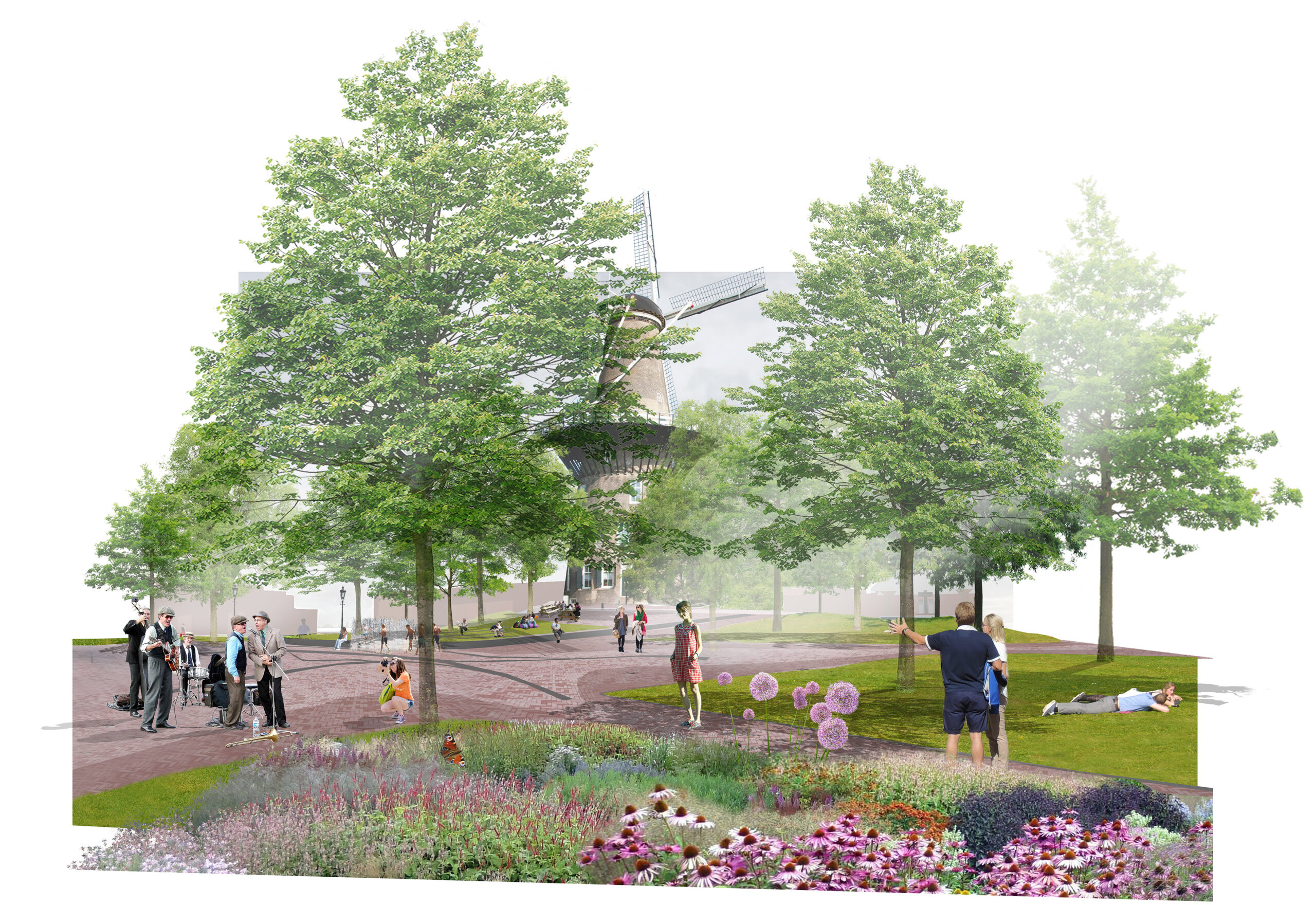 De Lammermarkt wordt ingericht als groen evenementenplein. Met natuurstenen zitjes, bedriegertjes – dat zijn fonteintjes zoals ook de Beestenmarkt die heeft – en veel gras. Voor een deel wordt het gras op een speciale verharde ondergrond gelegd met matjes waar de wortels zich goed kunnen hechten. Gewapend gras heet dat. Op die manier wordt het bij evenementen niet vertrapt. Ook wordt het plein groter doordat de hekken en bosschages rond molen De Valk verdwijnen. De molen komt daardoor als het waren op het plein te staan.