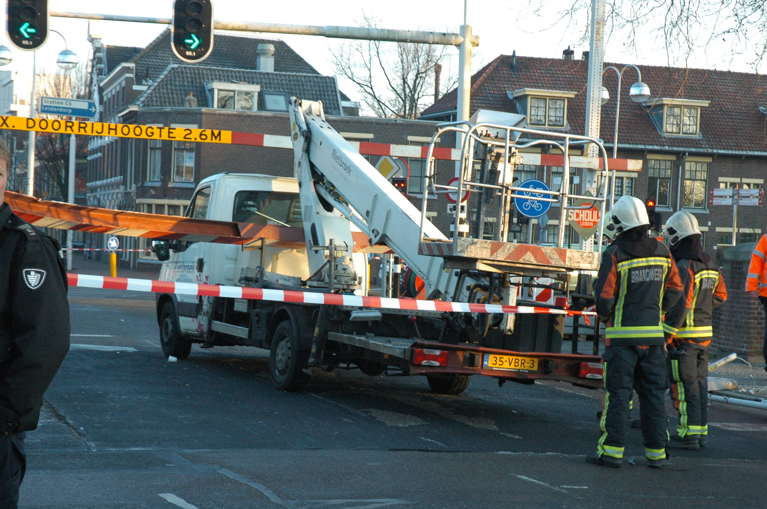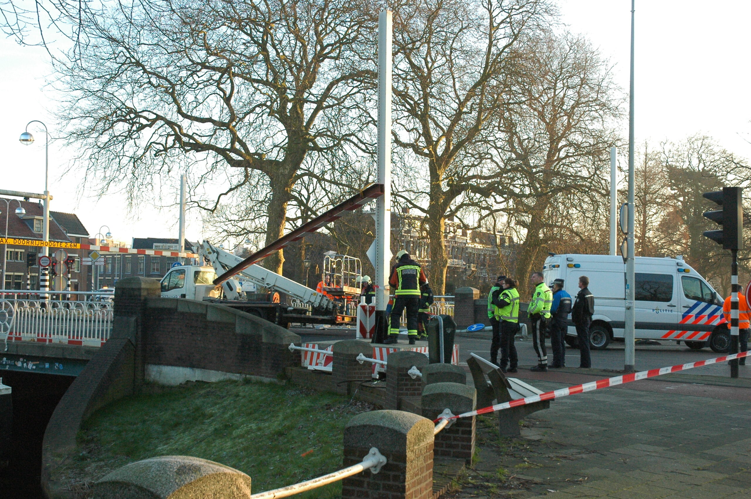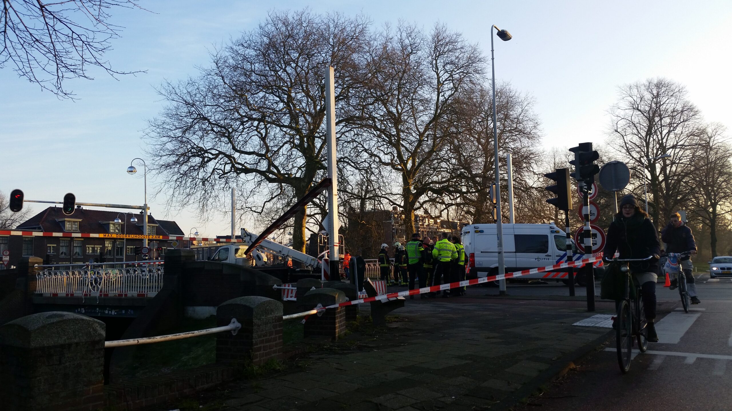Vanmorgen is, net als gisteren, een te hoog voertuig tegen de dwarsligger gereden die de Jan van Houtbrug afsluit voor zwaar verkeer. Ook nu bleef de bestuurder ongedeerd. Wel raakte een fietser ernstig gewond. Delen van een lantaarnpaal, die omver werd getrokken door de balk, kwamen op het slachtoffer neer. De fietser is per ambulance naar het ziekenhuis gebracht.
