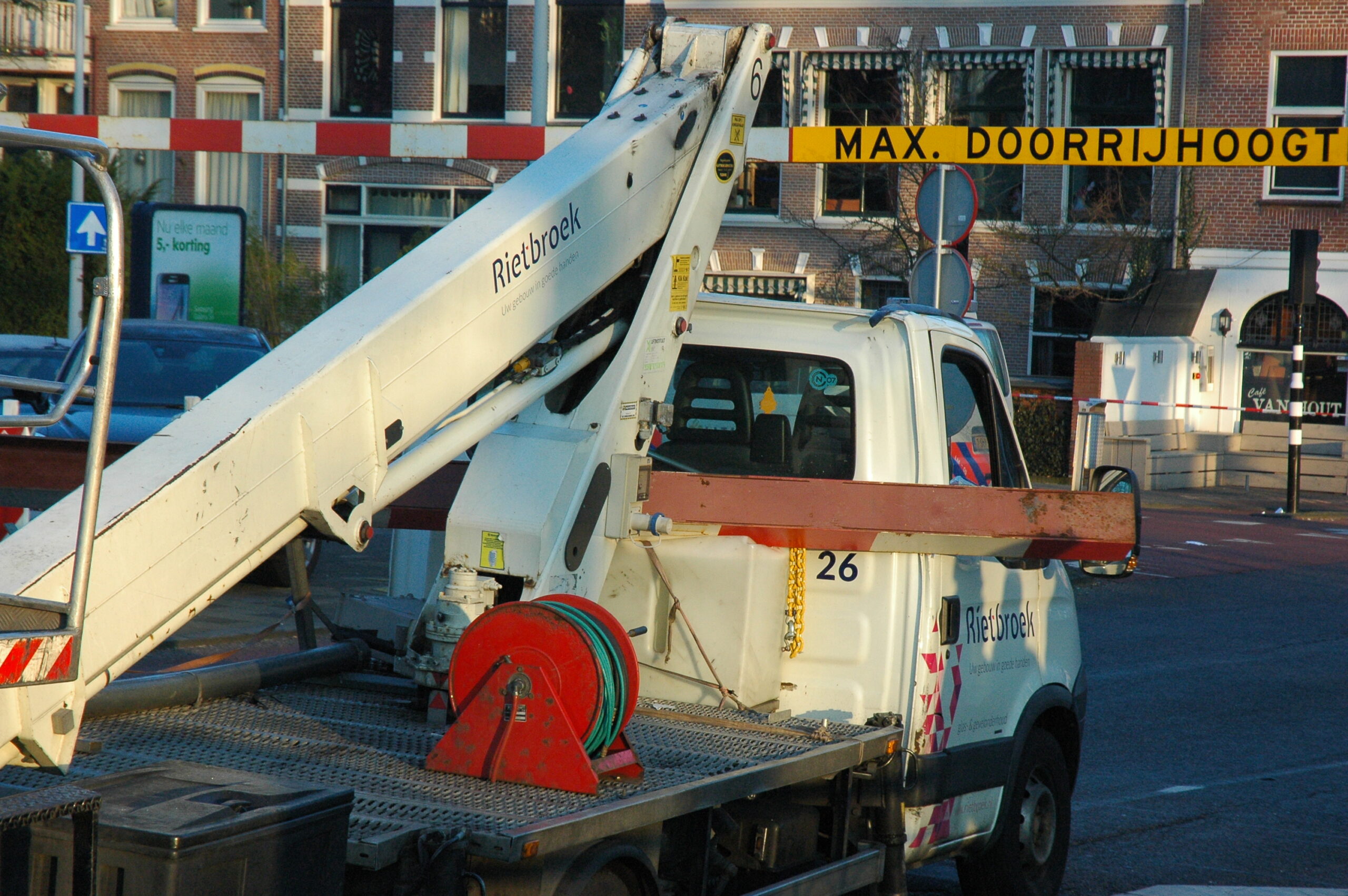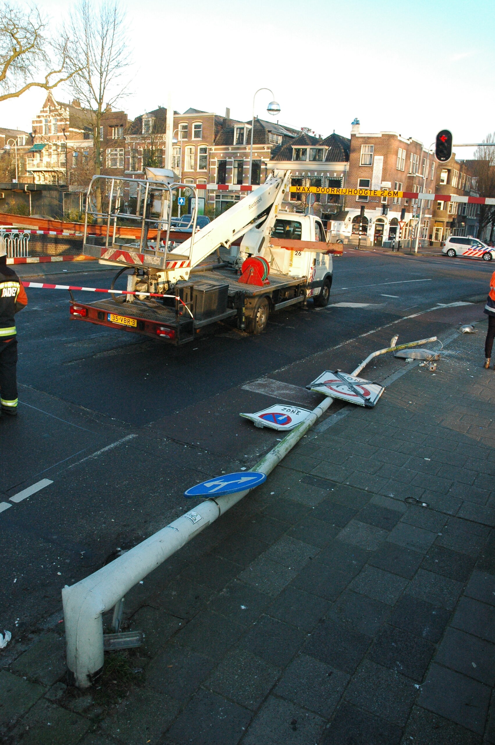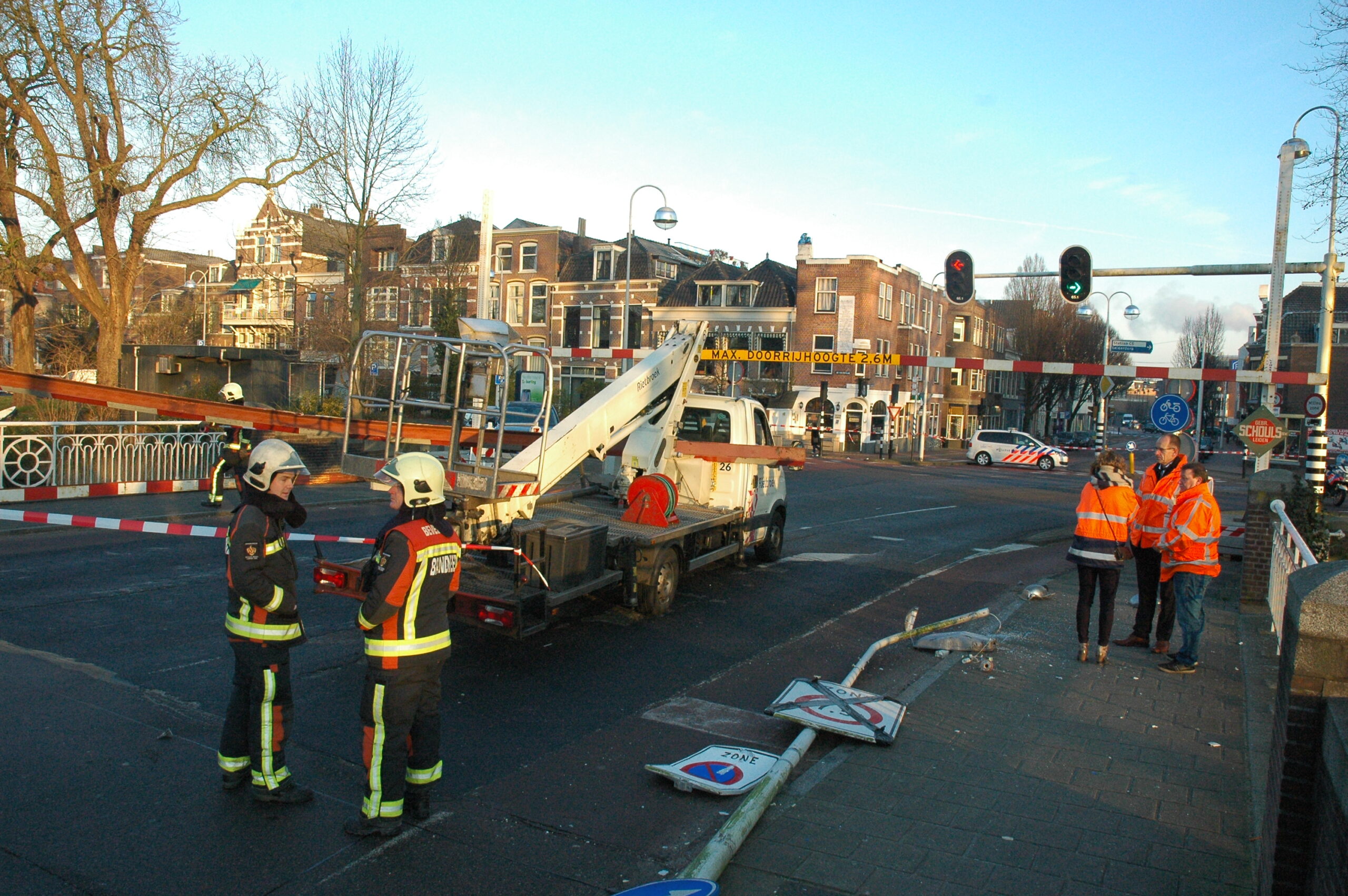 Vanmorgen is, net als gisteren, een te hoog voertuig tegen de dwarsligger gereden die de Jan van Houtbrug afsluit voor zwaar verkeer. Ook nu bleef de bestuurder ongedeerd. Wel raakte een fietser ernstig gewond. Delen van een lantaarnpaal, die omver werd getrokken door de balk, kwamen op het slachtoffer neer. De fietser is per ambulance naar het ziekenhuis gebracht.