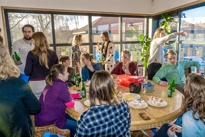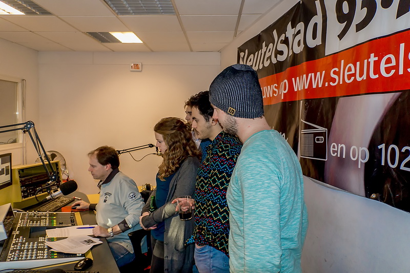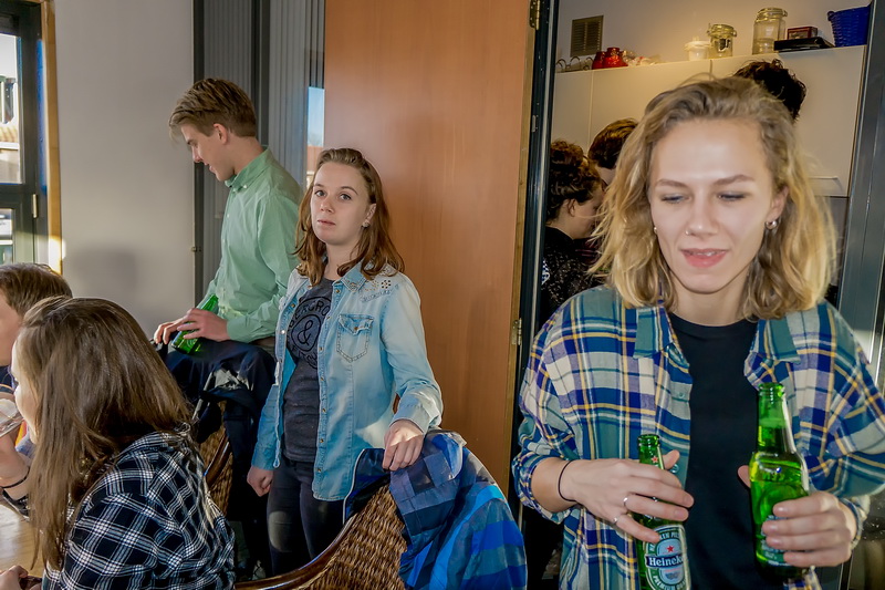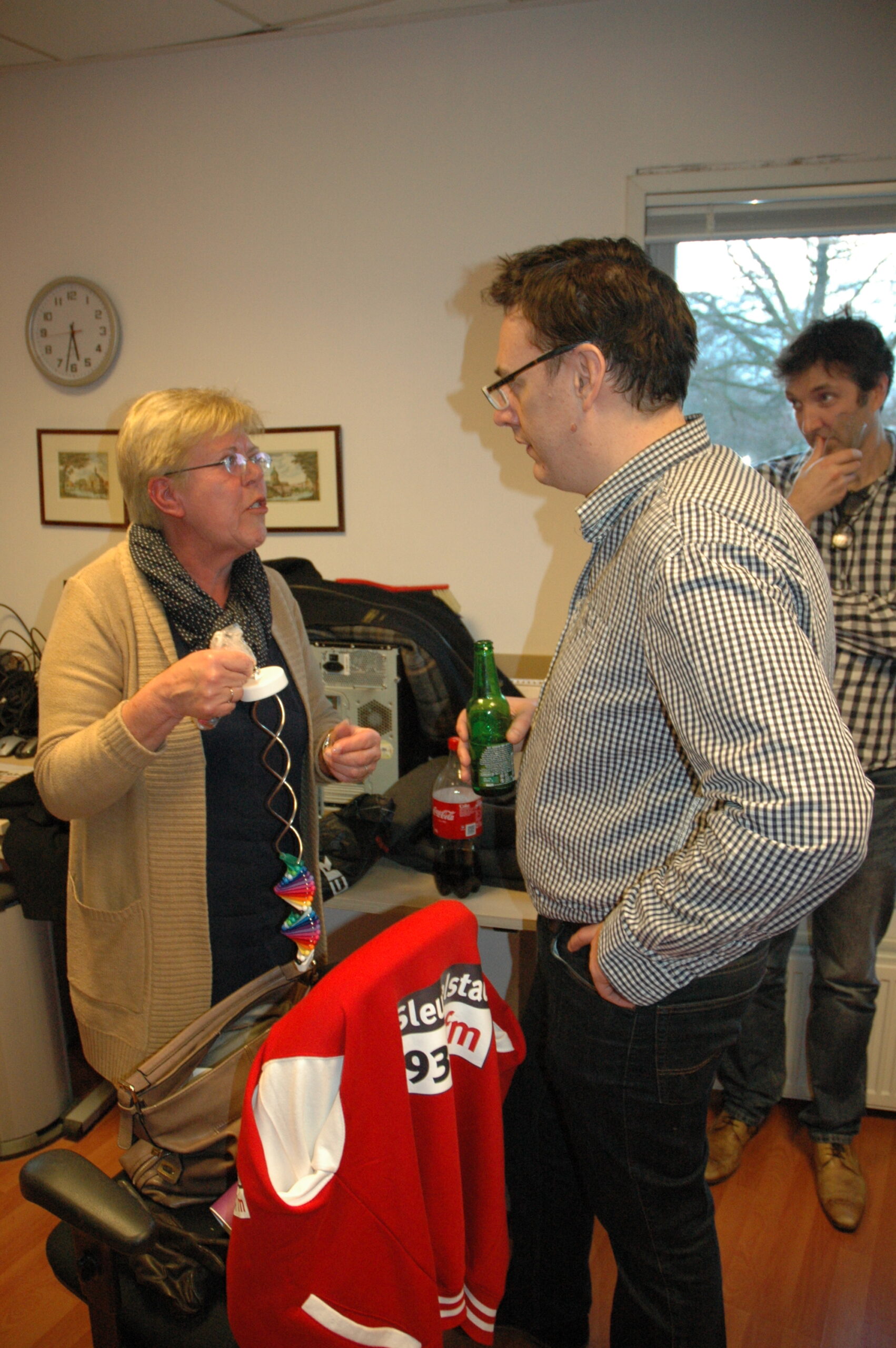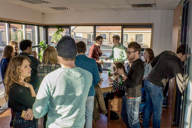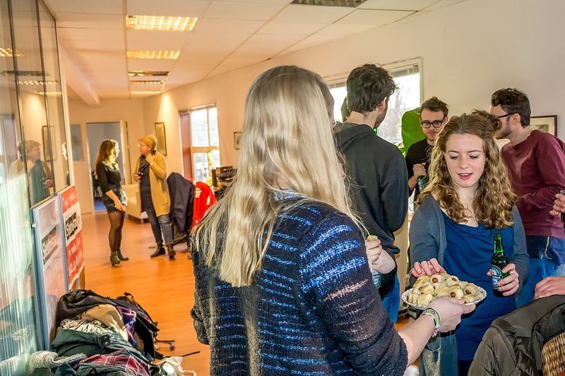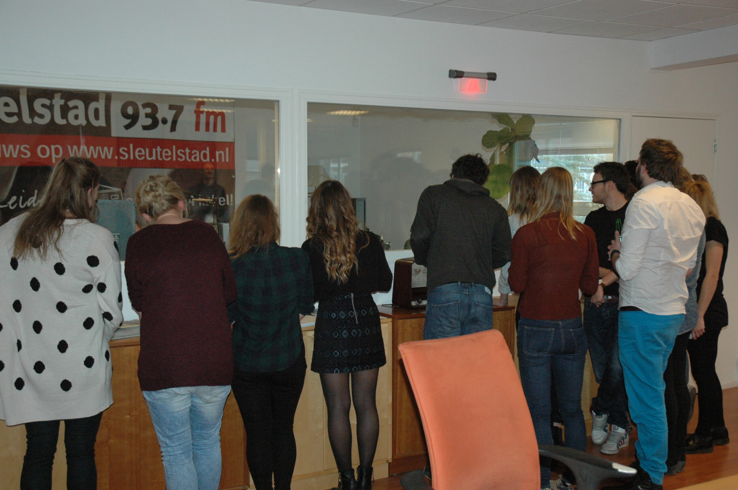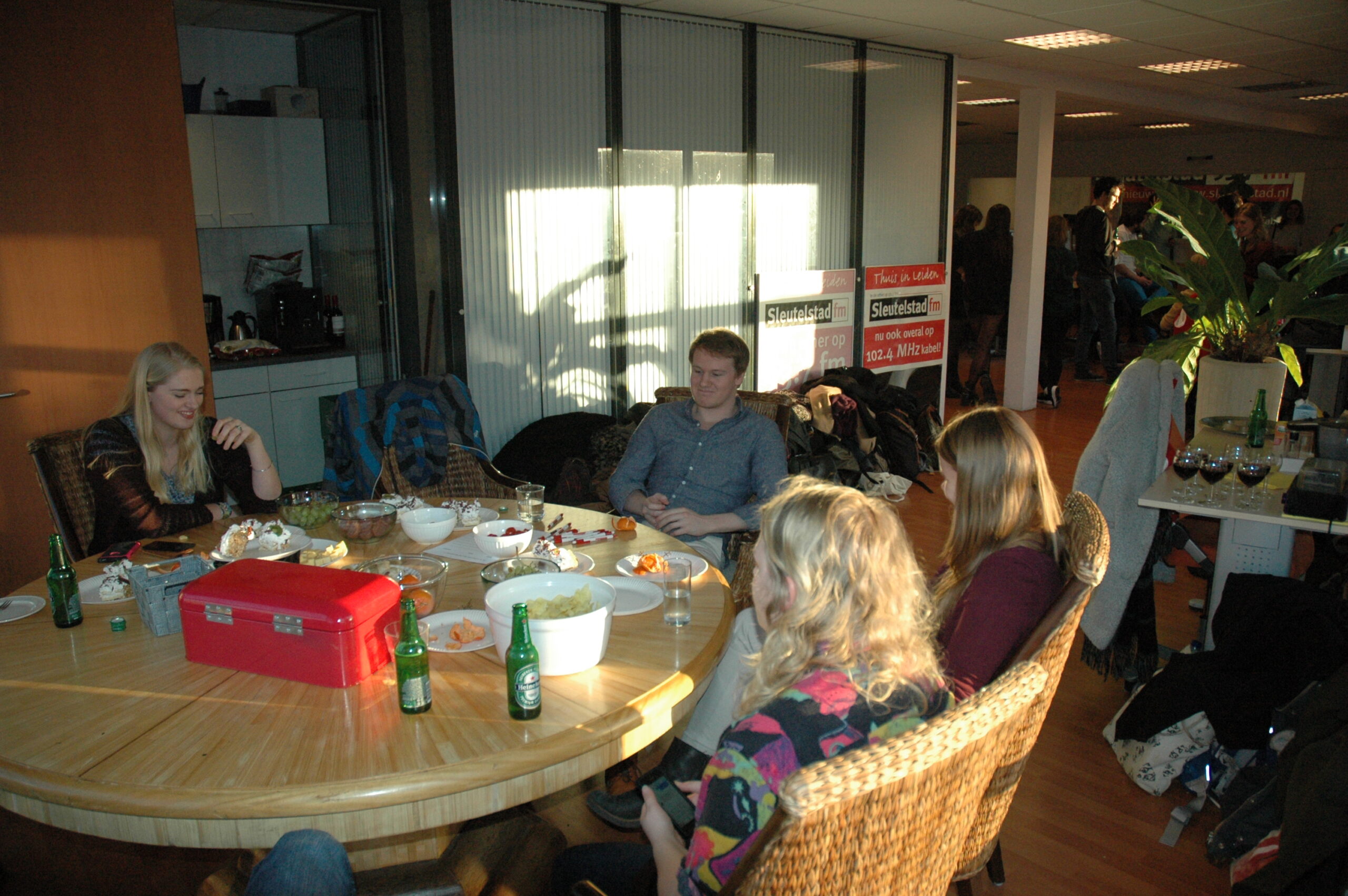 Aan het eind van de week waren de interviews opgenomen en gemonteerd en konden bijna alle studenten relaxen in de redactieruimte van Sleutelstad. Behalve Rick. die moest nog een live interview afnemen, Hieronder een impressie van een bijzondere vrijmibo.