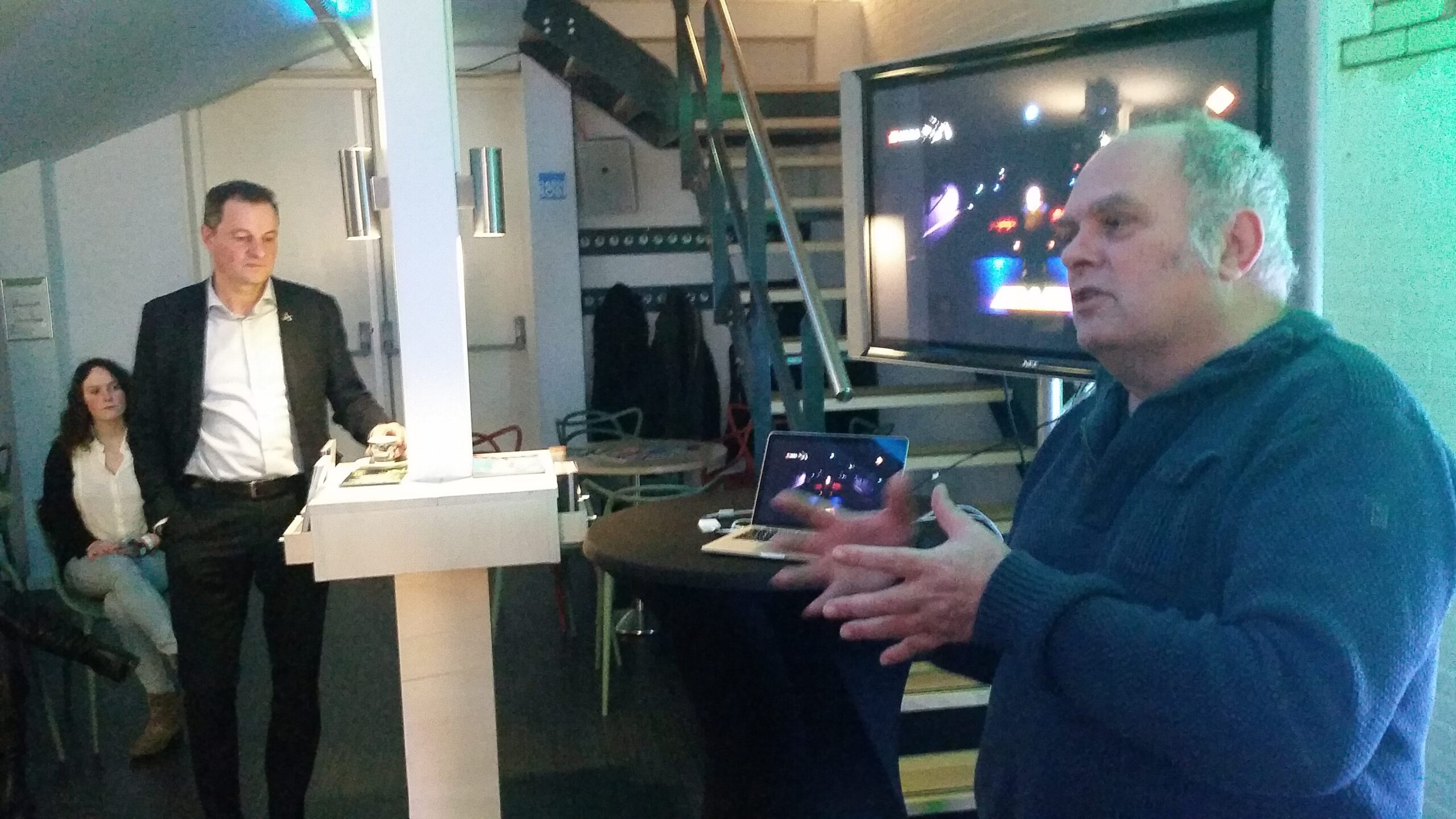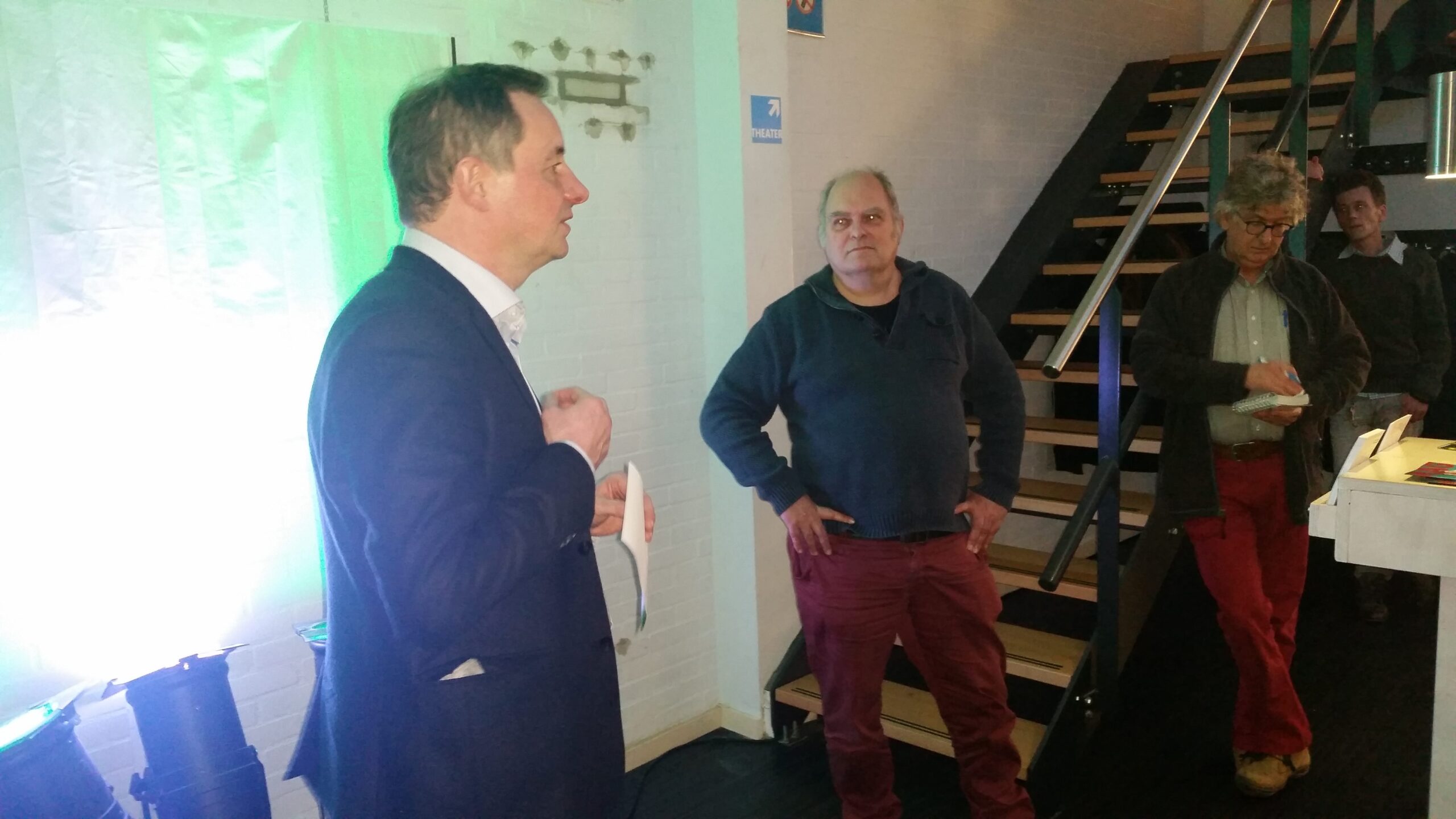 Chris de Waard in gesprek met wethouder Frank de Wit (D66, duurzaamheid) en zakelijk leider Kees van Leeuwen van Ins Blau.