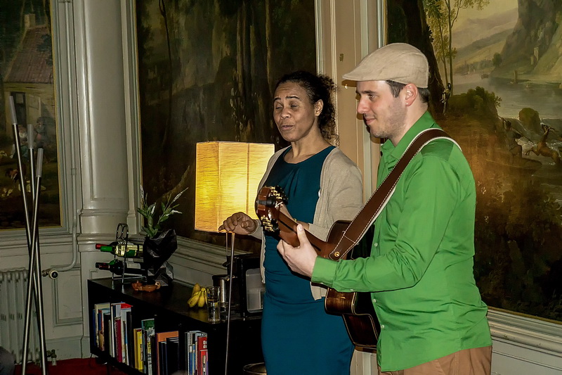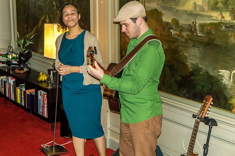 Dat laten meedoen lukte ook Lilian Vieira die, begeleid door Marijn van der Linden op gitaar, een staalkaart zong van Braziliaanse muziek. Mas que nada is een wereldhit en nodigt tot meezingen. Dus “als je voelt…. de tekst is heel makkelijk: o, o, o, o, o”. Voor een zangeres wel; het publiek zong met schroom en toch wat ingetogen mee. Vieira en Van der Linden maakten van de gelegenheid gebruik de nodige informatie te geven over de liedjes en de gebruikte instrumenten: een 7-snarige – violão 7 cordas – en een 10-snarige gitaar. Op die laatste speelde hij Braziliaanse country “terwijl ik eigenlijk niet zo van country houd” (Vieira: “ik ook niet”). Toch speelden ze het. Dat je naar topmuzikanten keek, zag je aan de razendsnelle vingerzetting en hoorde je aan de klanken van zangeres en gitaar.