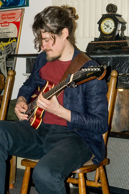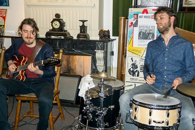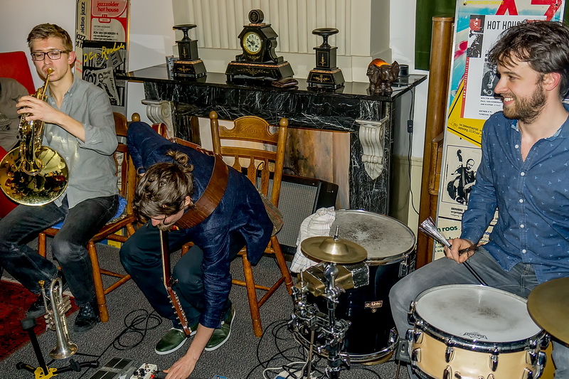 De vraag was hoe Kapok zich zou houden in een kamer. Eén blazer, een gitarist en een drummer; dat zou wel eens teveel van het goede kunnen zijn voor een kamer. Het feit dat ze een toegift konden spelen – ze waren laatste in onze route – logenstraft dat. Kapok zinderde weer, met een voorkeur voor intensiteitswisselingen van zacht-fluisterend tot en met stampend-hard. Nooit werd het té hard. Wel kreeg het publiek een extra mee in de vorm van het kunnen voelen van het intrappen van het bekkenpedaal. Een extra muzieksensatie, net zoals de pendule in de huiskamer vrij aardig maat bleek te kunnen houden en op bijna het juiste moment zijn uur-aanduiding liet horen. Ietwat verwarrend voor de drummer, die precies hetzelfde geluid moest maken.