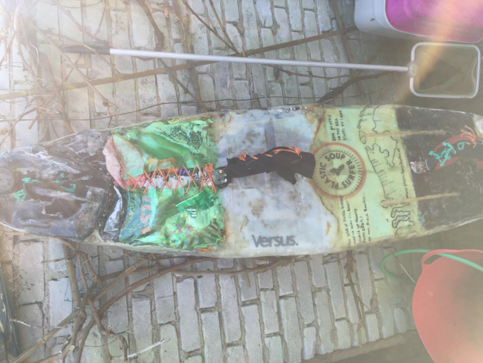”Bij kite foiling heb je een draagvleugel onder het board zitten die je board als het ware omhoog duwt waardoor je door de lucht zweeft. Omdat het board boven water zweeft, heb ik de mogelijkheid het board een andere vorm te geven. Als kunstenaar geef ik het board nu de vorm van een halve liter petfles”, aldus de Plastic Soup Surfer.