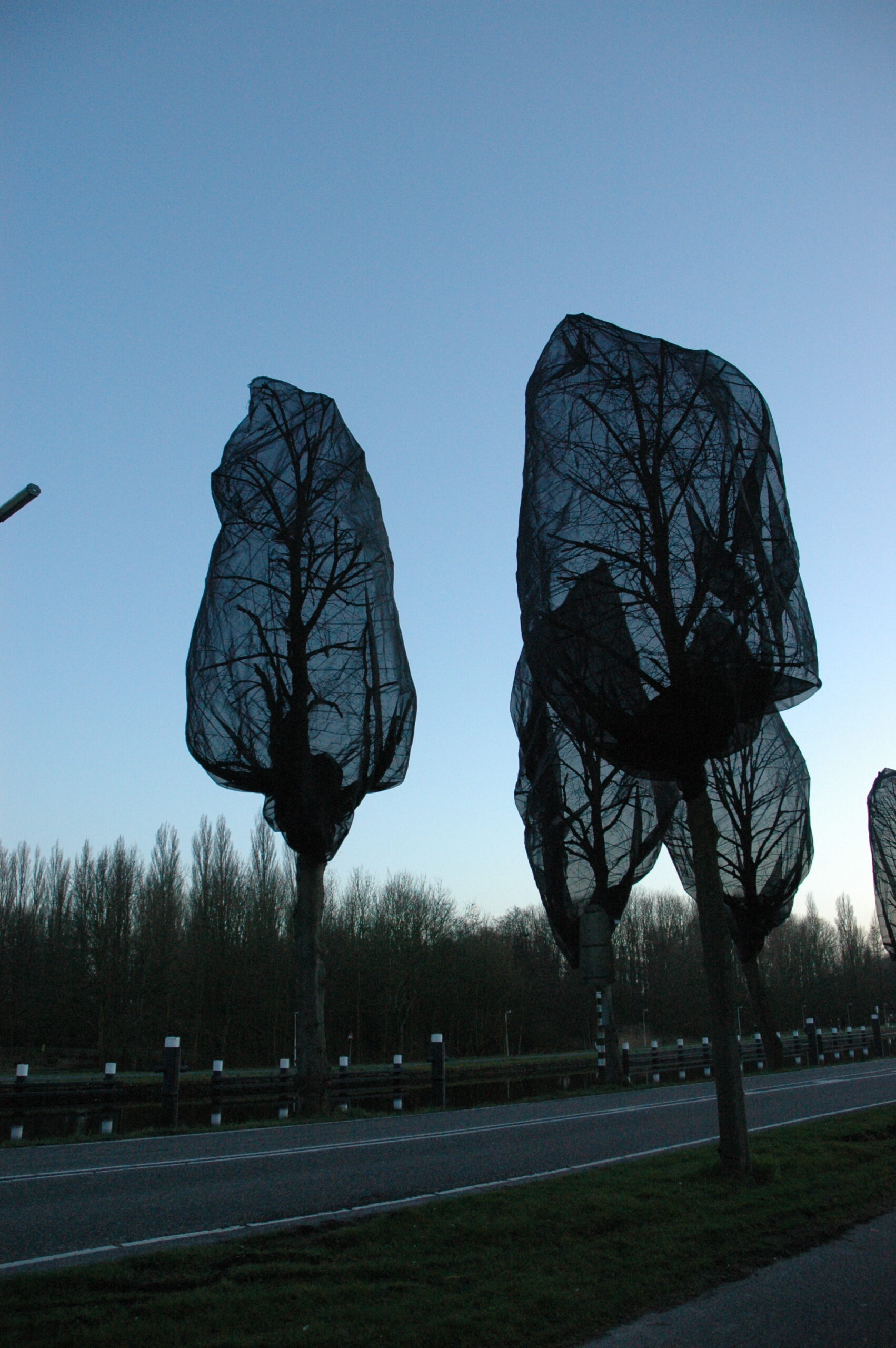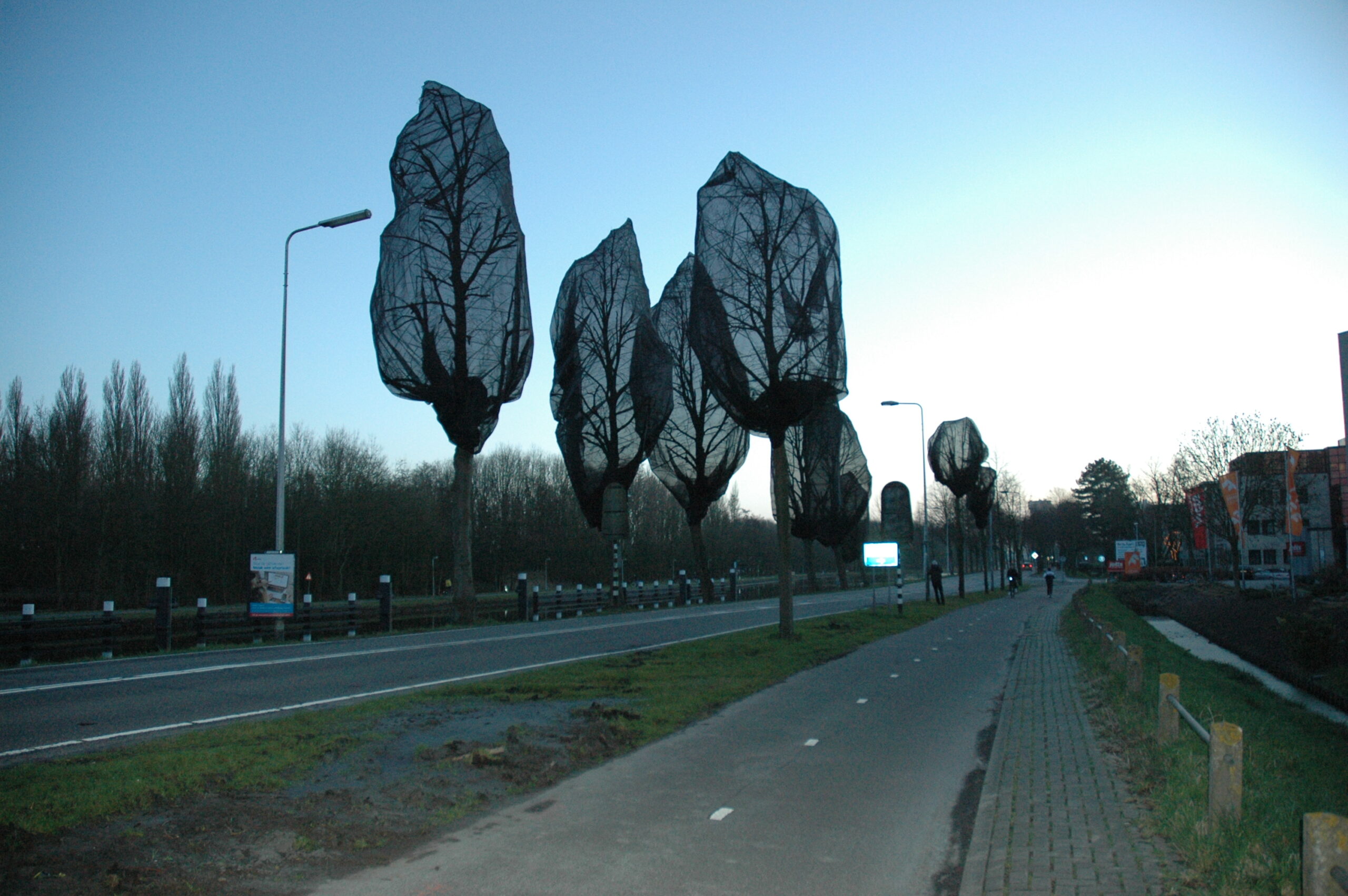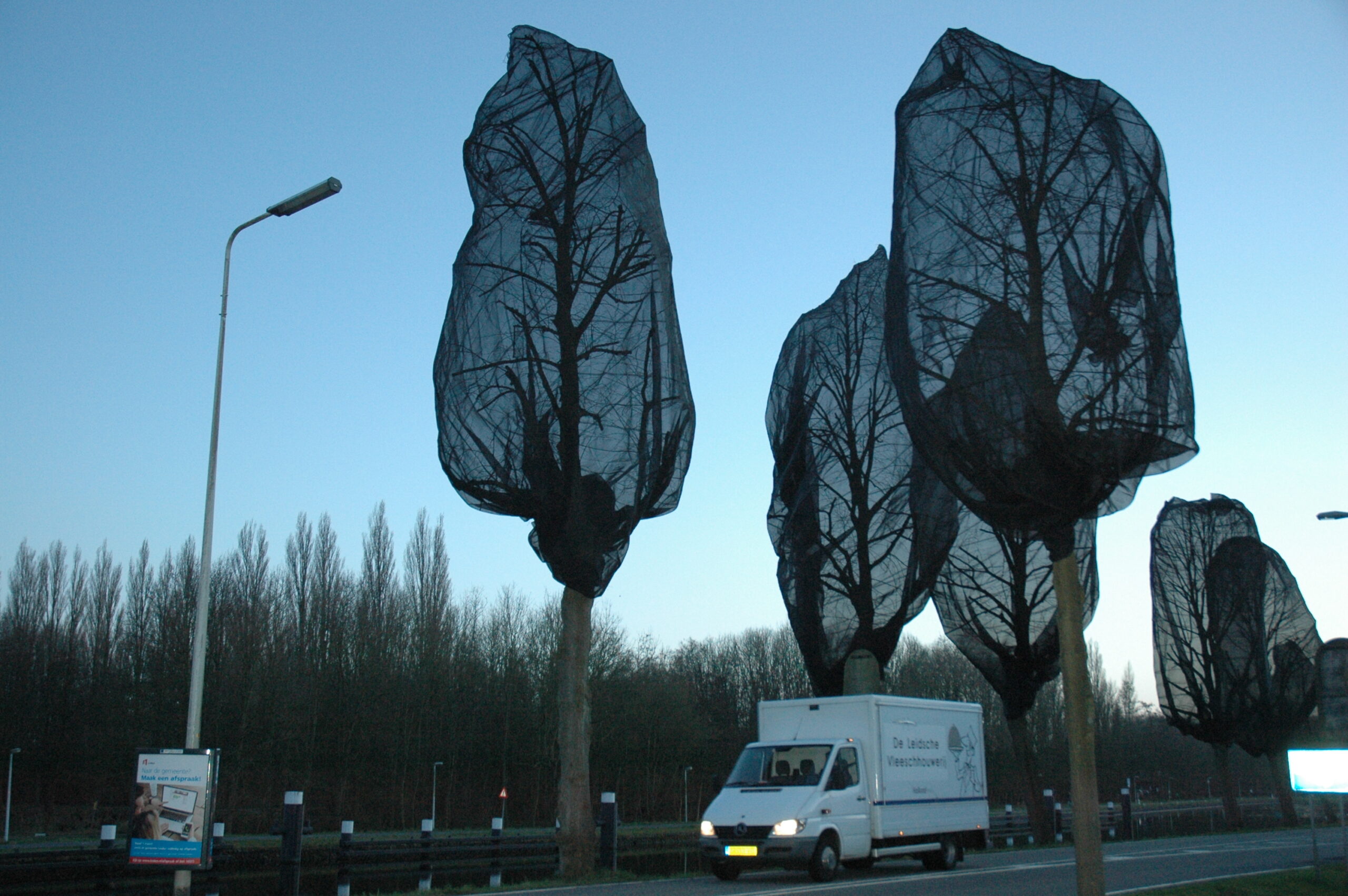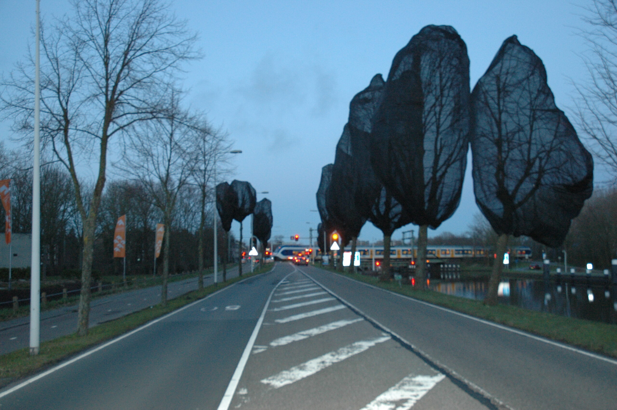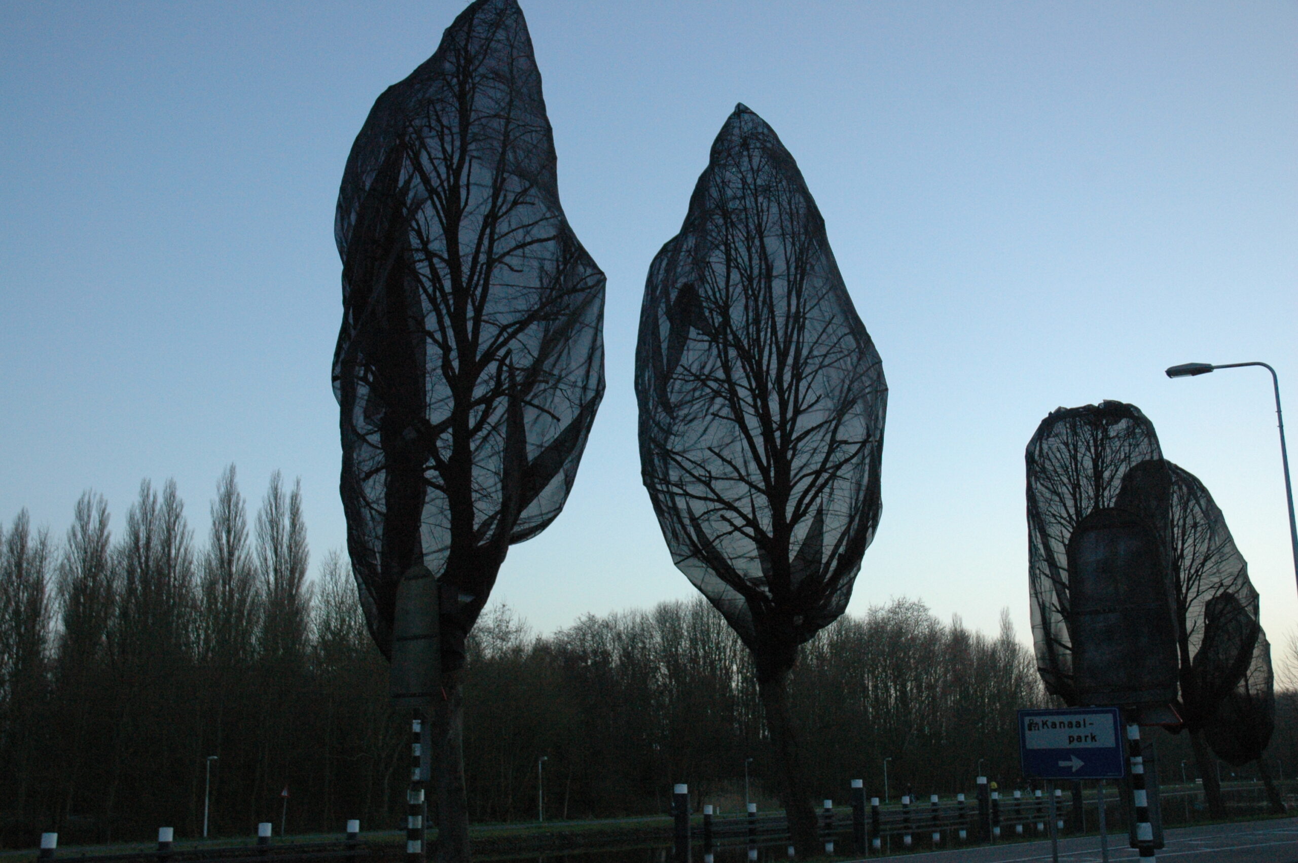 Ze worden massaal gefotografeerd. De ingepakte bomen langs de Kanaalweg ter hoogte van de spoorwegovergang. Hert lijkt wel een kunstwerk, maar de netten om de bomen hebben een heel praktische reden. Ze moeten voorkomen dat vogels een nestje bouwen in de bomen die binnenkort omgezaagd worden.