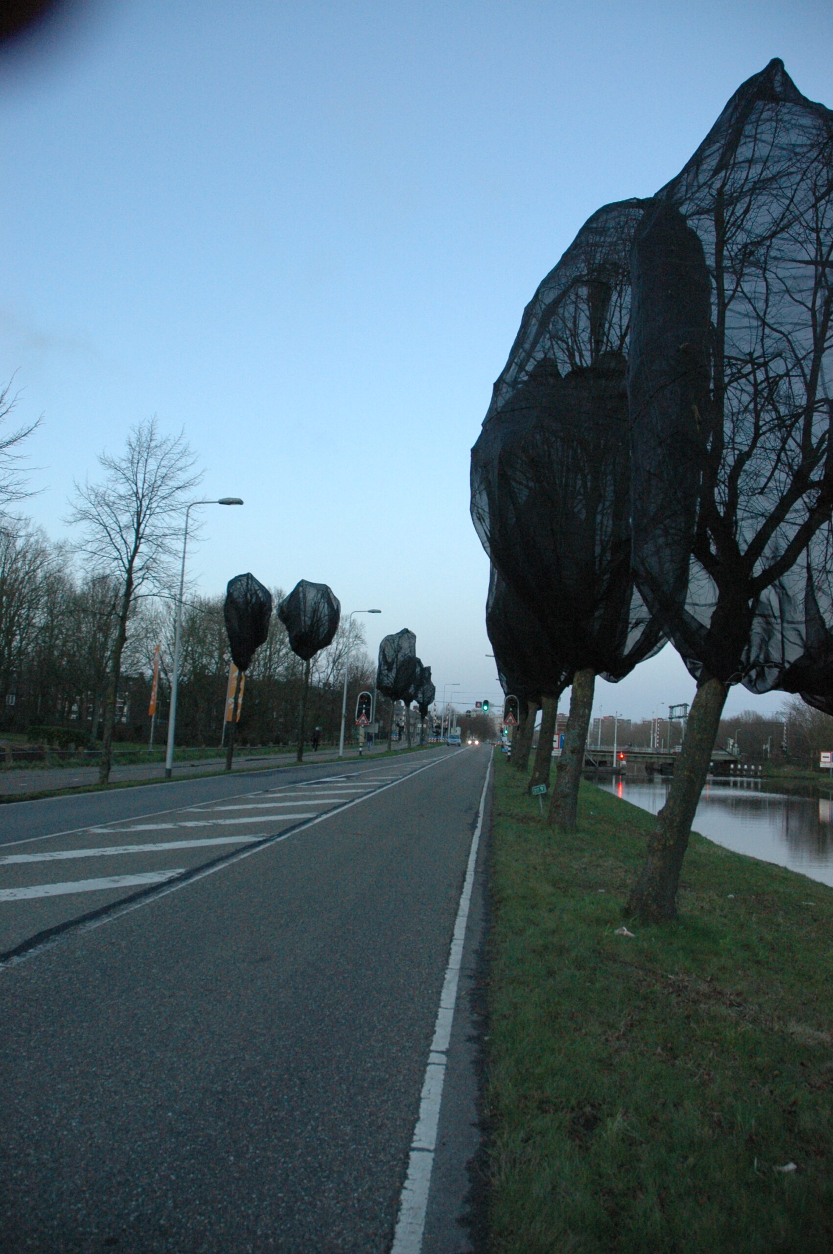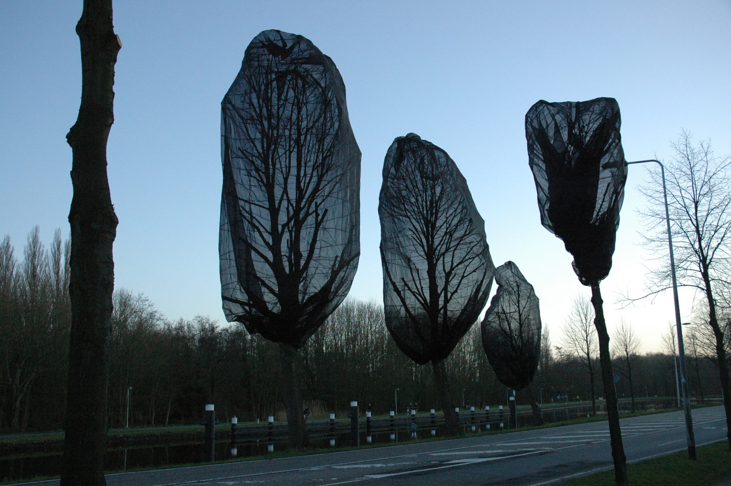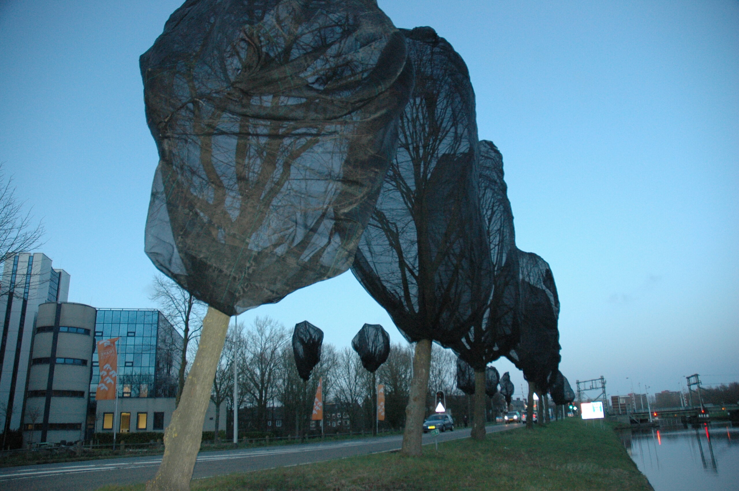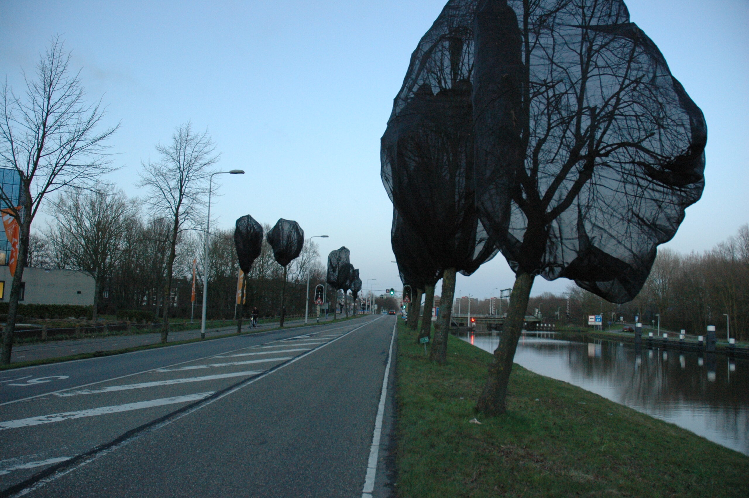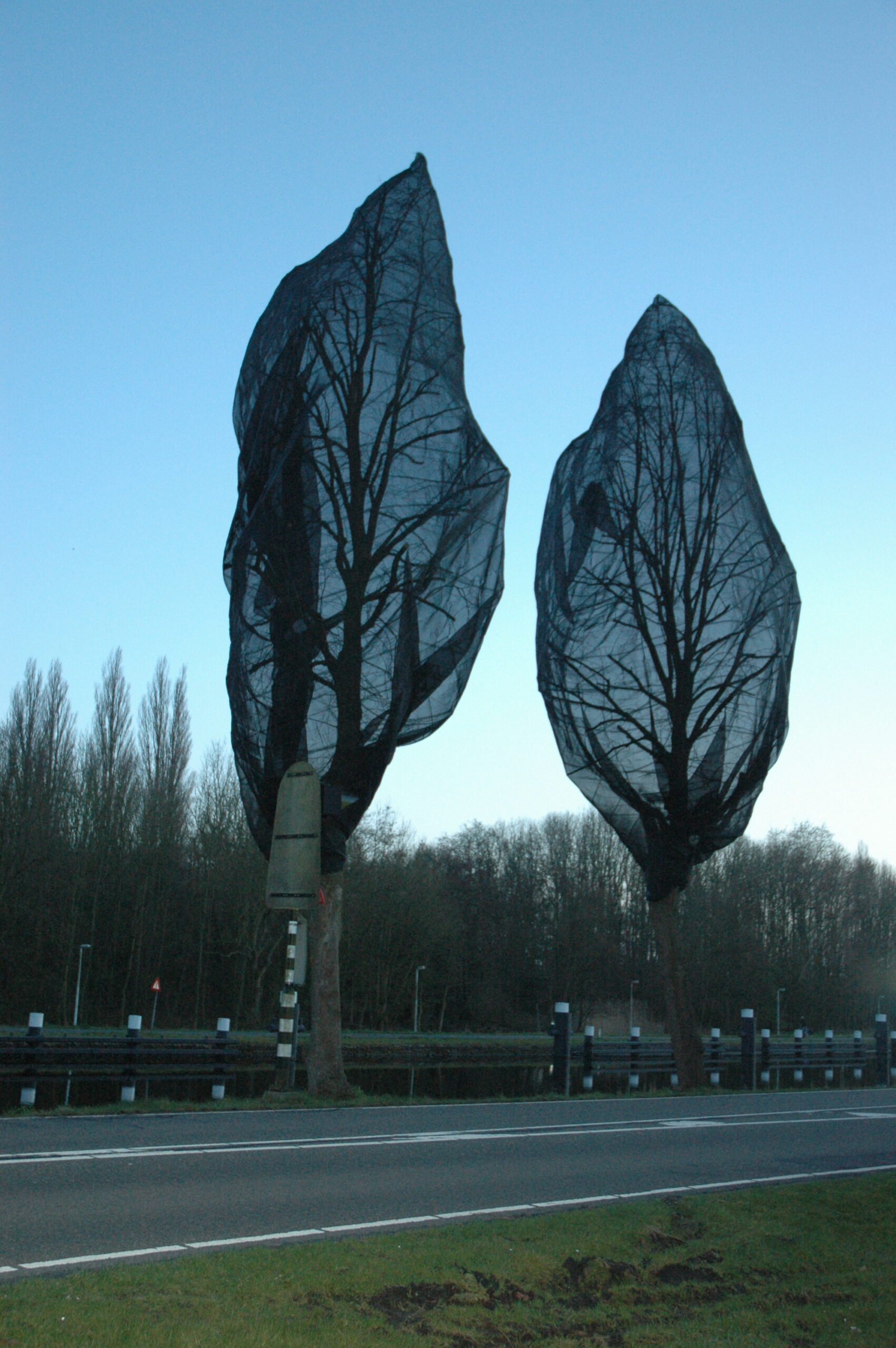 Ze worden massaal gefotografeerd. De ingepakte bomen langs de Kanaalweg ter hoogte van de spoorwegovergang. Hert lijkt wel een kunstwerk, maar de netten om de bomen hebben een heel praktische reden. Ze moeten voorkomen dat vogels een nestje bouwen in de bomen die binnenkort omgezaagd worden.