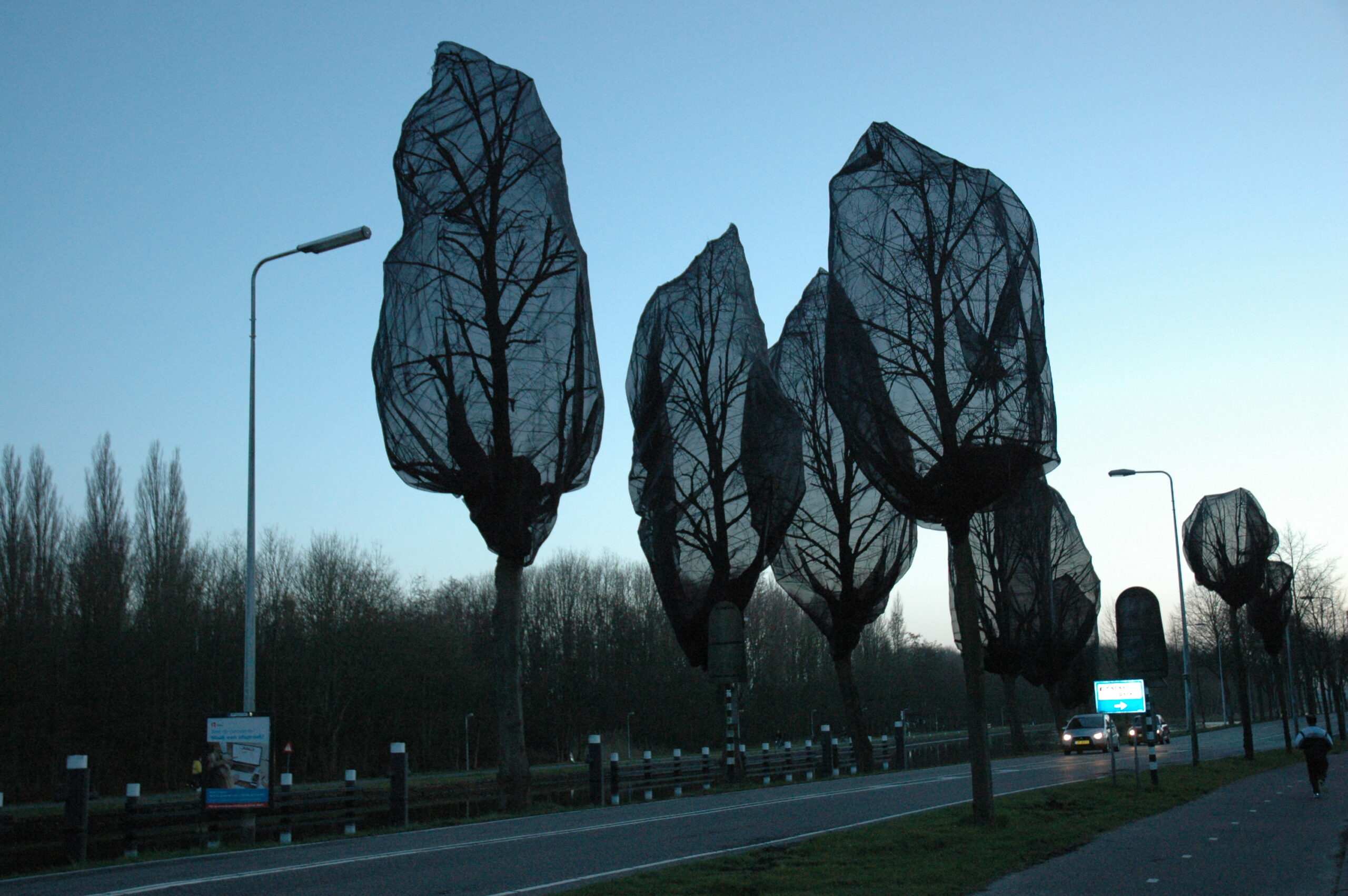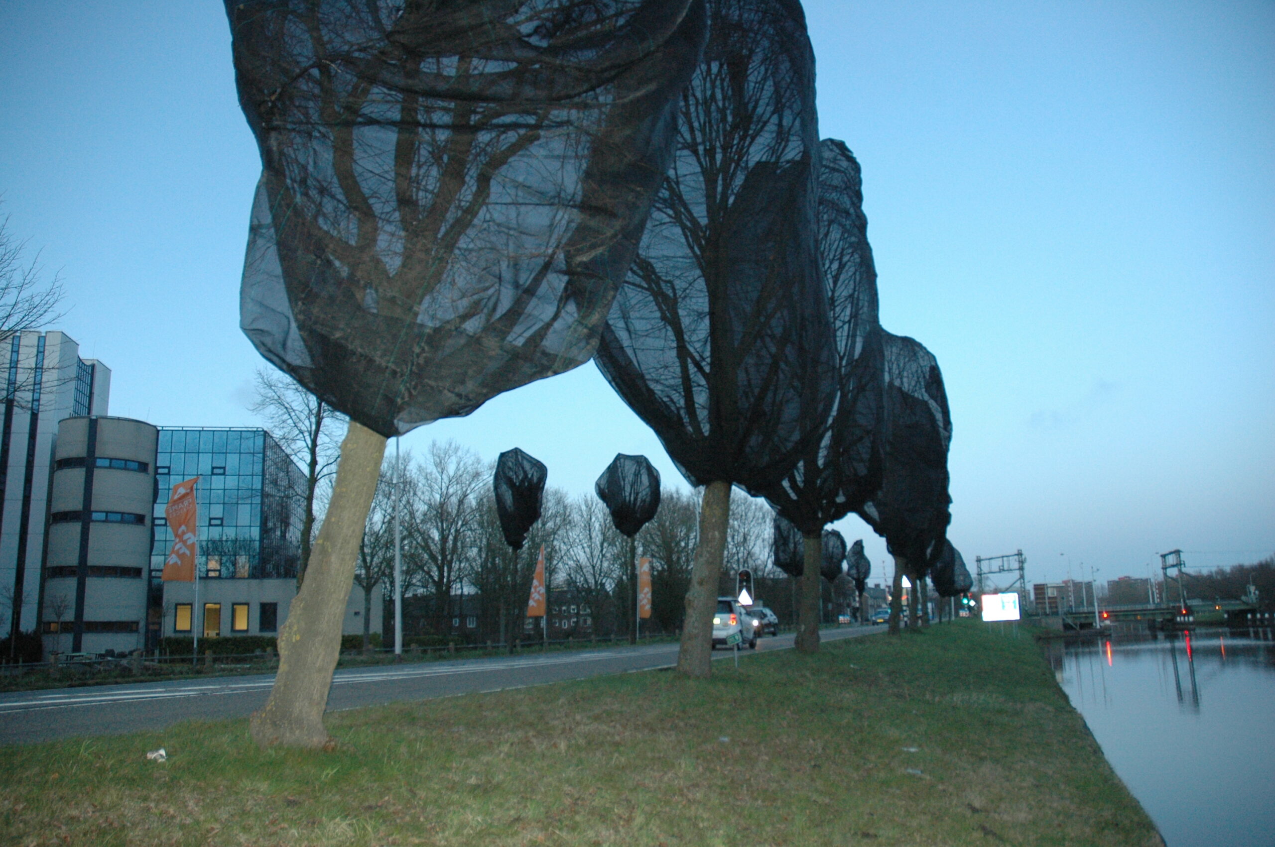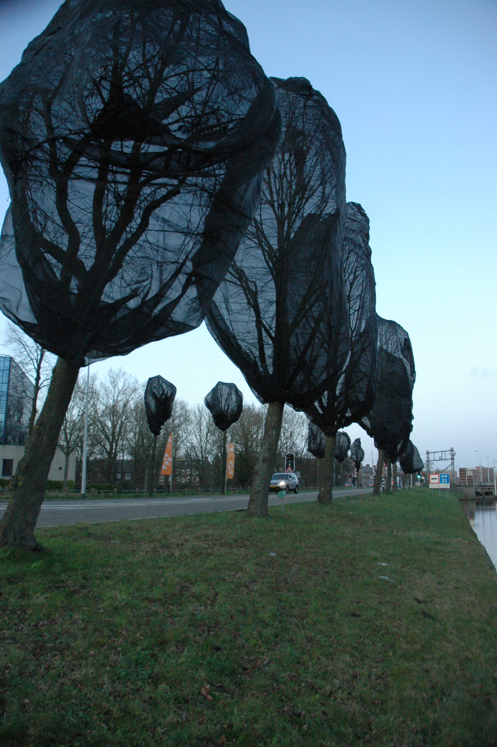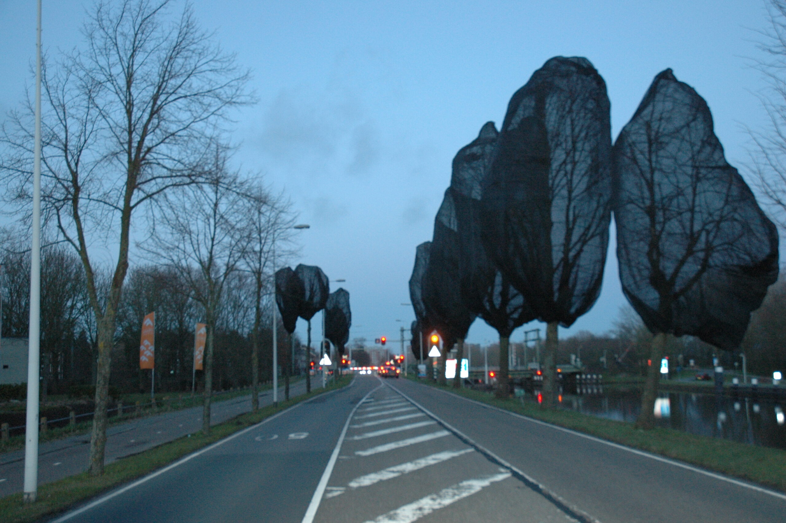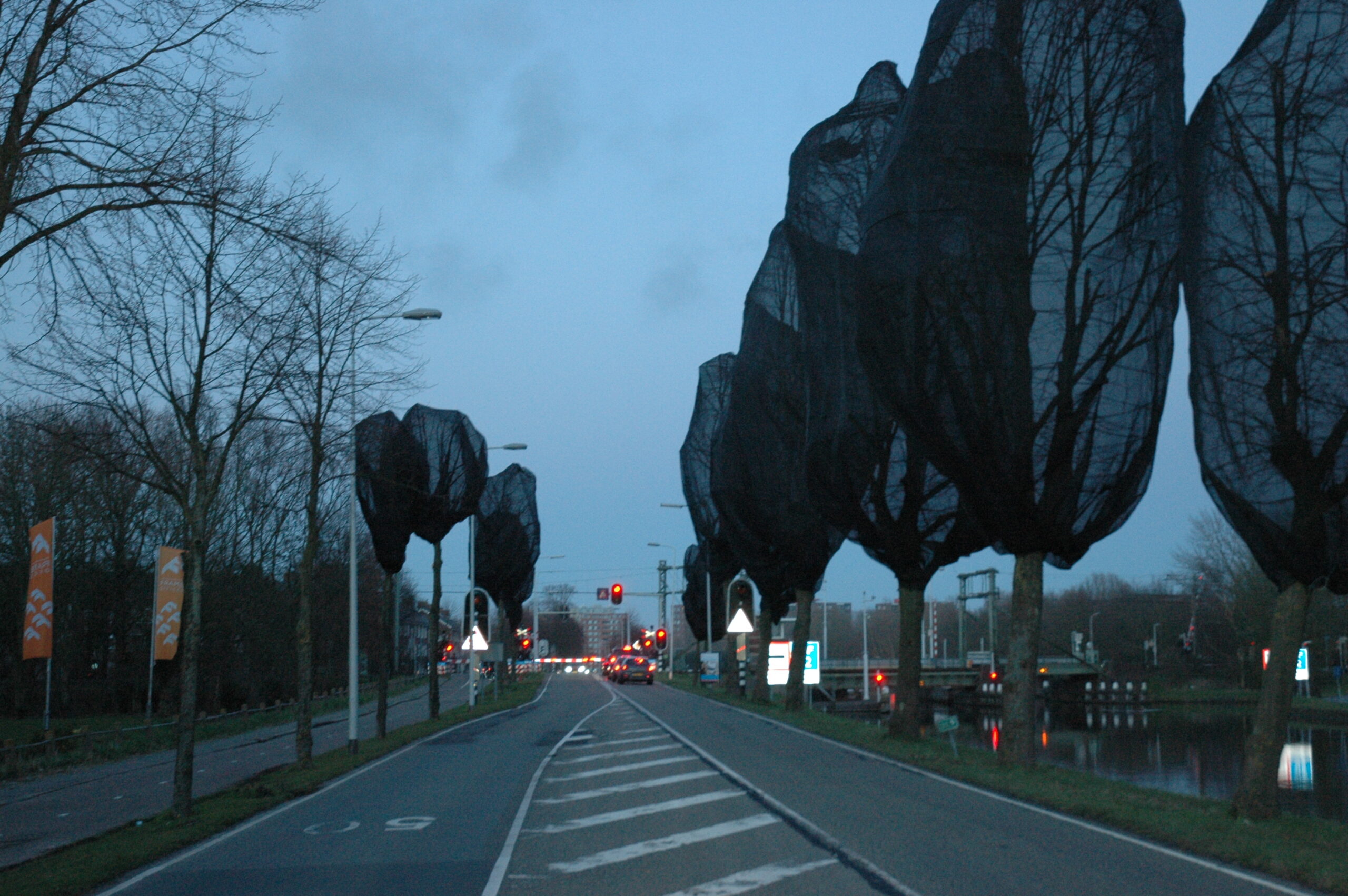 Ze worden massaal gefotografeerd. De ingepakte bomen langs de Kanaalweg ter hoogte van de spoorwegovergang. Hert lijkt wel een kunstwerk, maar de netten om de bomen hebben een heel praktische reden. Ze moeten voorkomen dat vogels een nestje bouwen in de bomen die binnenkort omgezaagd worden.