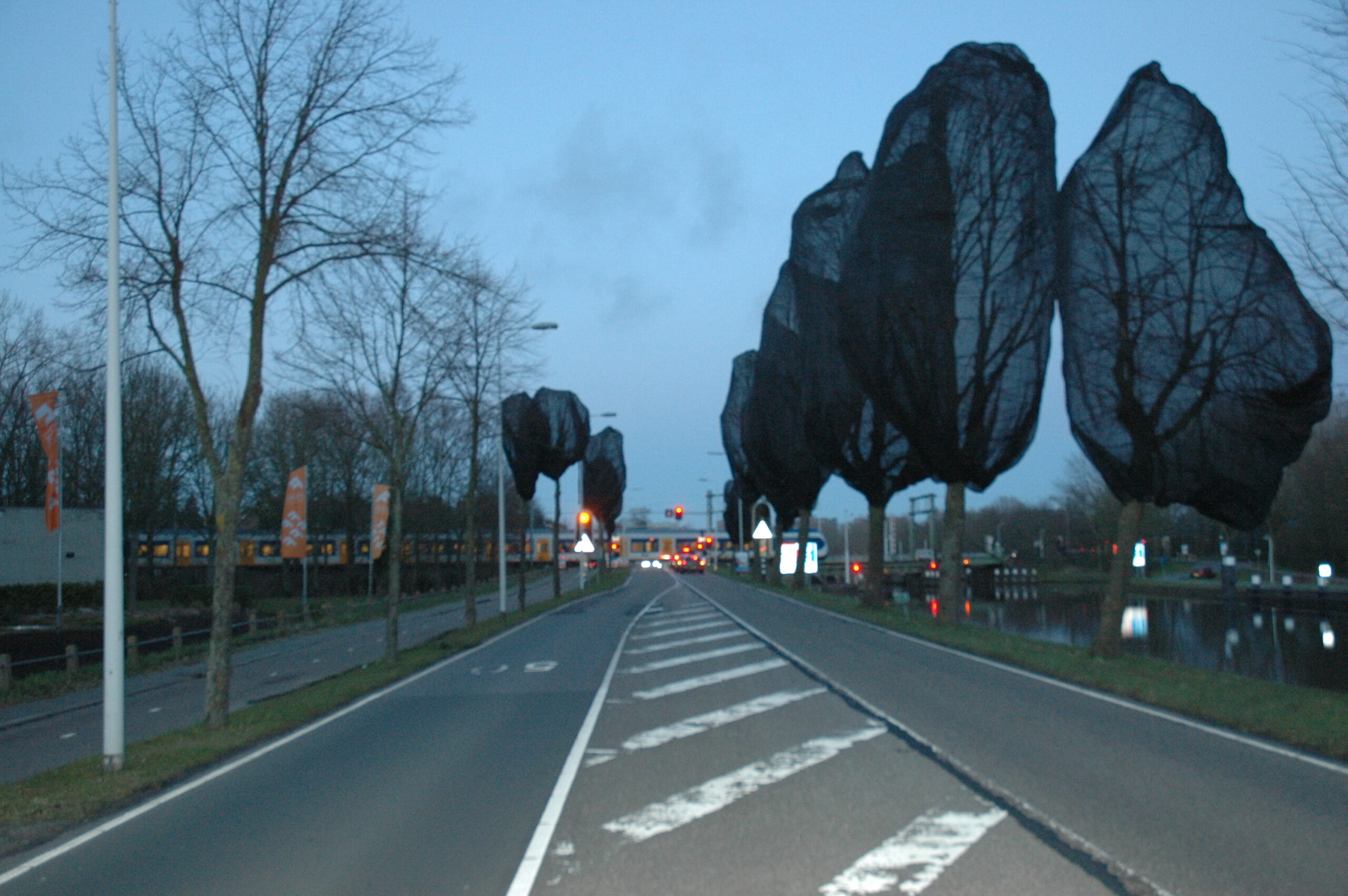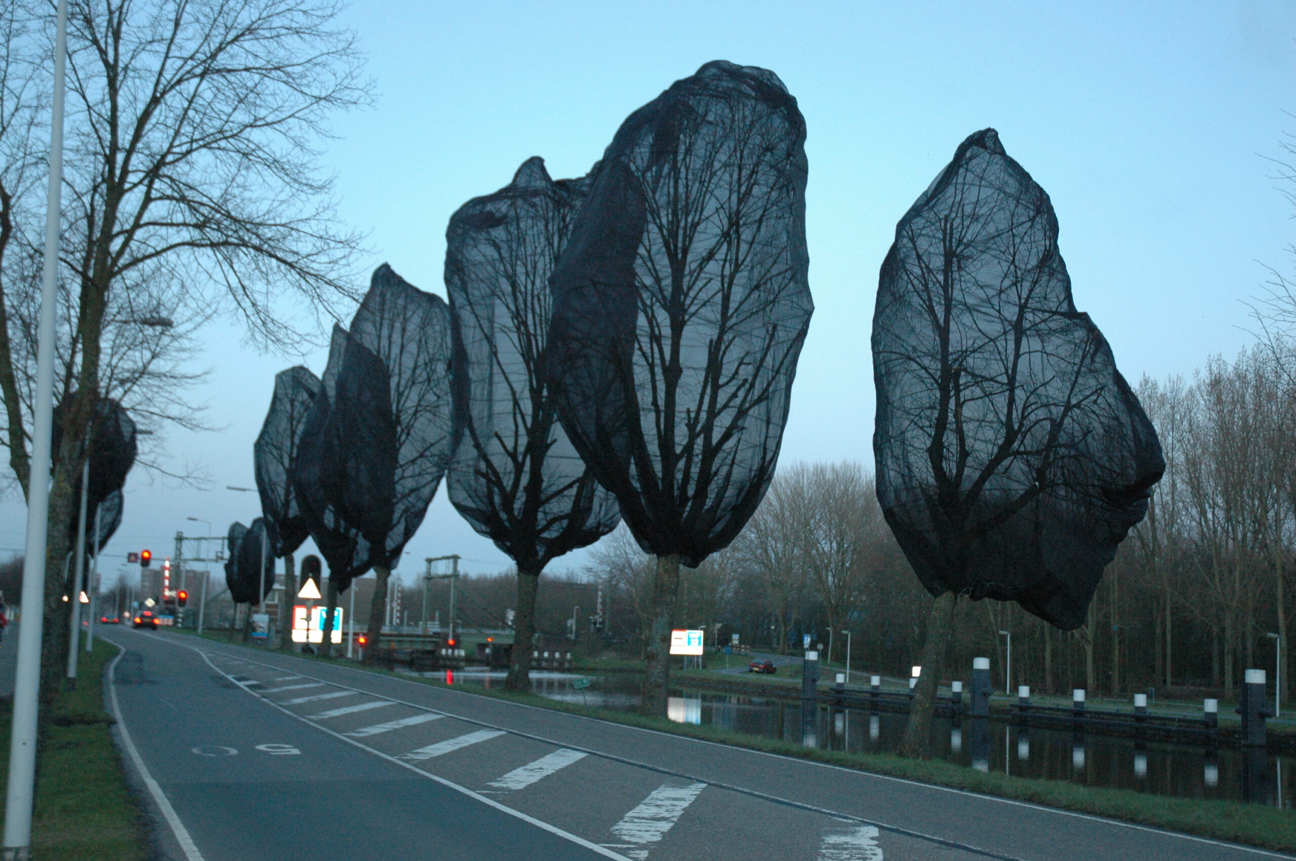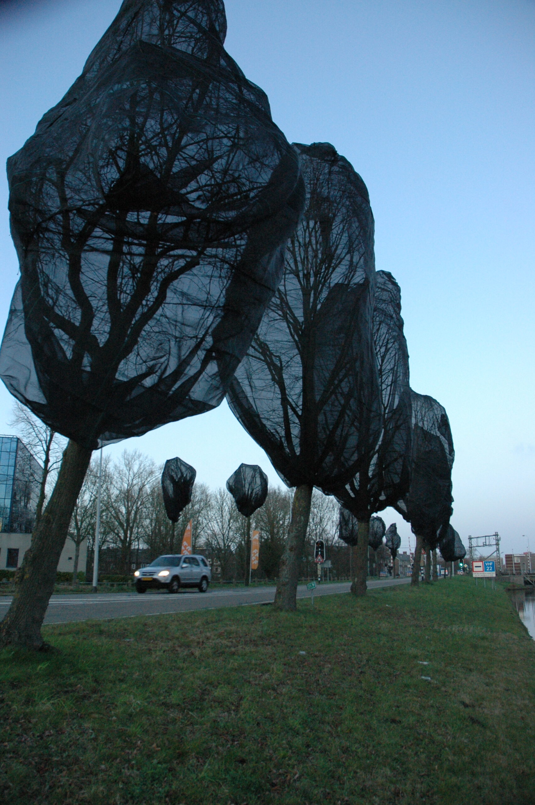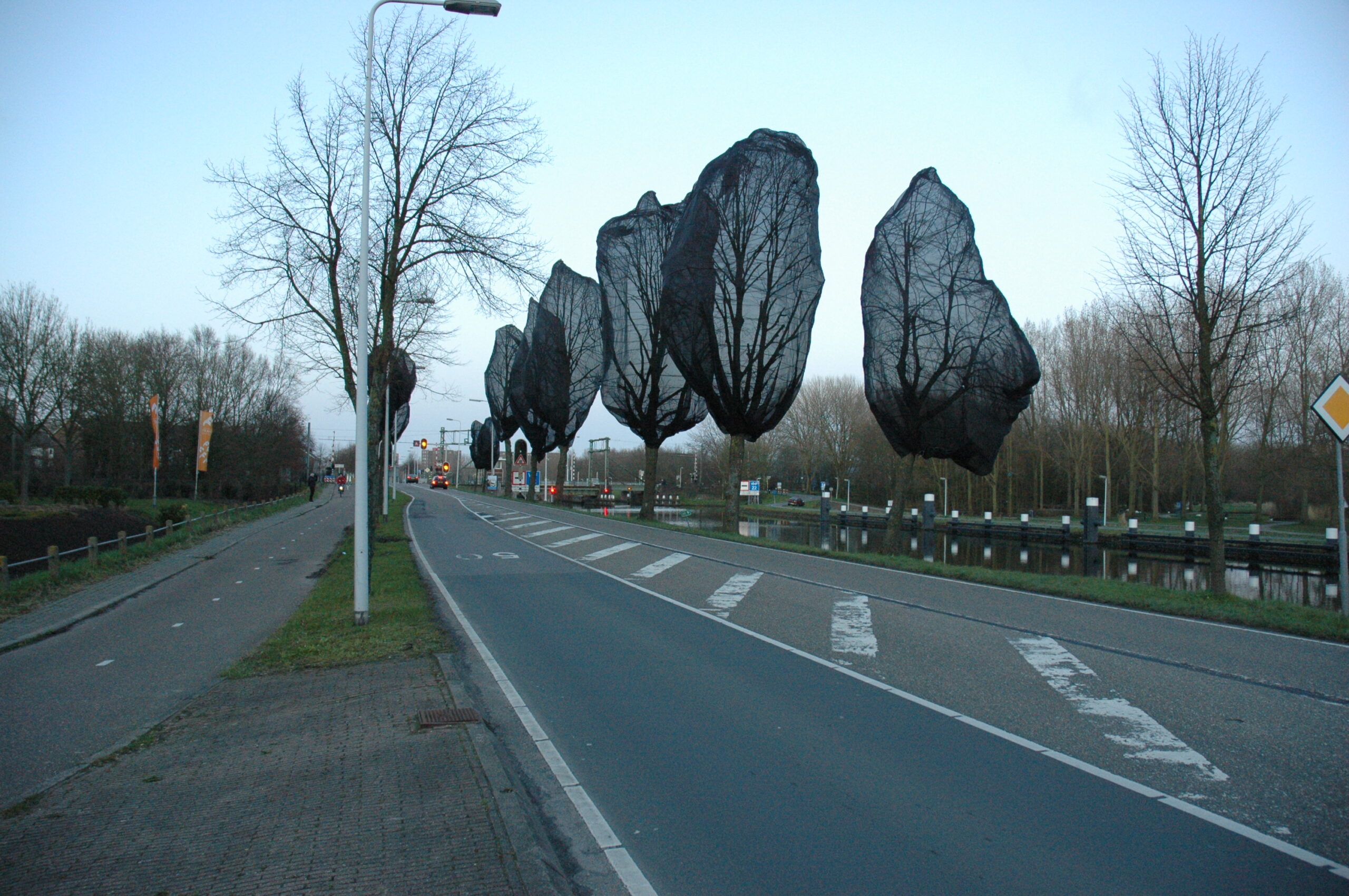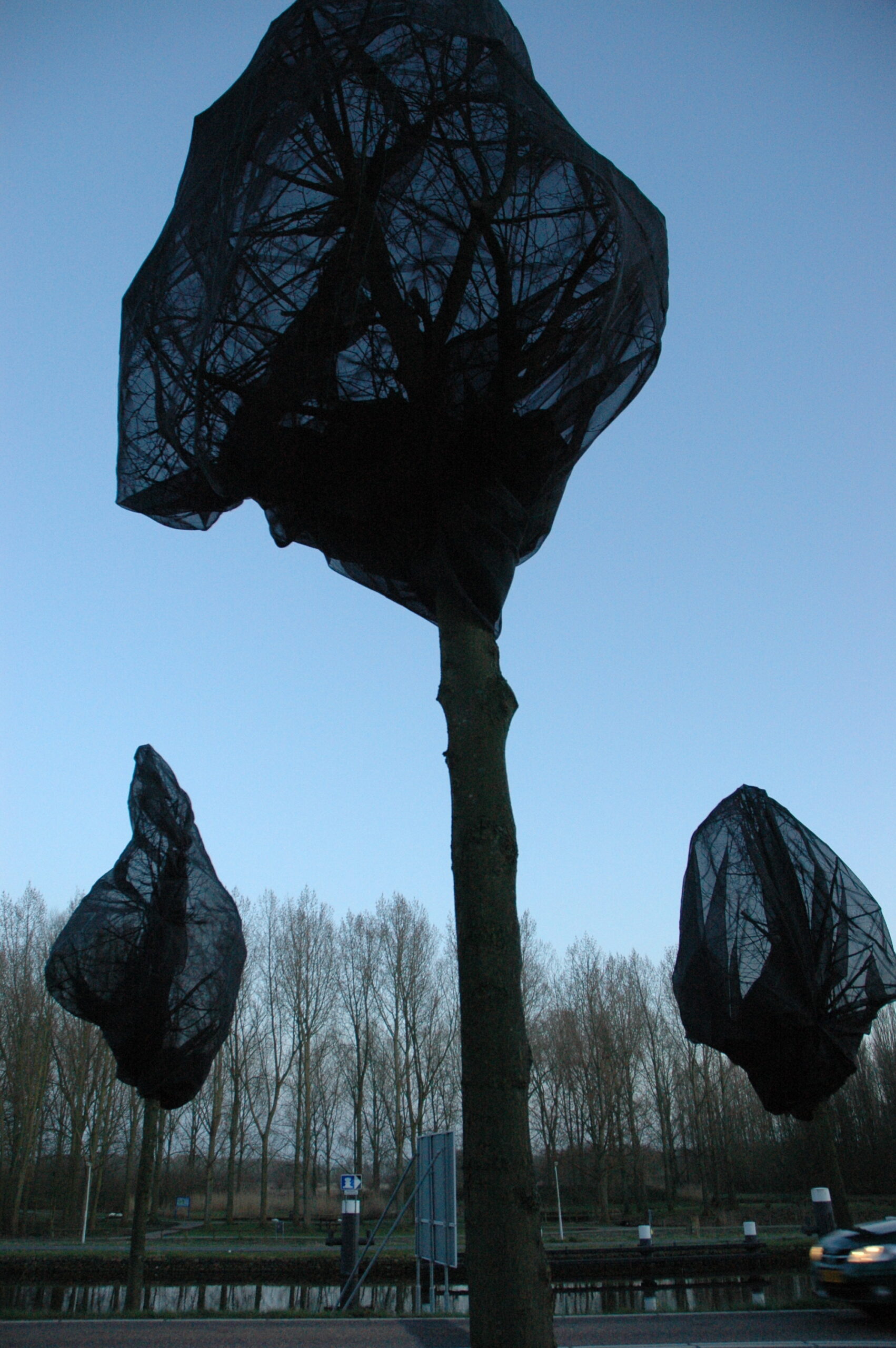 Ze worden massaal gefotografeerd. De ingepakte bomen langs de Kanaalweg ter hoogte van de spoorwegovergang. Hert lijkt wel een kunstwerk, maar de netten om de bomen hebben een heel praktische reden. Ze moeten voorkomen dat vogels een nestje bouwen in de bomen die binnenkort omgezaagd worden.