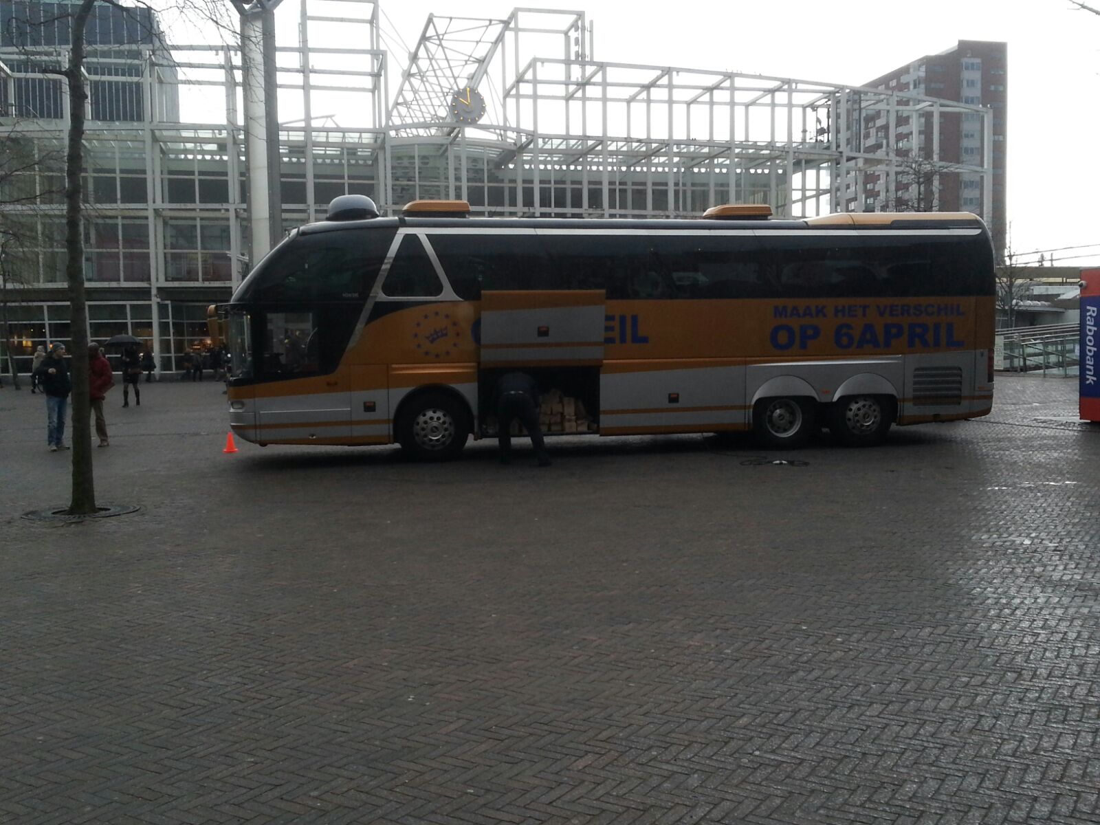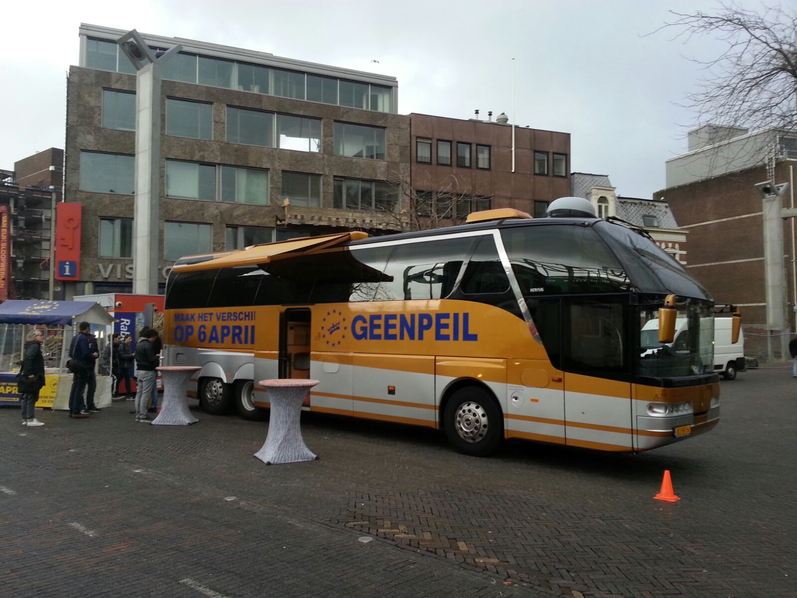 Het team van Geenpeil voert deze ochtend campagne op het Stationsplein tegen het associatieverdrag met Oekraïne, om 12.00 uur vertrekt de ploeg naar Wassenaar. Een gigantische tourbus met de leus ‘maak het verschil op 6 april’ prijkt op het plein. Op die datum kan iedereen tijdens het referendum een stem uitbrengen voor of tegen het associatieverdrag met Oekraïne.