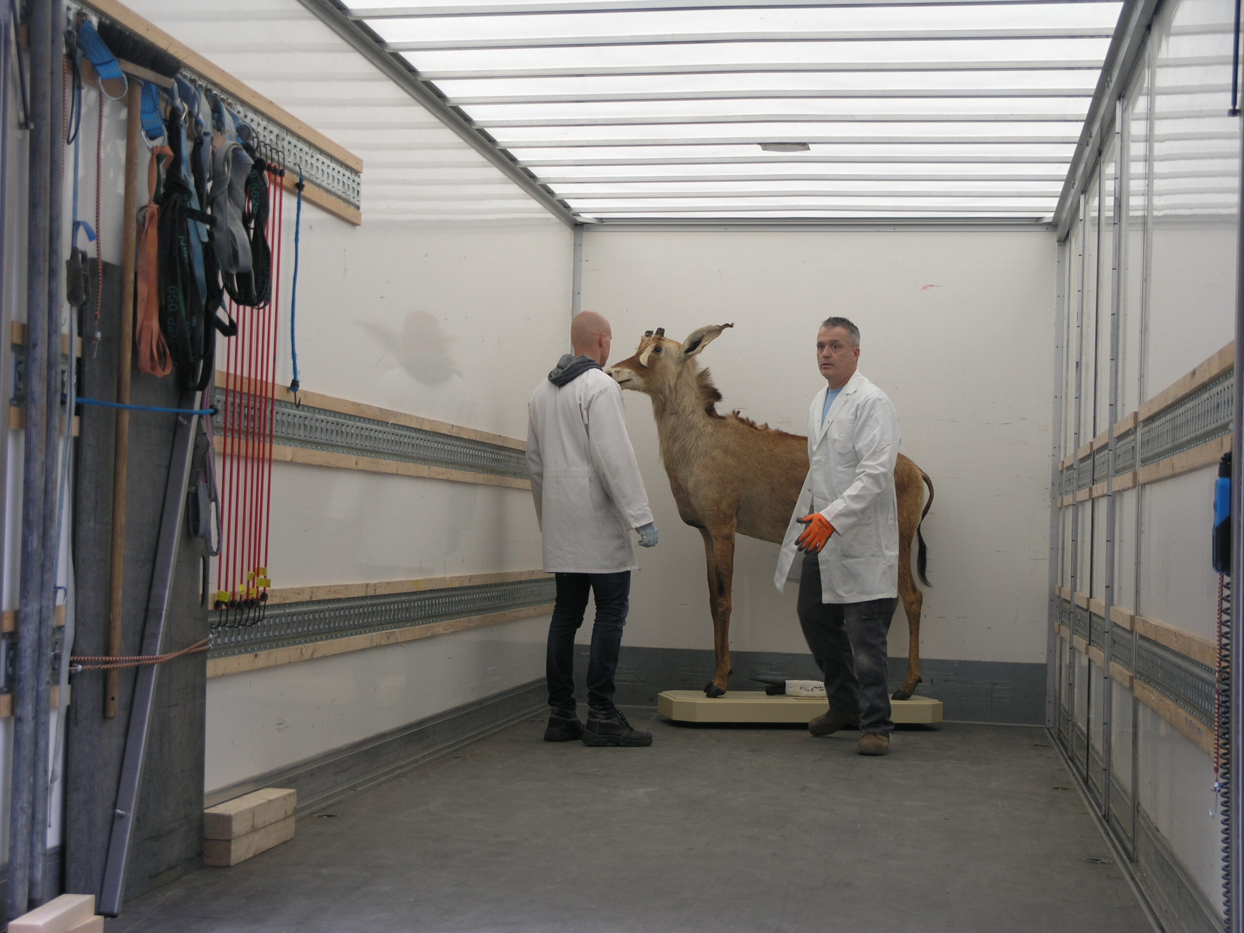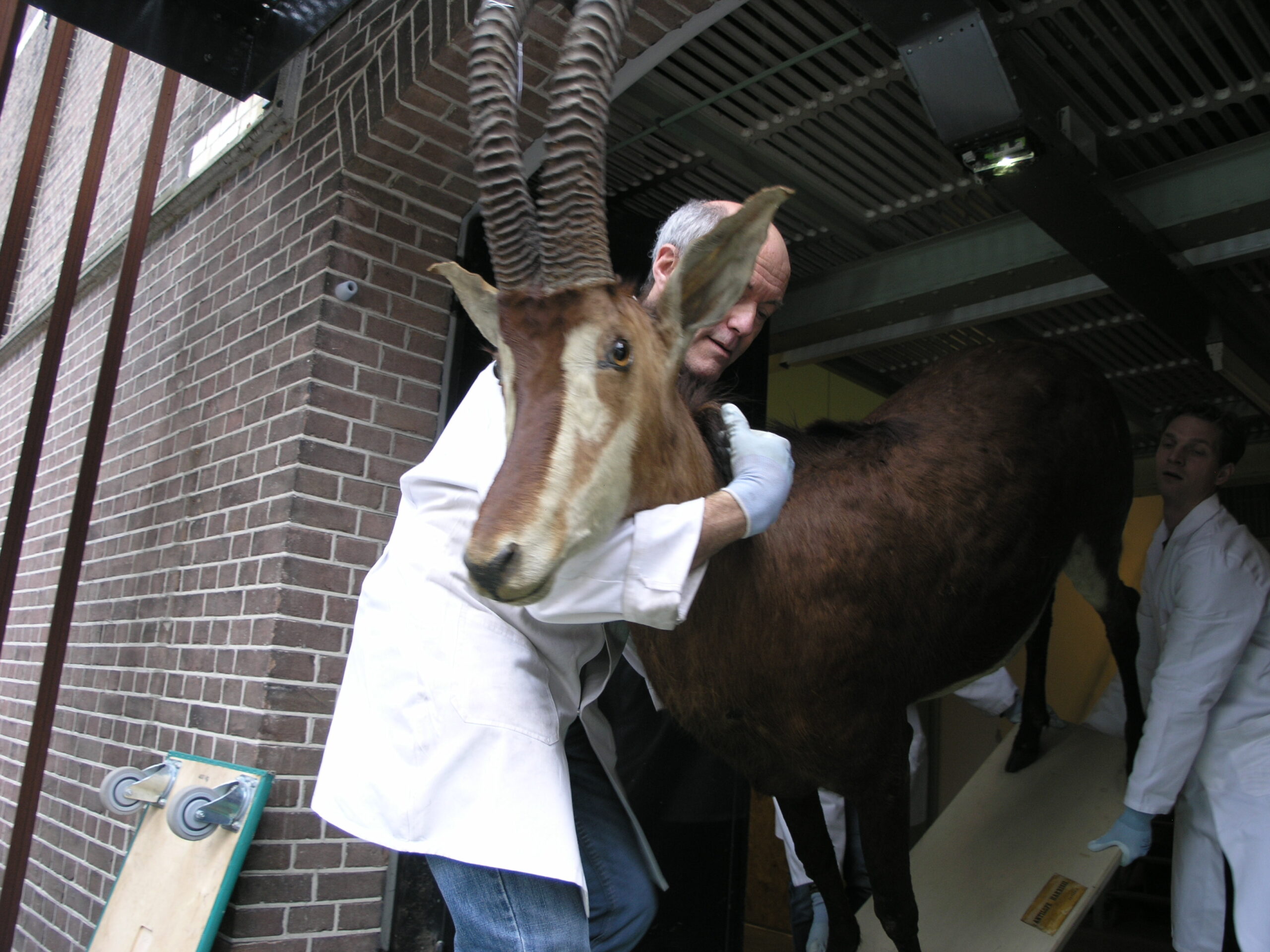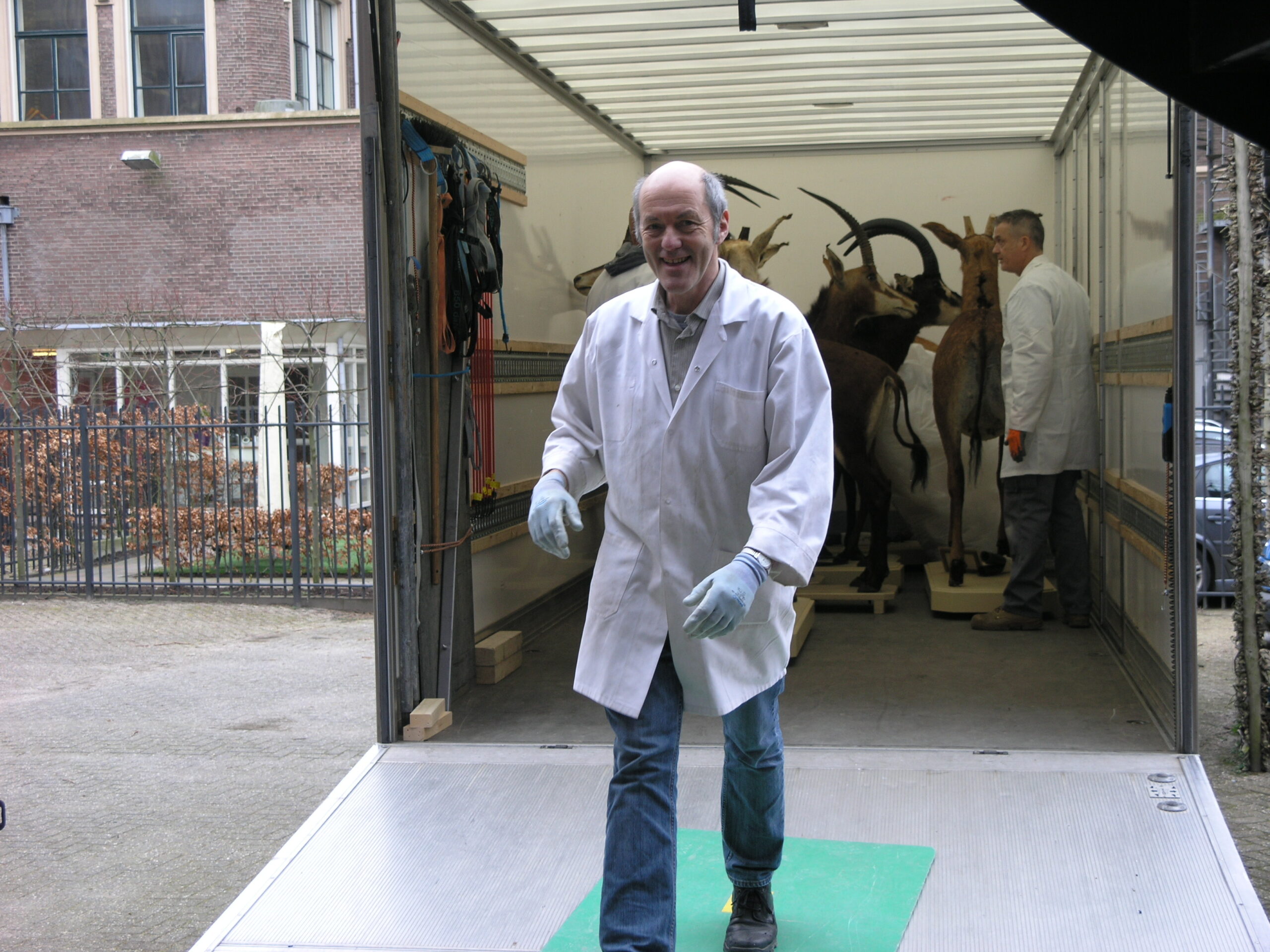 “Sommige oudere dieren zijn erg zwaar om te verplaatsen, omdat ze bijvoorbeeld zijn opgevuld met gips”, vertelt collectie manager Pepijn Kamminga. “Die dieren ben je wel echt met z’n drieën aan het sjouwen. De recenter opgezette dieren zijn gelukkig wat lichter, die zijn vaak opgevuld met piepschuim of andere kunststoffen.” Gisteren werd er alleen ruim tien keer heen en weer gereden tussen de Raamsteeg en de Darwinweg om de objecten te verhuizen.