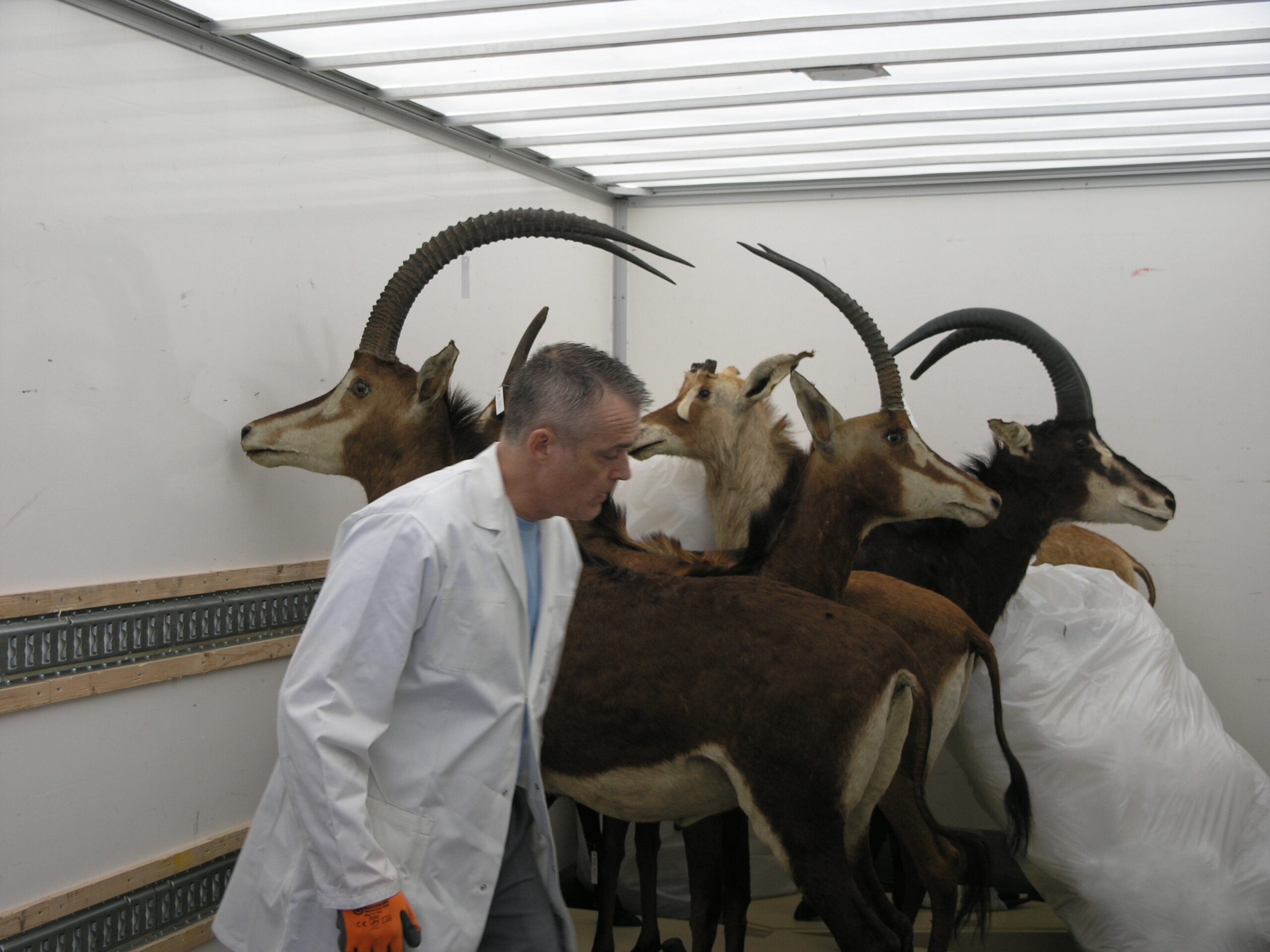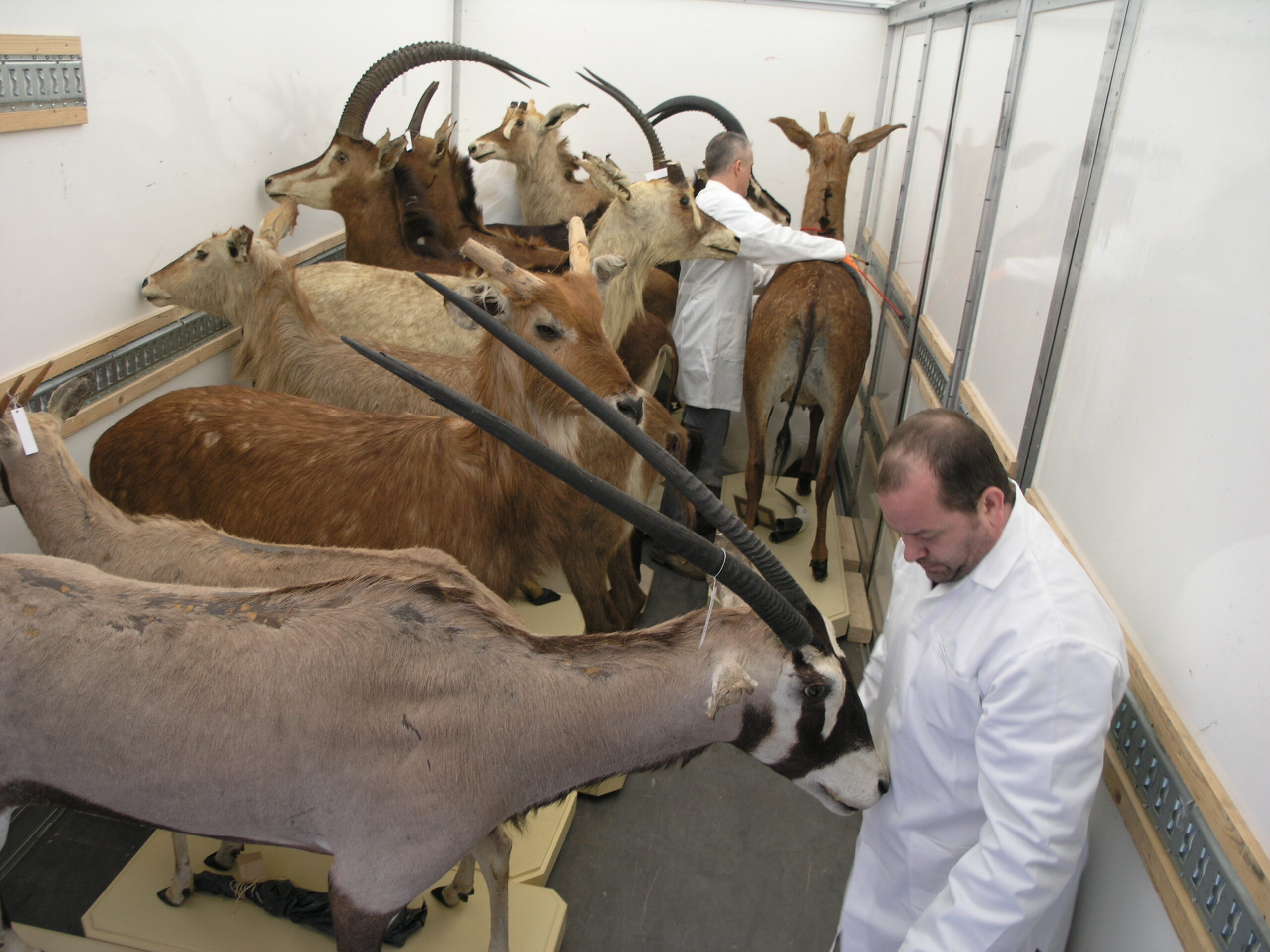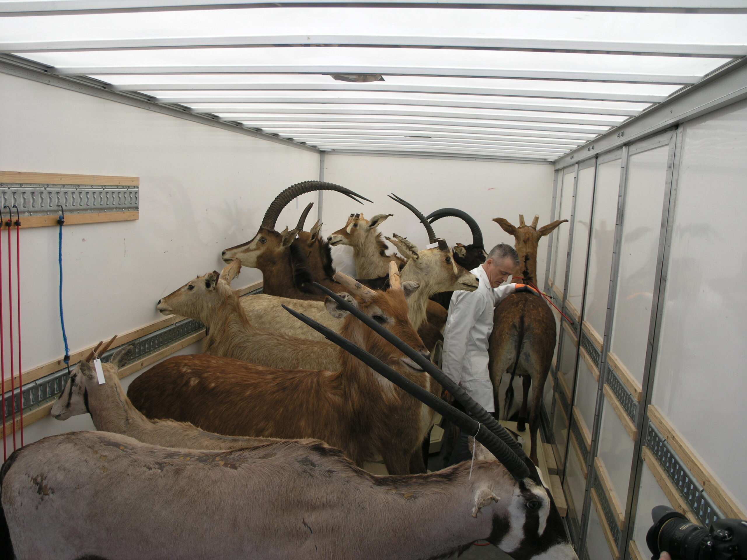 “Sommige oudere dieren zijn erg zwaar om te verplaatsen, omdat ze bijvoorbeeld zijn opgevuld met gips”, vertelt collectie manager Pepijn Kamminga. “Die dieren ben je wel echt met z’n drieën aan het sjouwen. De recenter opgezette dieren zijn gelukkig wat lichter, die zijn vaak opgevuld met piepschuim of andere kunststoffen.” Gisteren werd er alleen ruim tien keer heen en weer gereden tussen de Raamsteeg en de Darwinweg om de objecten te verhuizen.