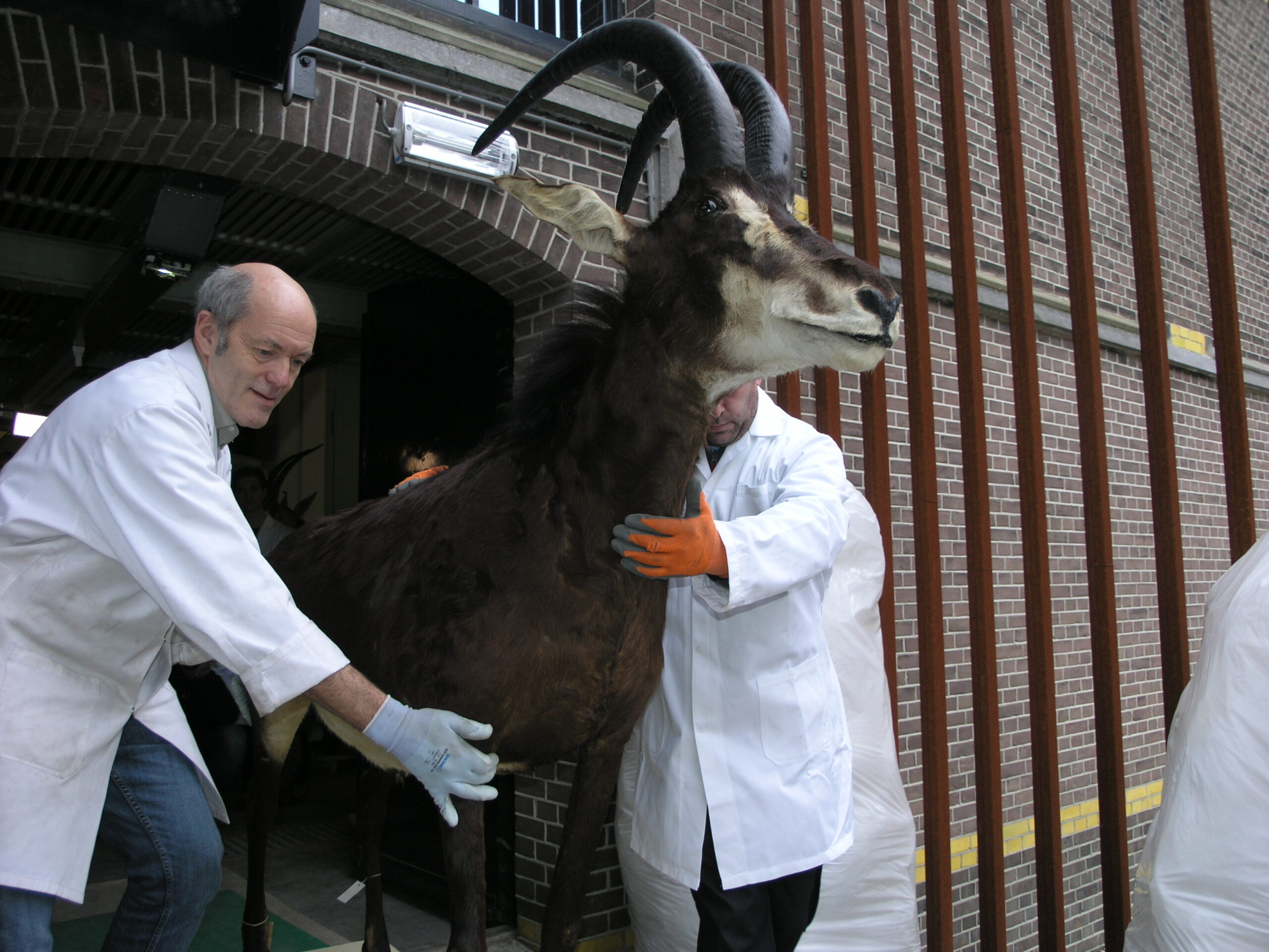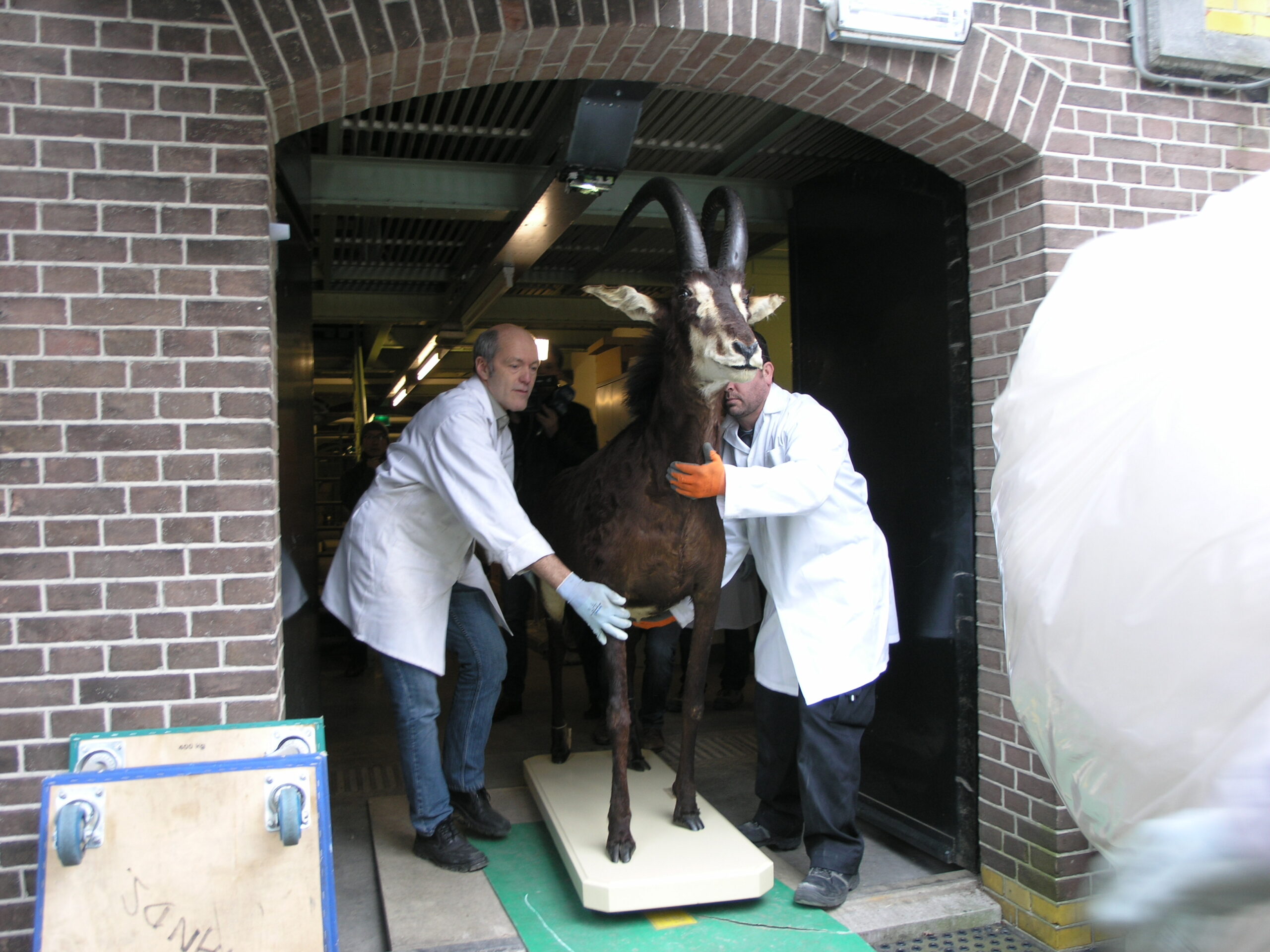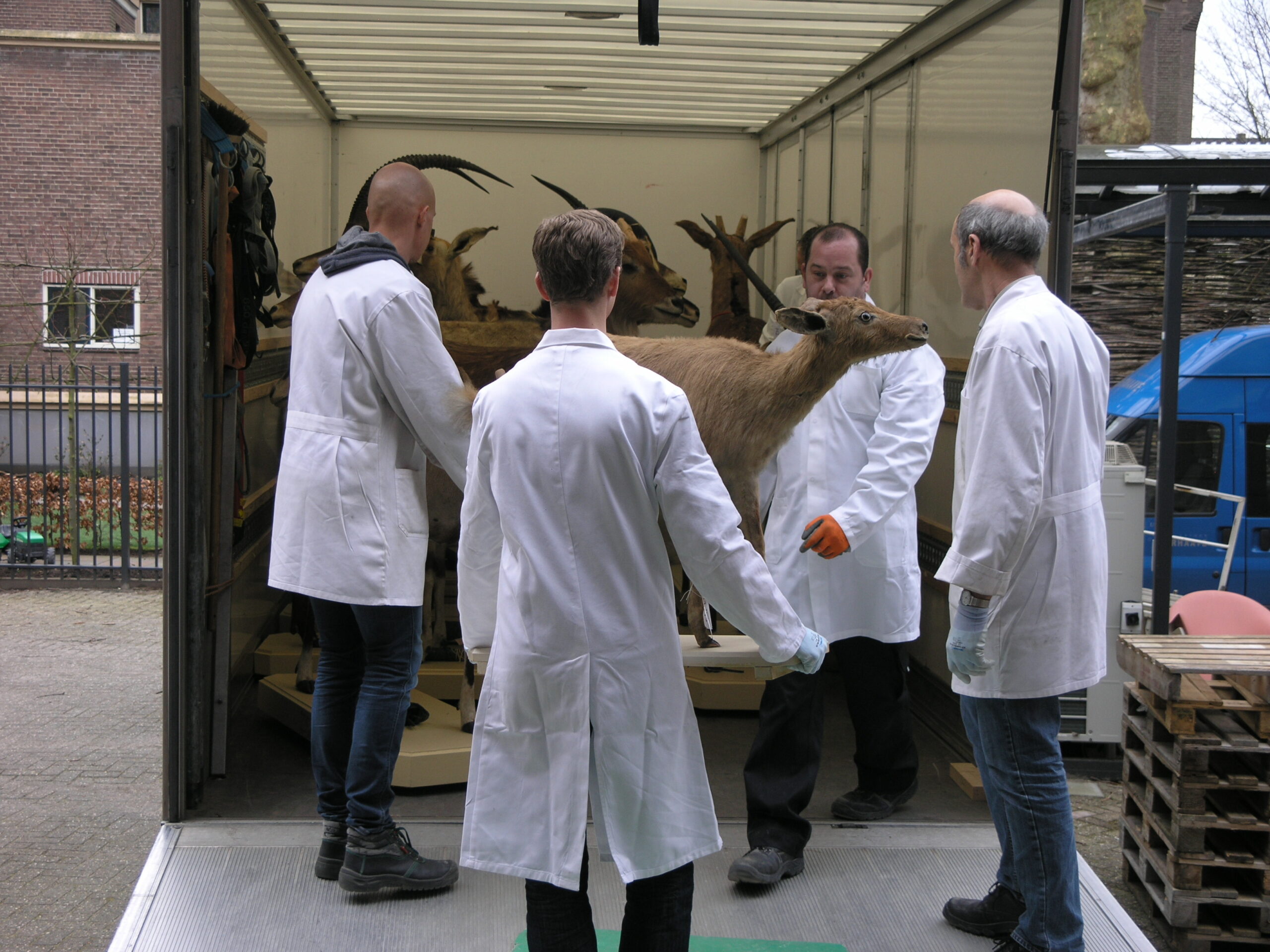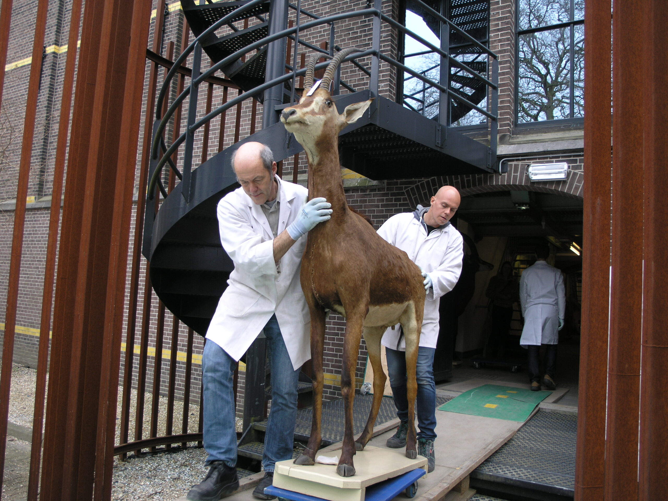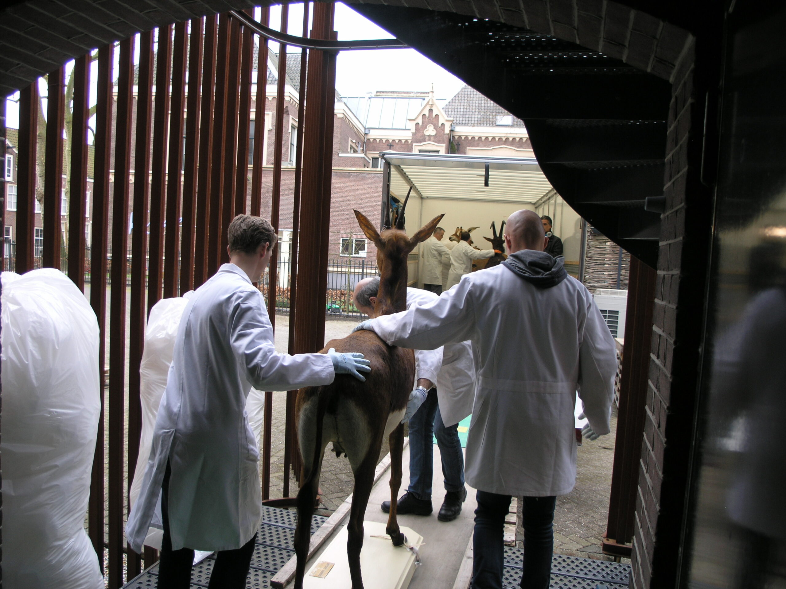 De collectie opgezette dieren van Naturalis die in het depot in het oude pand aan de Raamsteeg staat, wordt verhuist naar het museumpand aan de Darwinweg. De verhuizing is al een paar dagen aan de gang. Gisteren werden honderden hoefdieren verhuist, van damherten en elanden tot antilopes. Naturalis stopt, na ruim honderd jaar gebruik, met de huur van het pand aan de Raamsteeg.