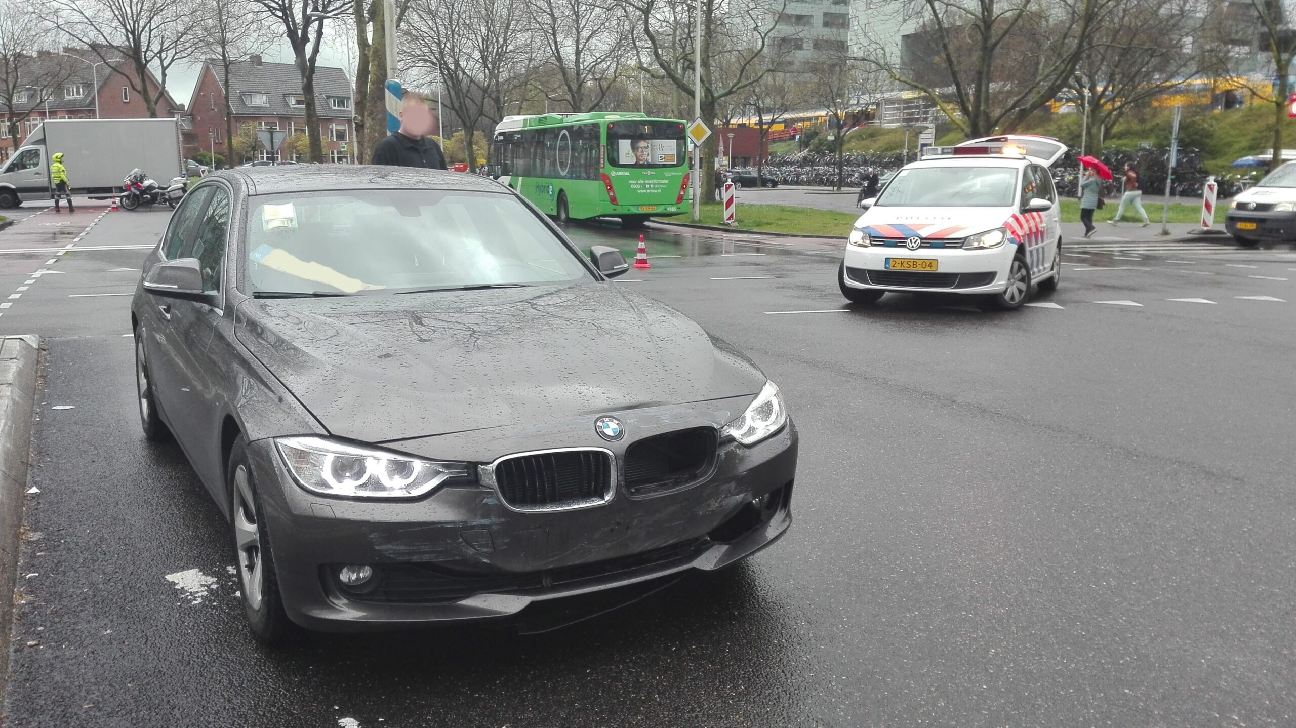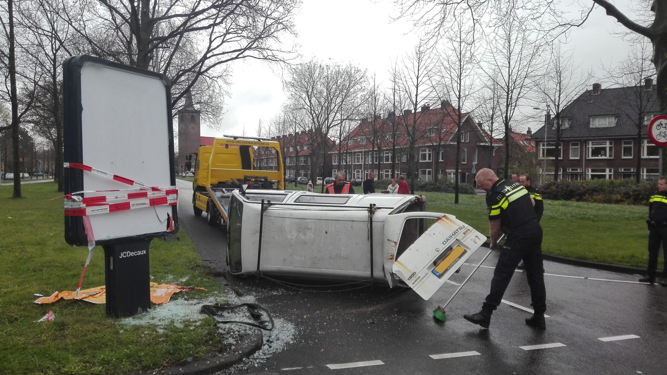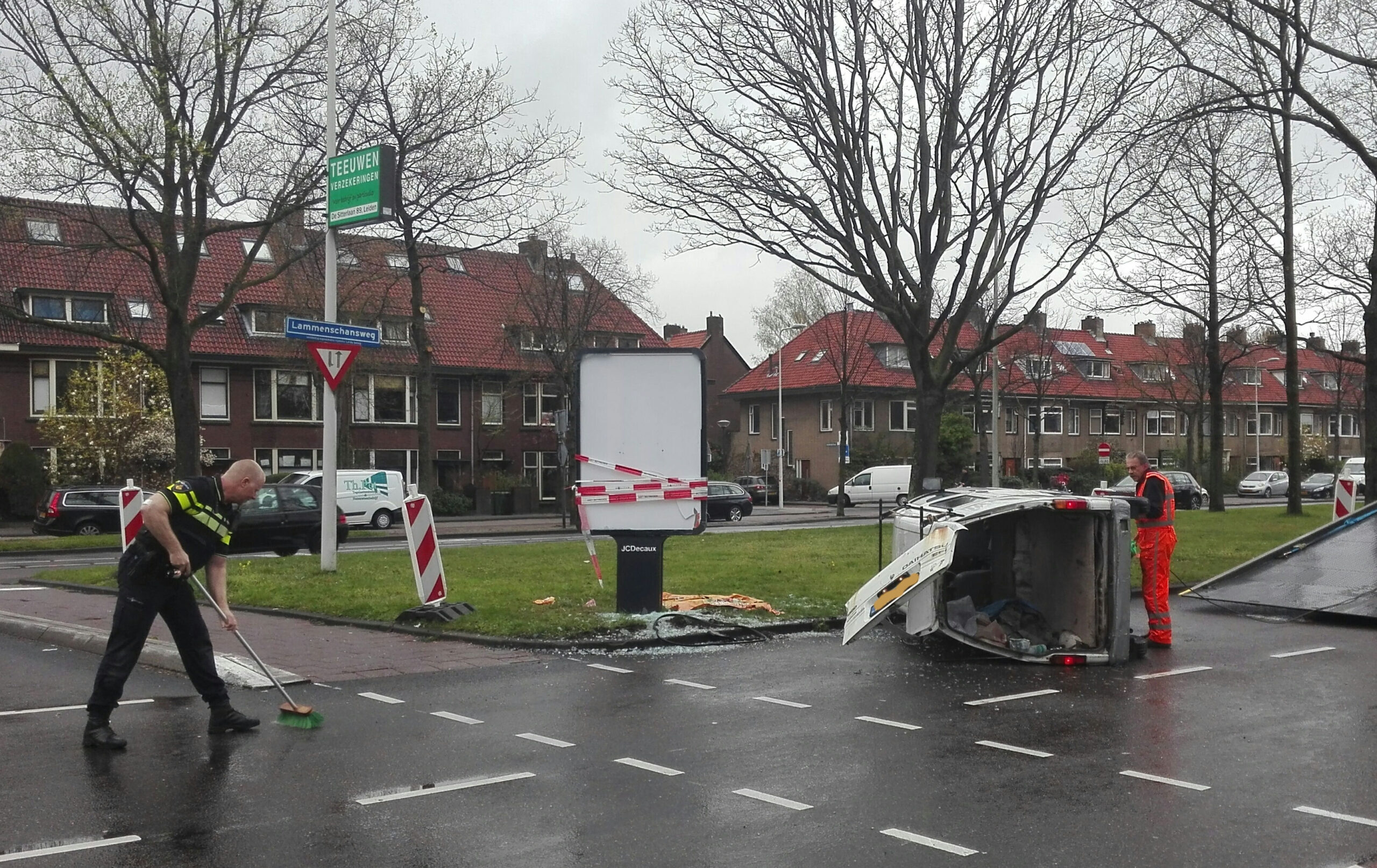 Een auto en een busje zijn vanmorgen rond 11.30 uur op elkaar gebotst op de kruising van de Lammenschansweg met de Sitterlaan. Door de klap raakte het busje de abri die op de middenberm staat en sloeg om.