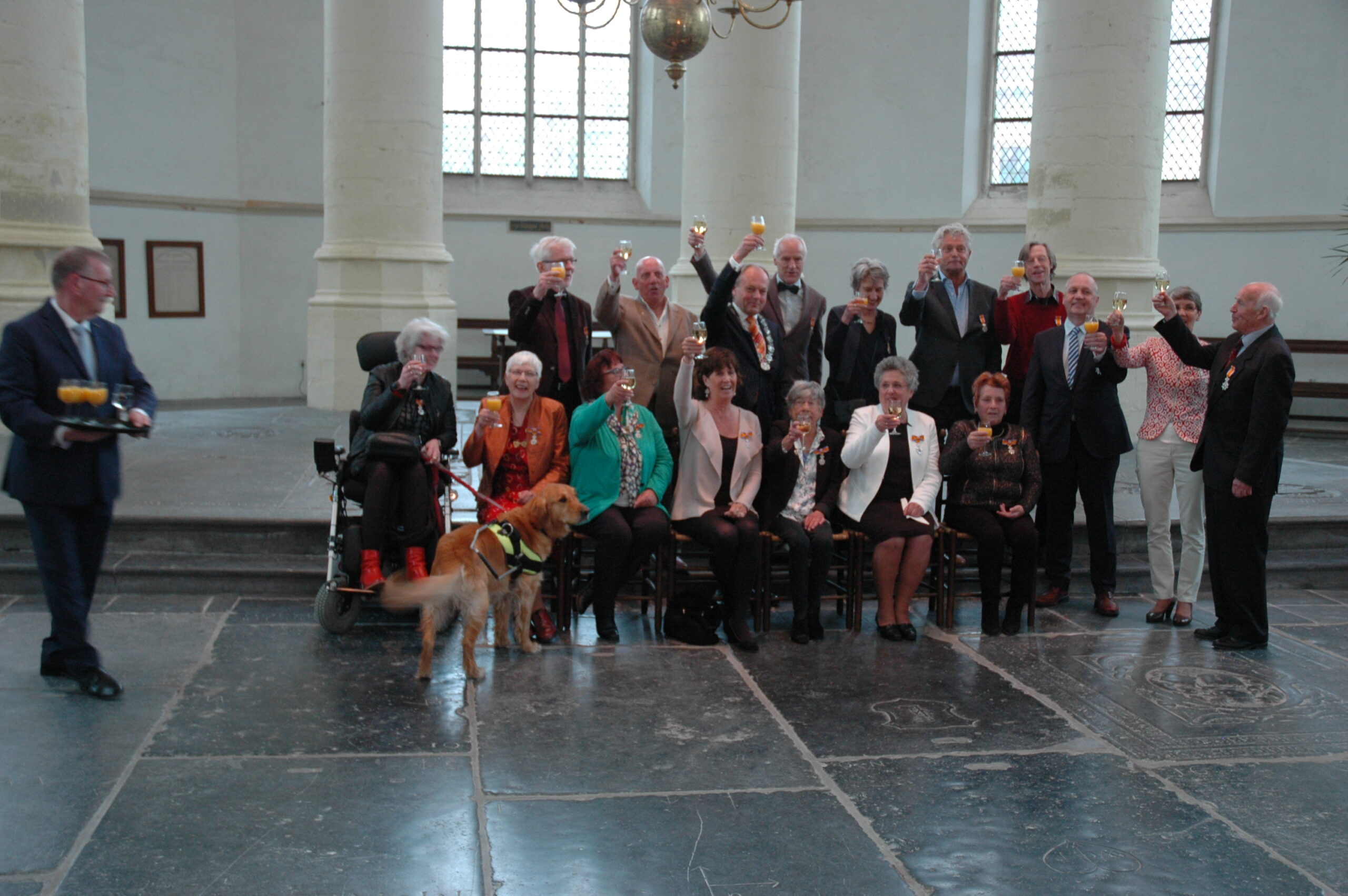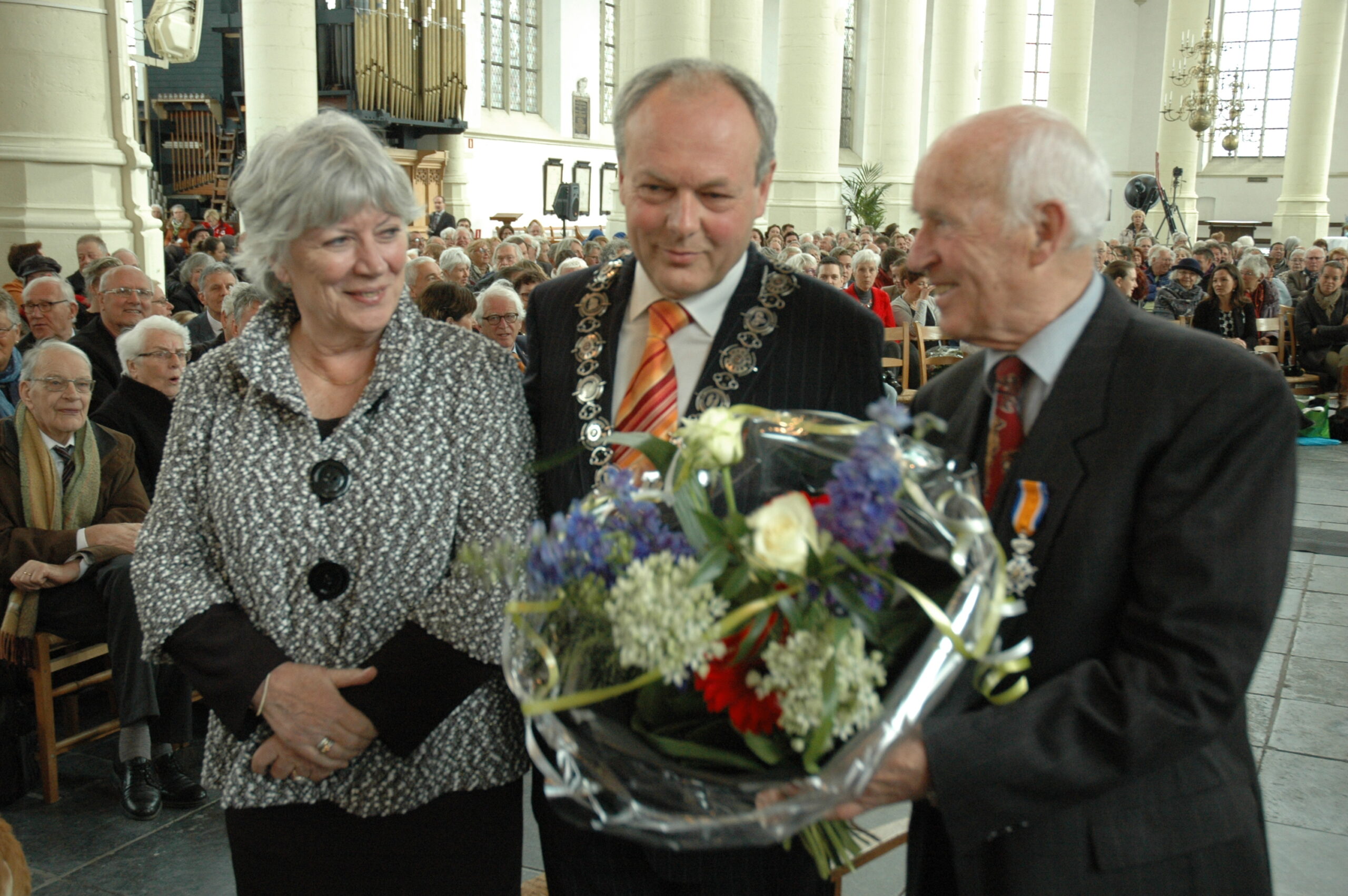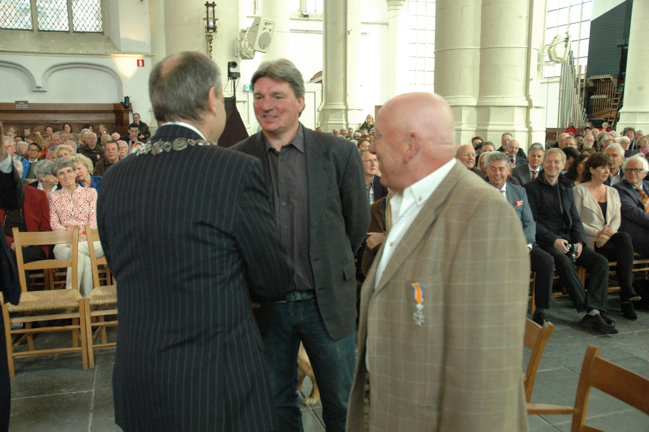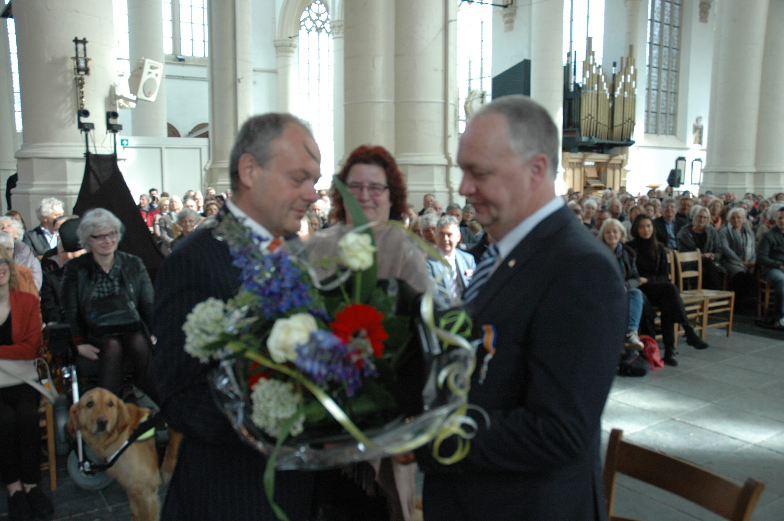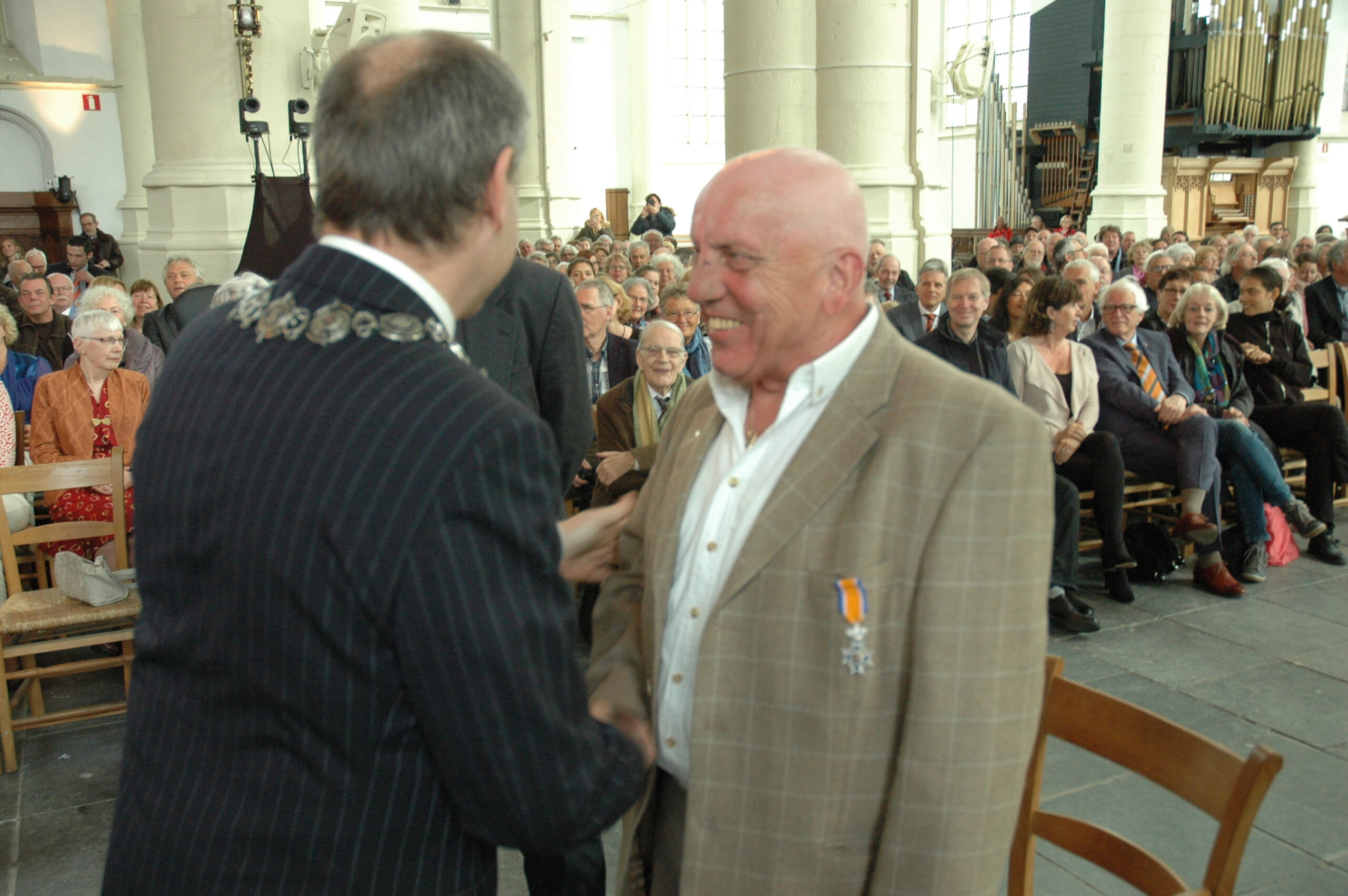 Chris de Waard ging vanmorgen naar de Hooglandse Kerk en sprak na de toespraken met drie gedecoreerden, Cor Arnoldus, Wils Spies en Kees Botermans, en met burgemeester Lenferink.