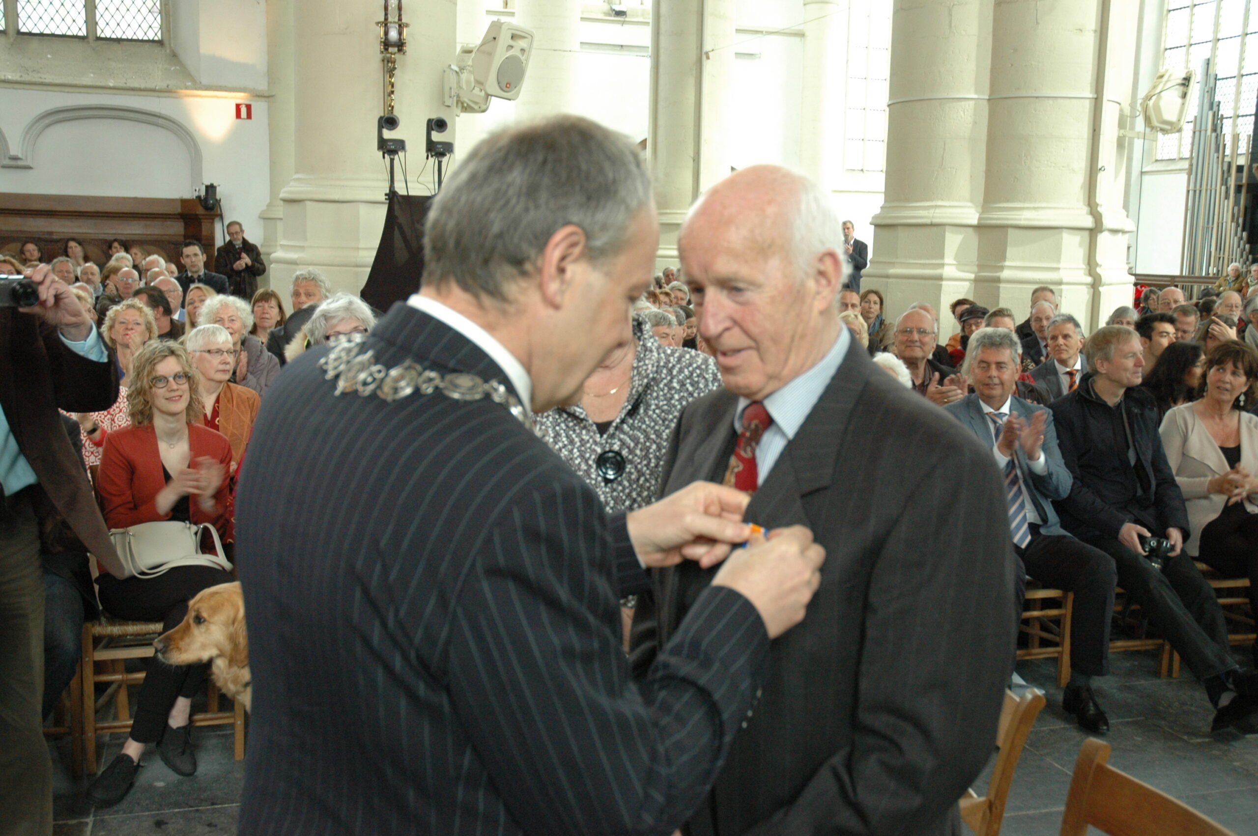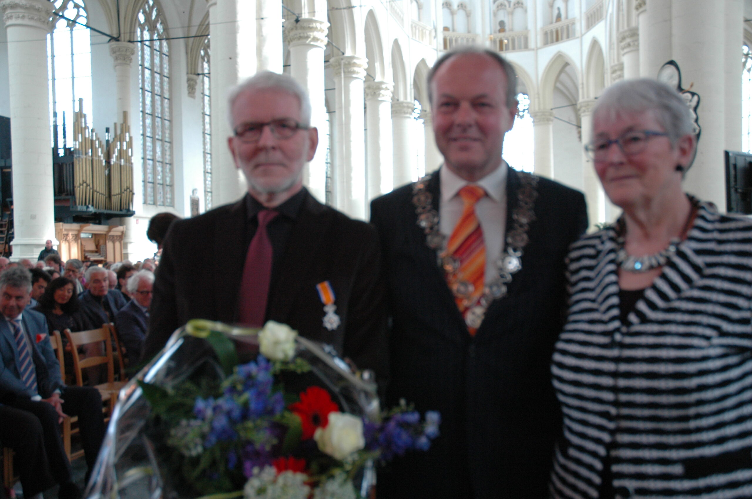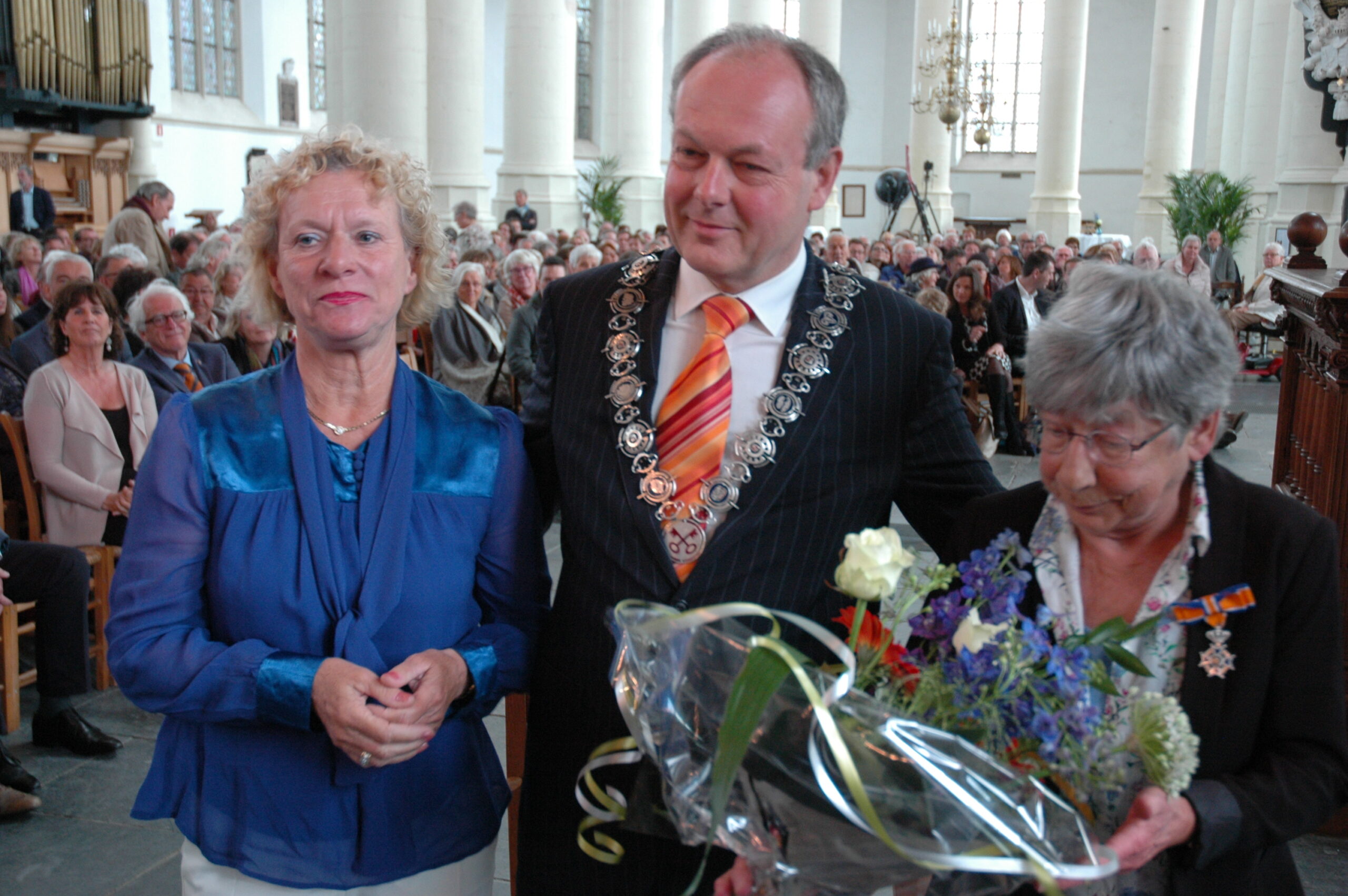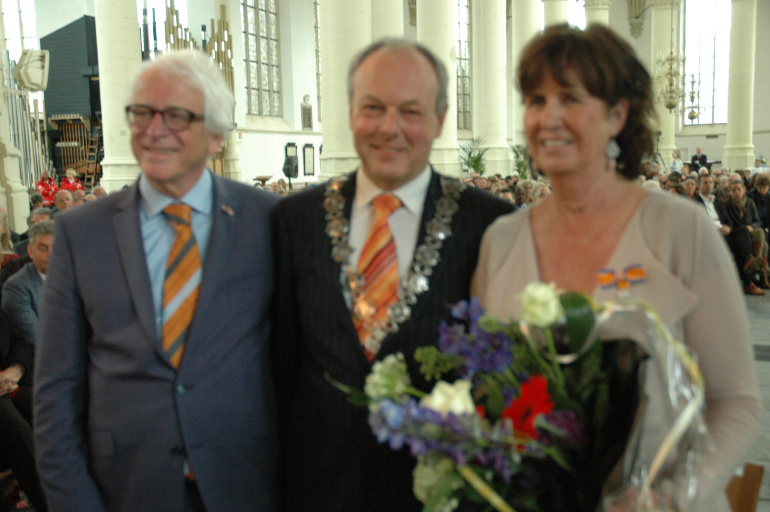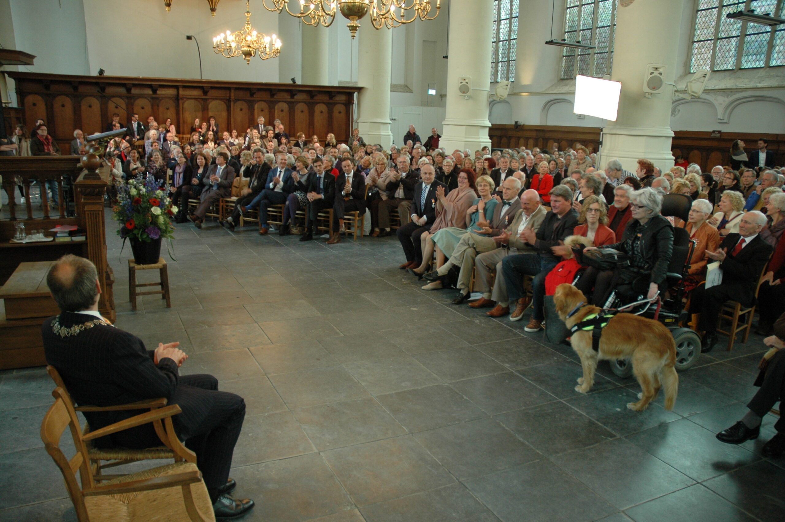 Chris de Waard ging vanmorgen naar de Hooglandse Kerk en sprak na de toespraken met drie gedecoreerden, Cor Arnoldus, Wils Spies en Kees Botermans, en met burgemeester Lenferink.