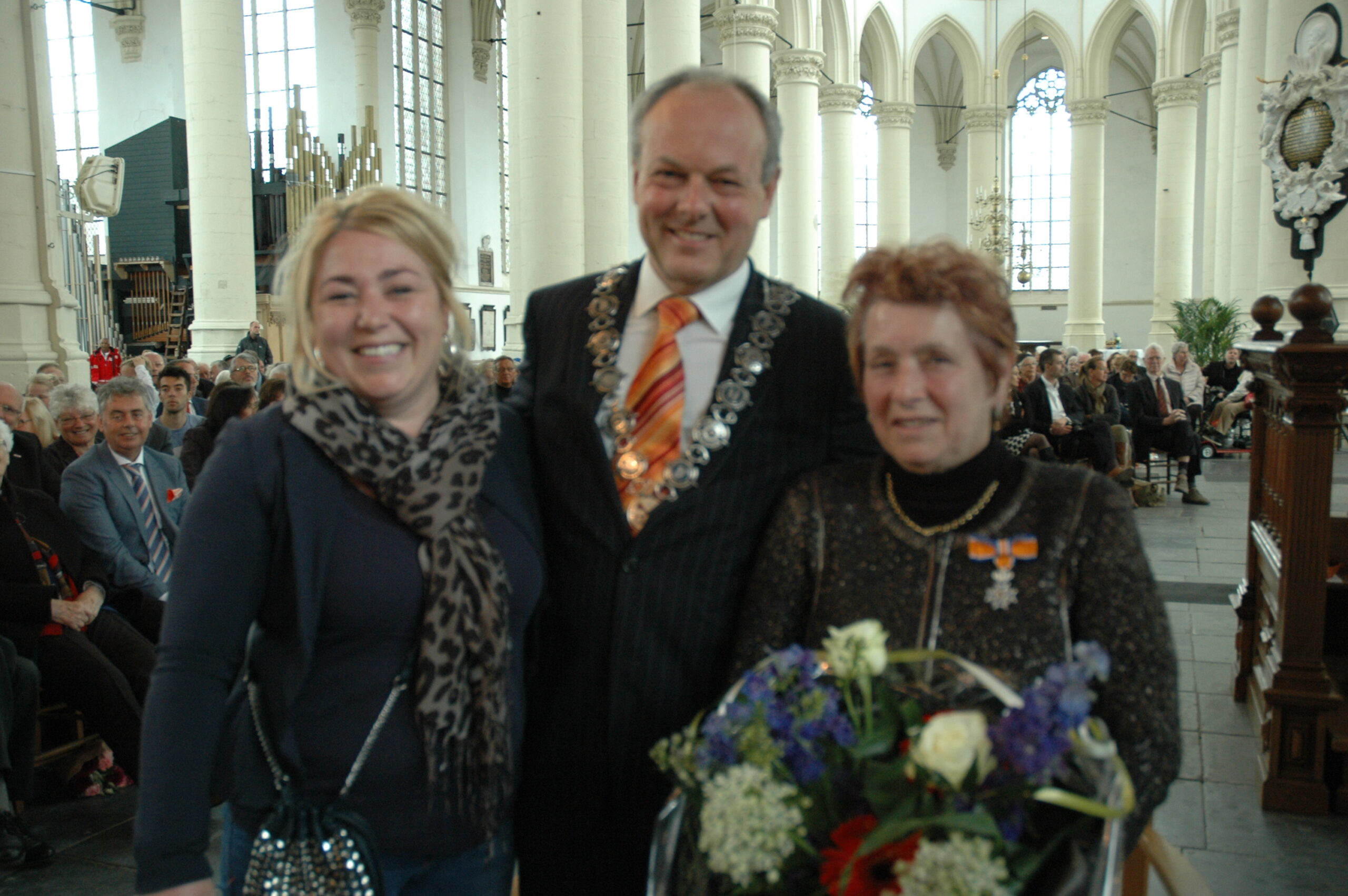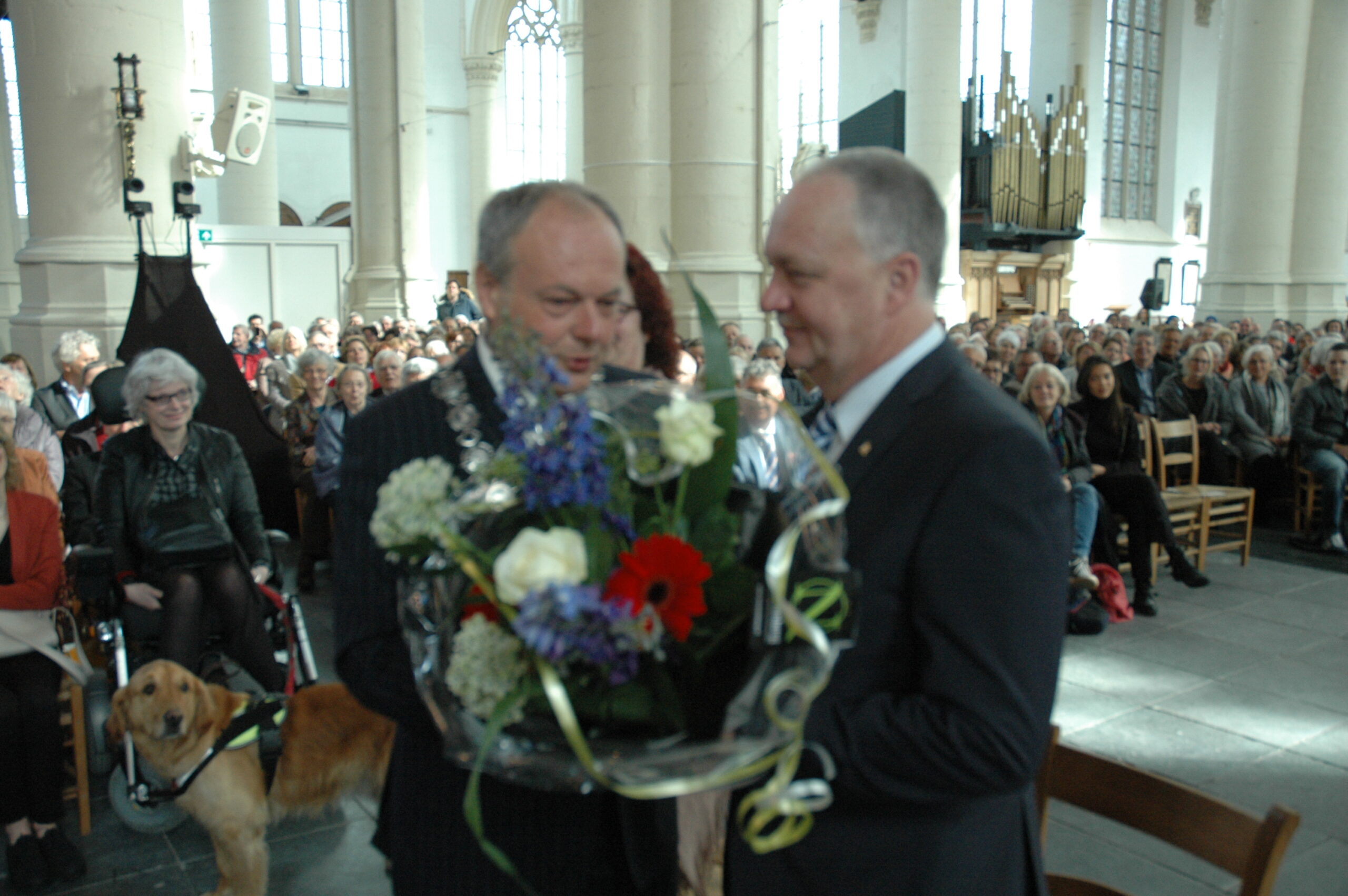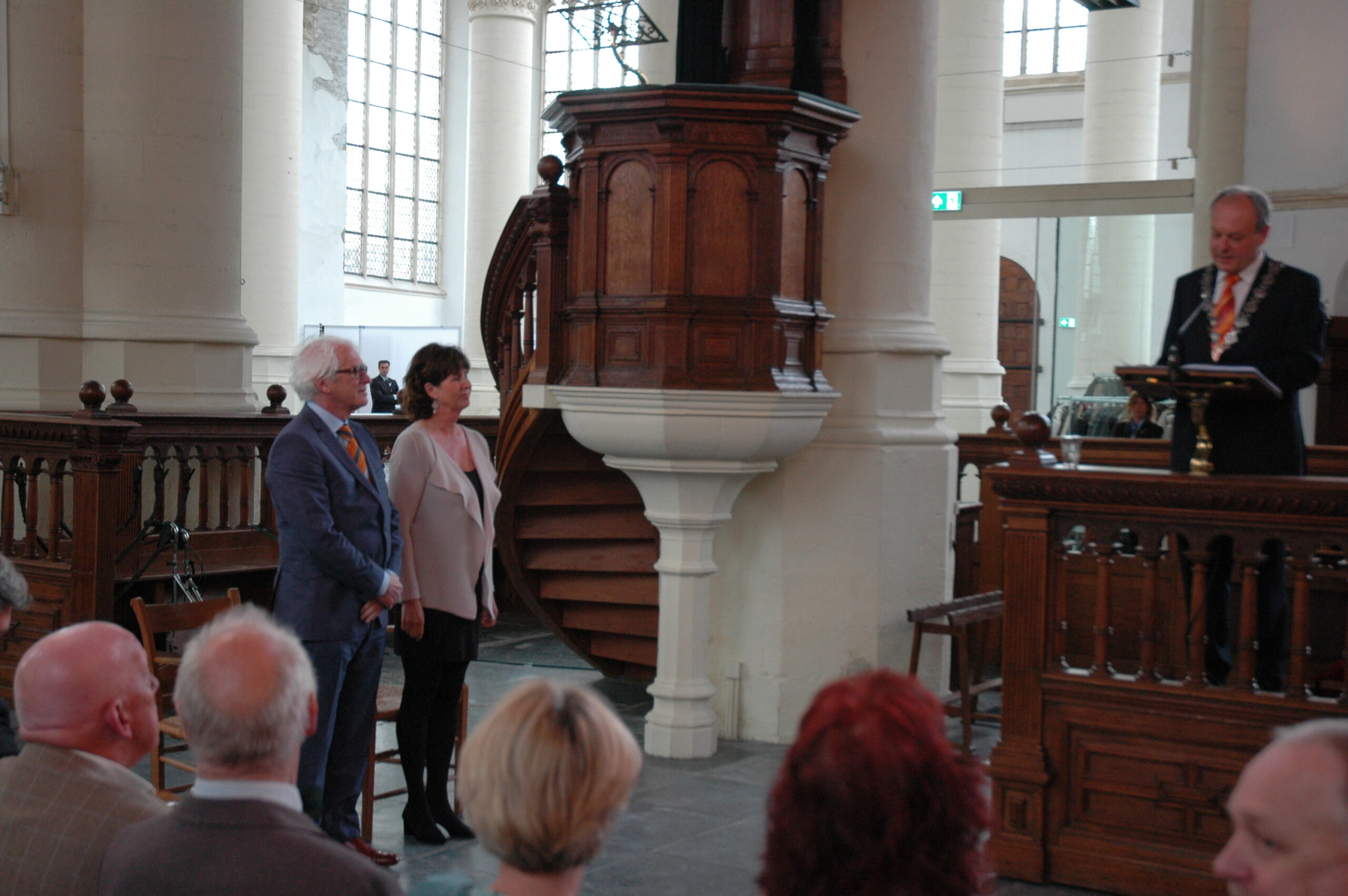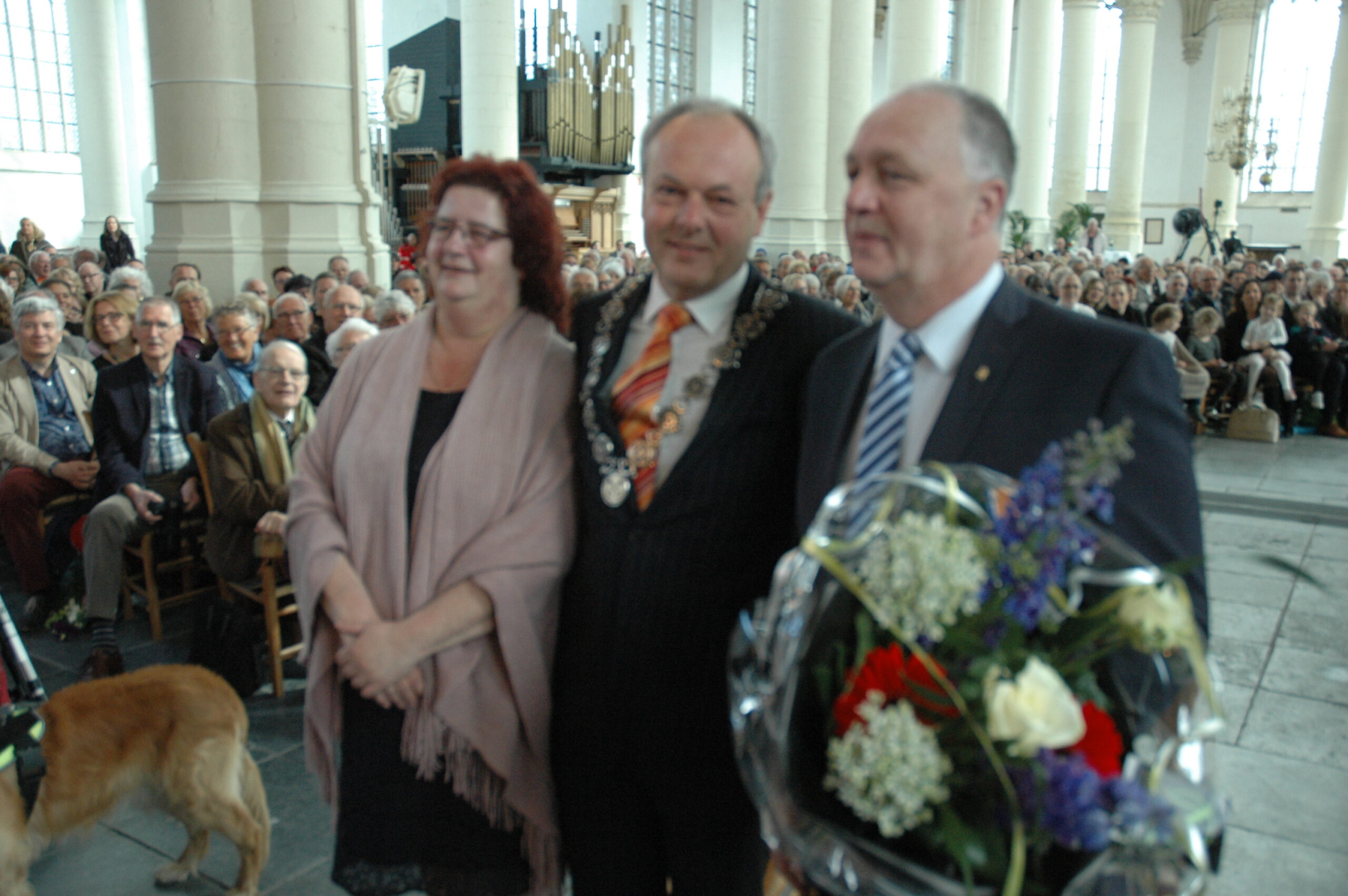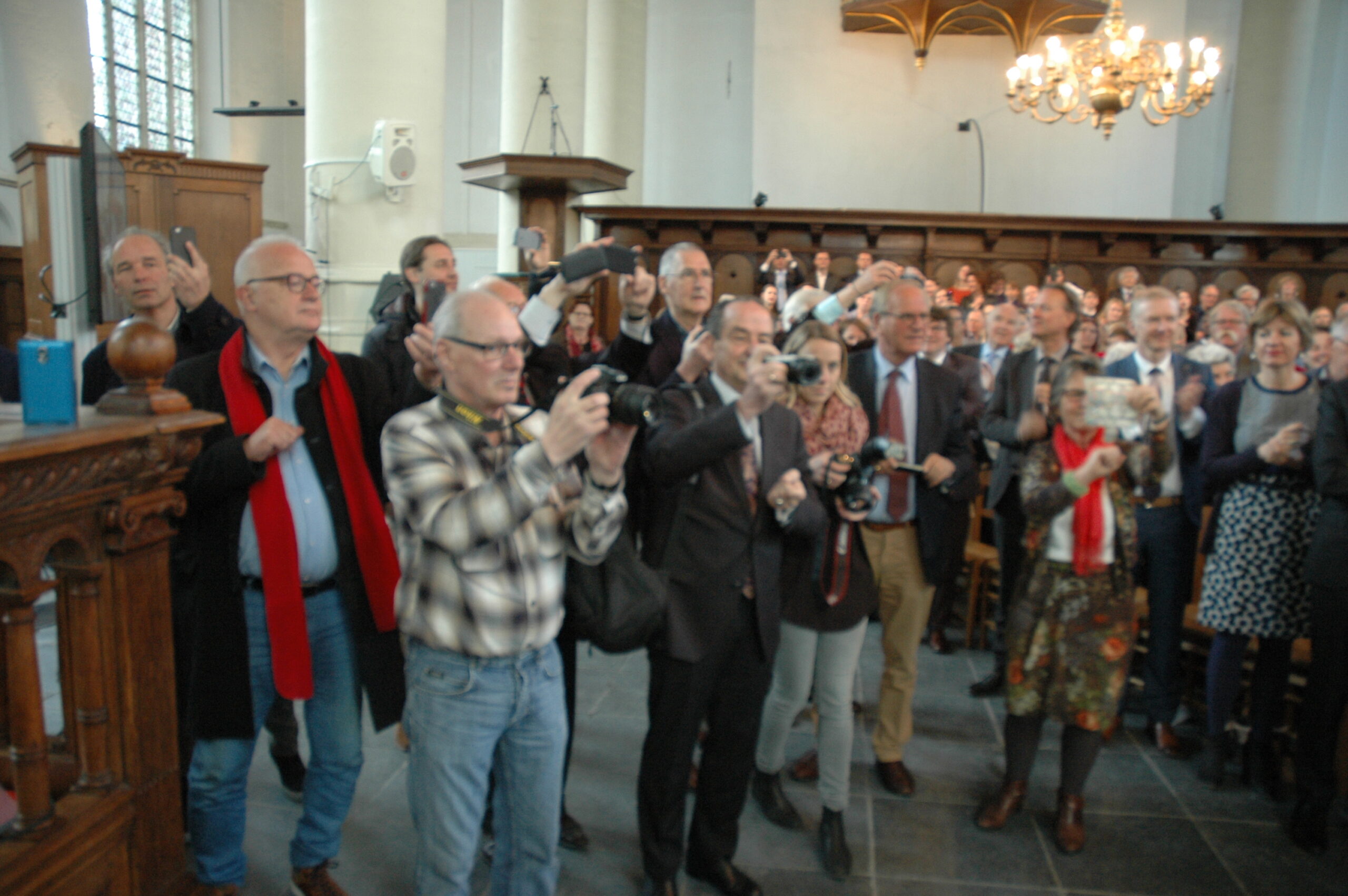 Chris de Waard ging vanmorgen naar de Hooglandse Kerk en sprak na de toespraken met drie gedecoreerden, Cor Arnoldus, Wils Spies en Kees Botermans, en met burgemeester Lenferink.