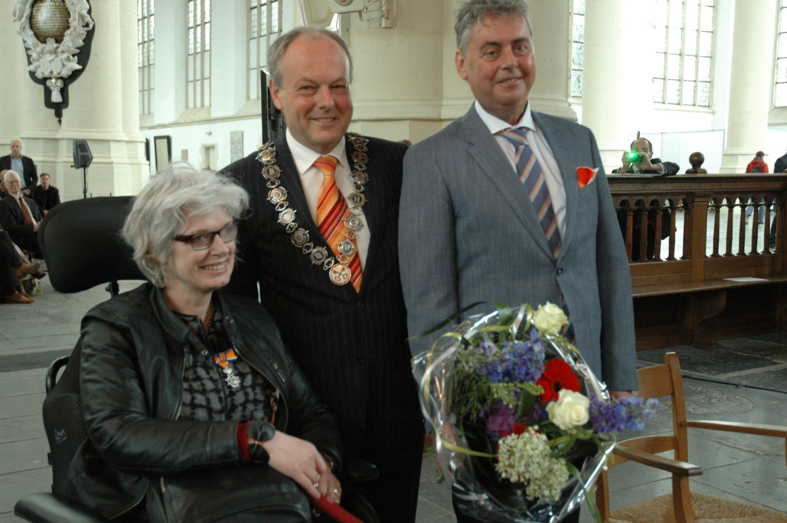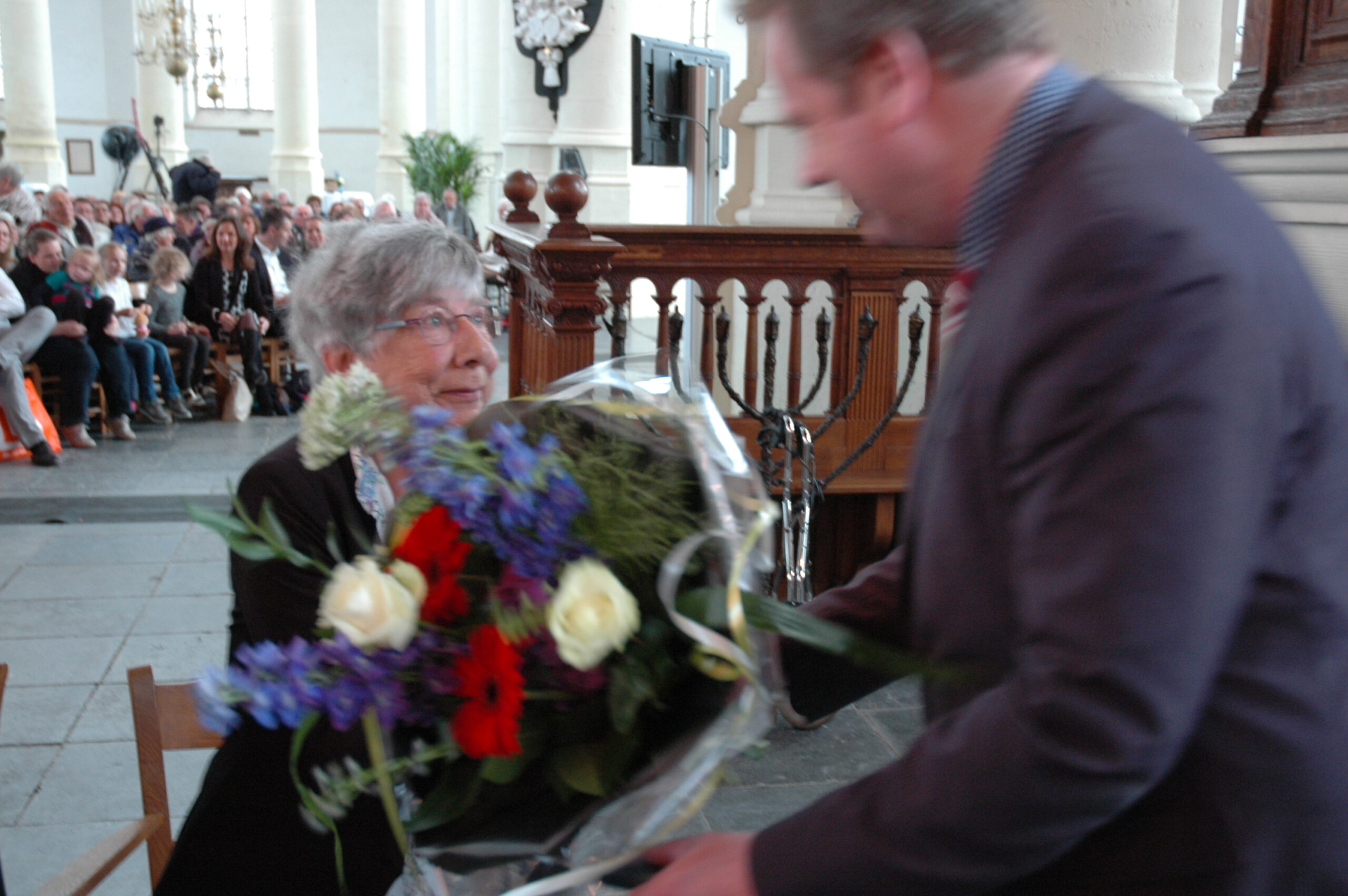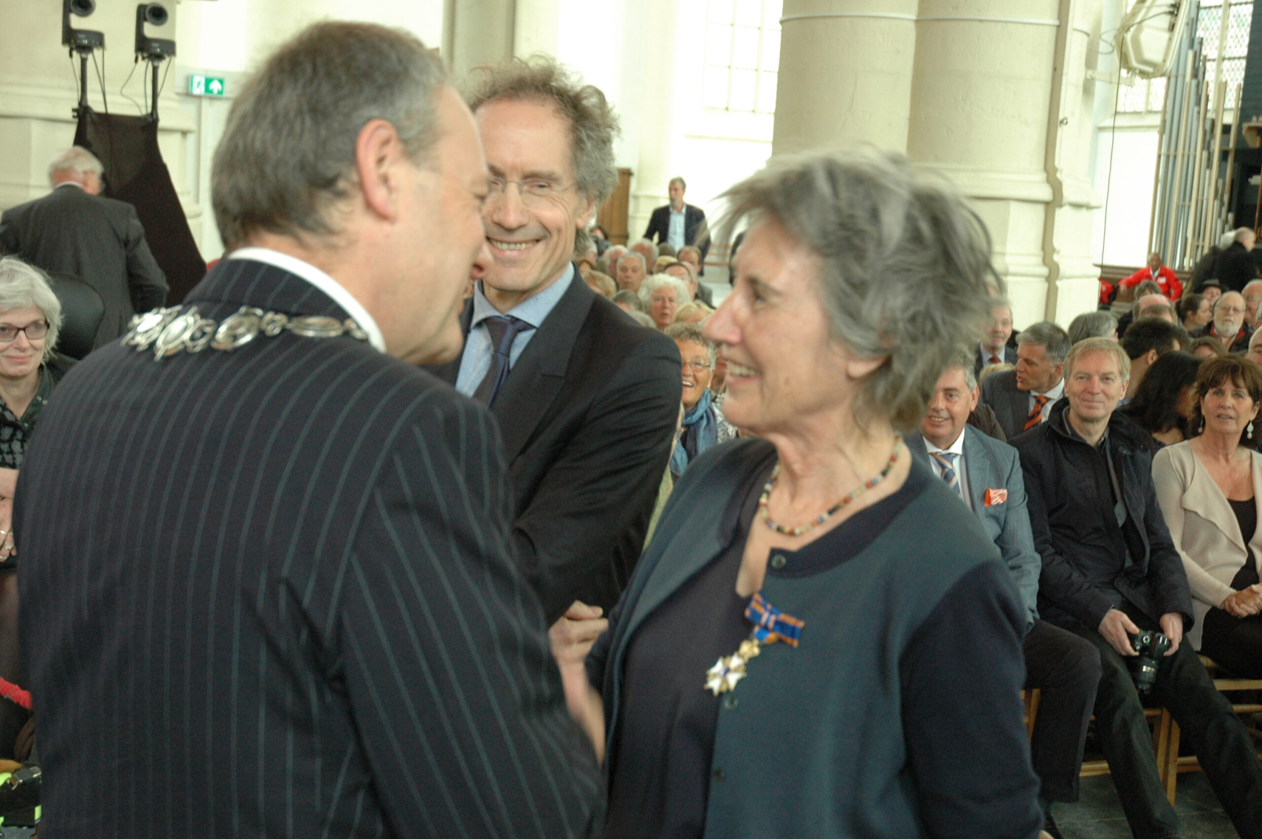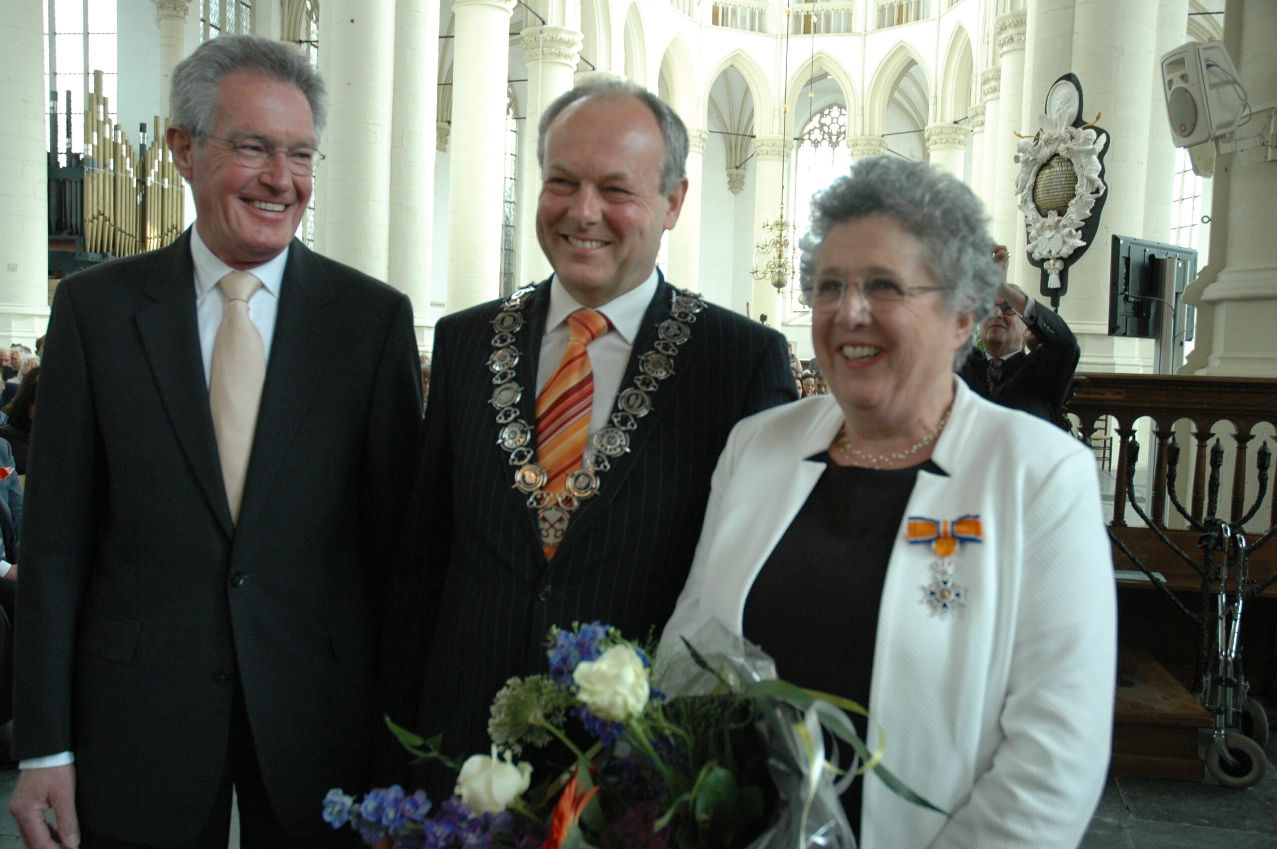 Chris de Waard ging vanmorgen naar de Hooglandse Kerk en sprak na de toespraken met drie gedecoreerden, Cor Arnoldus, Wils Spies en Kees Botermans, en met burgemeester Lenferink.