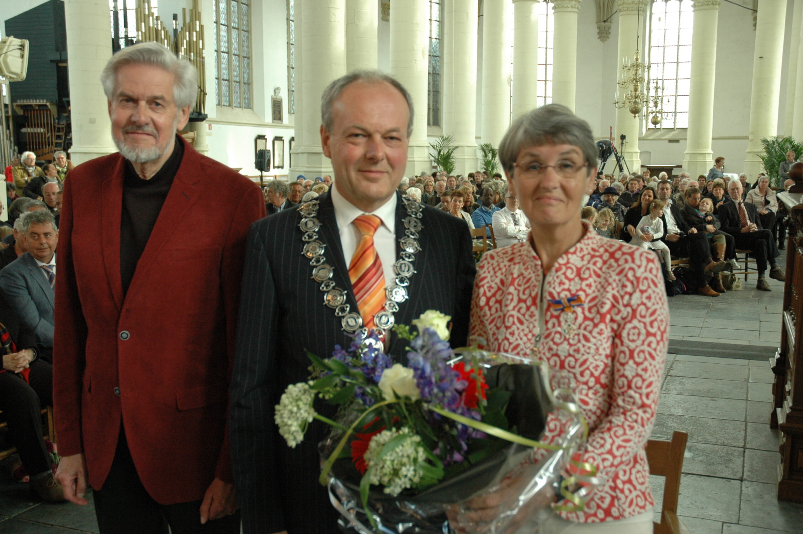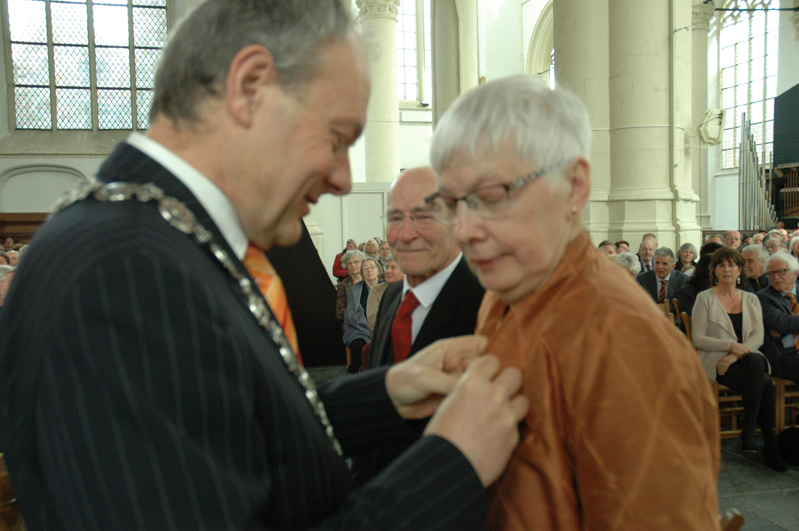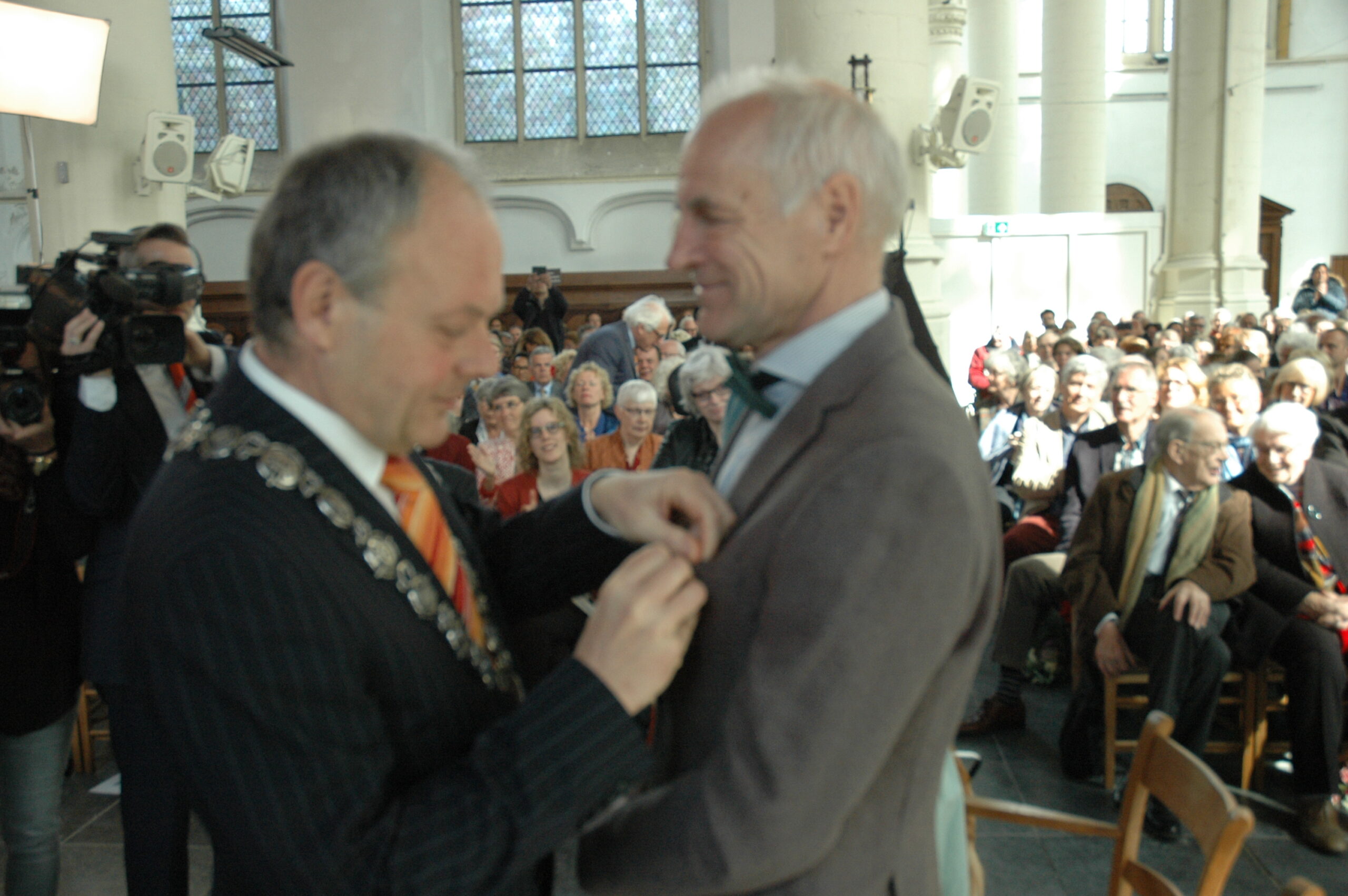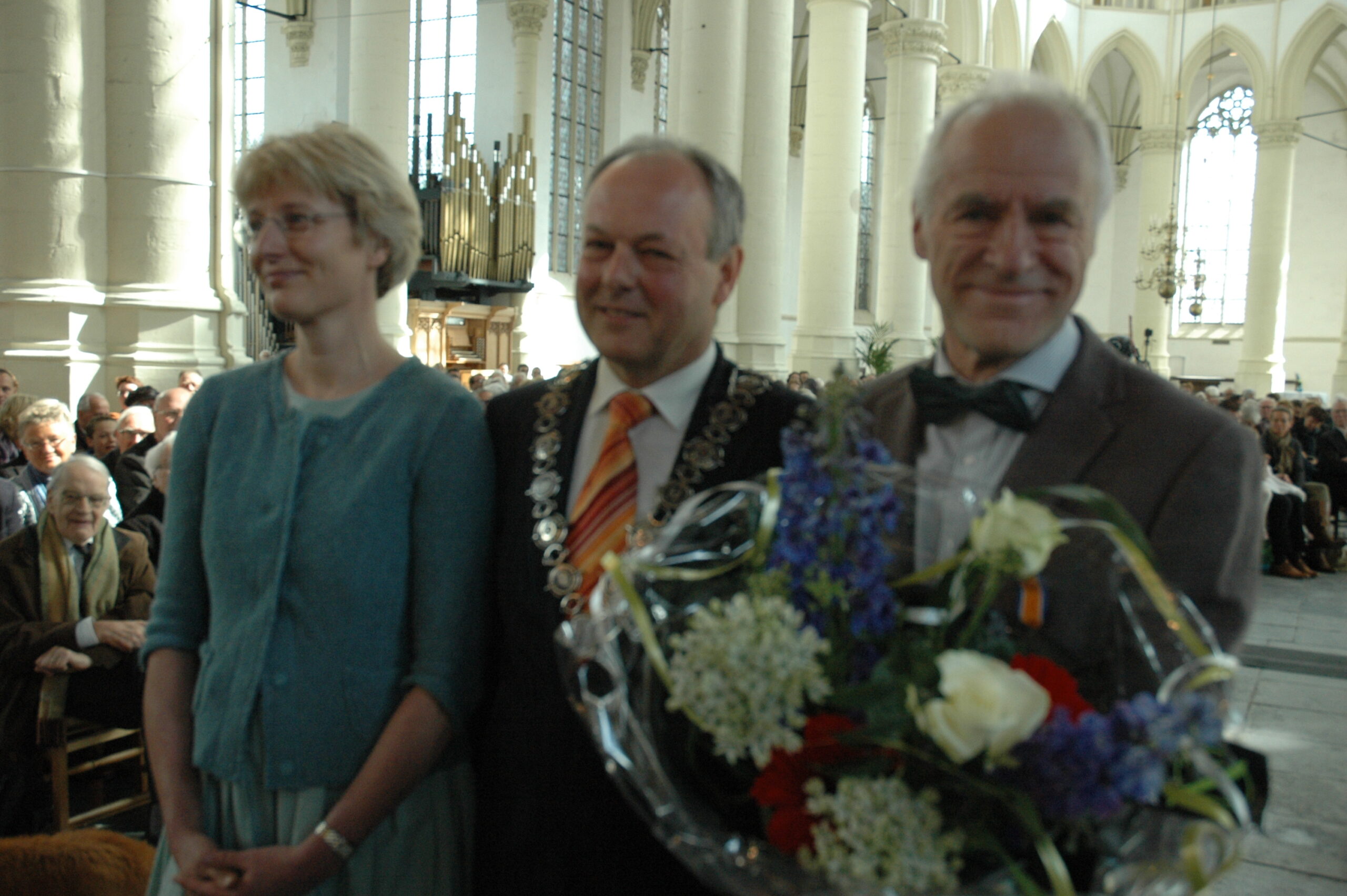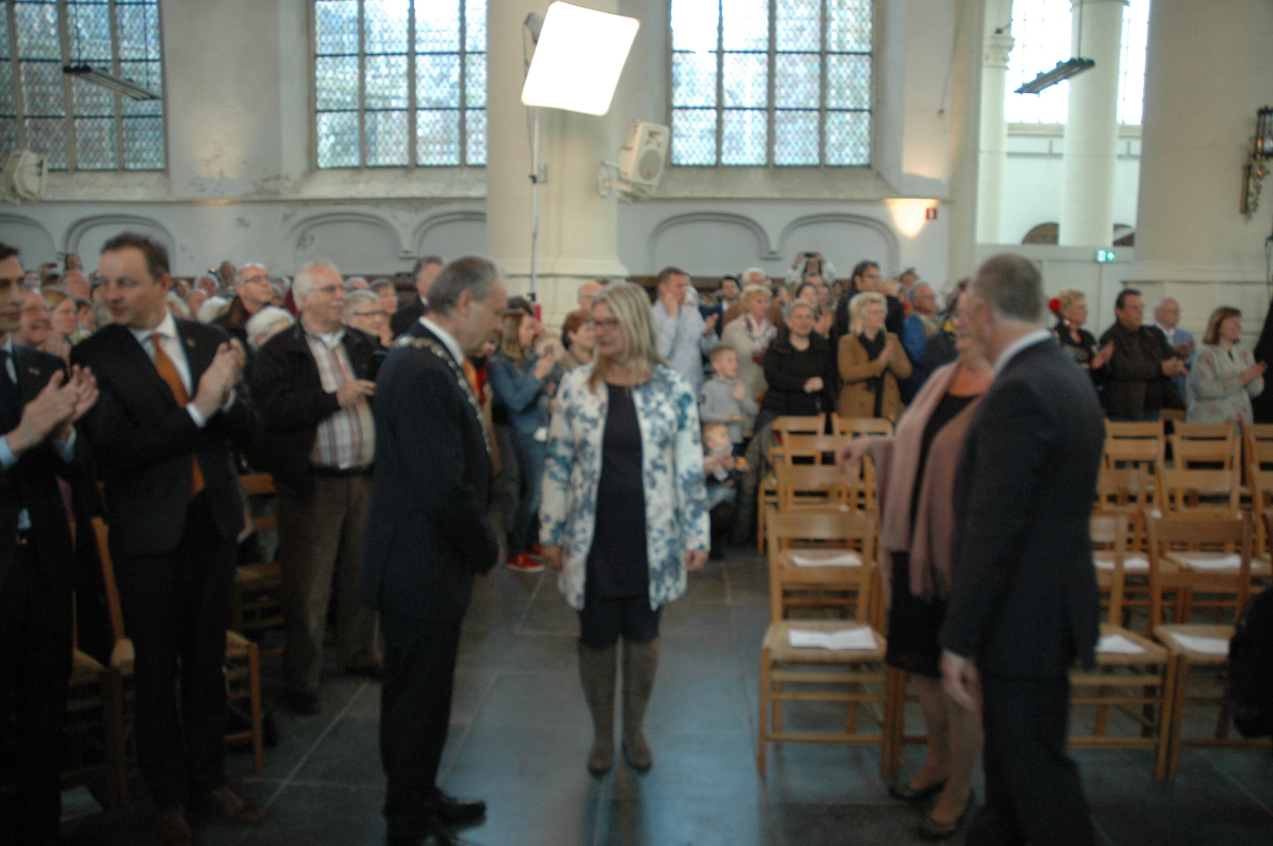 Chris de Waard ging vanmorgen naar de Hooglandse Kerk en sprak na de toespraken met drie gedecoreerden, Cor Arnoldus, Wils Spies en Kees Botermans, en met burgemeester Lenferink.