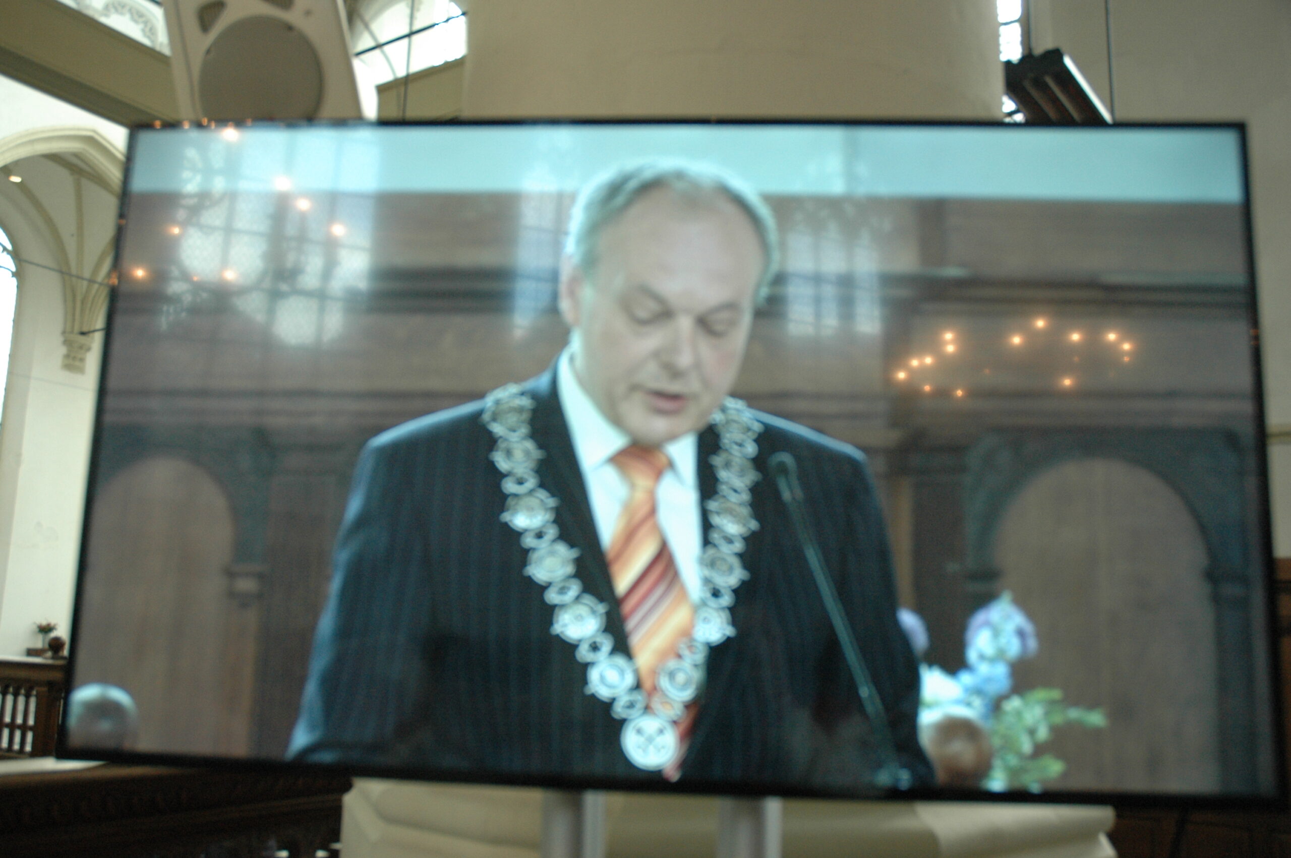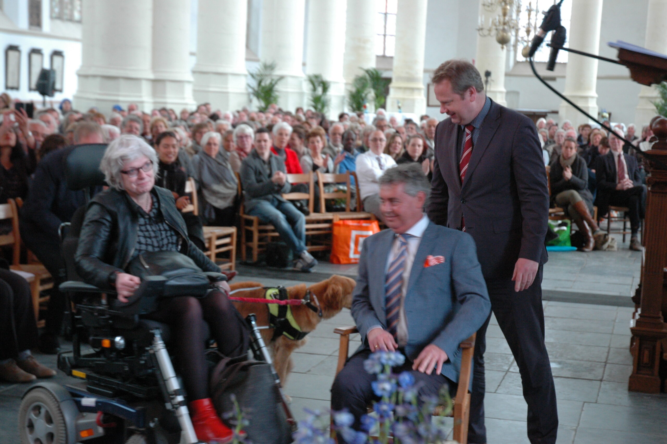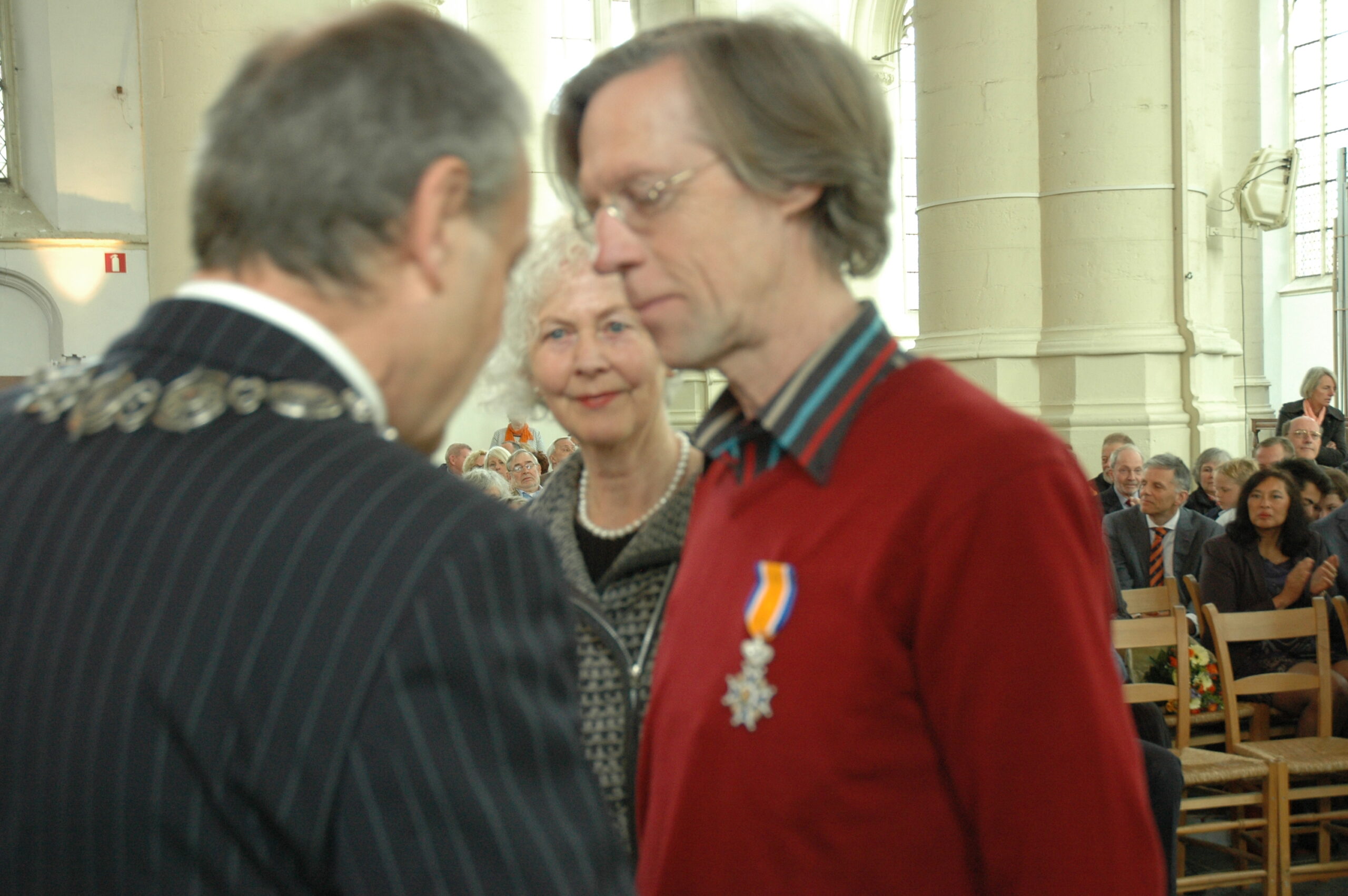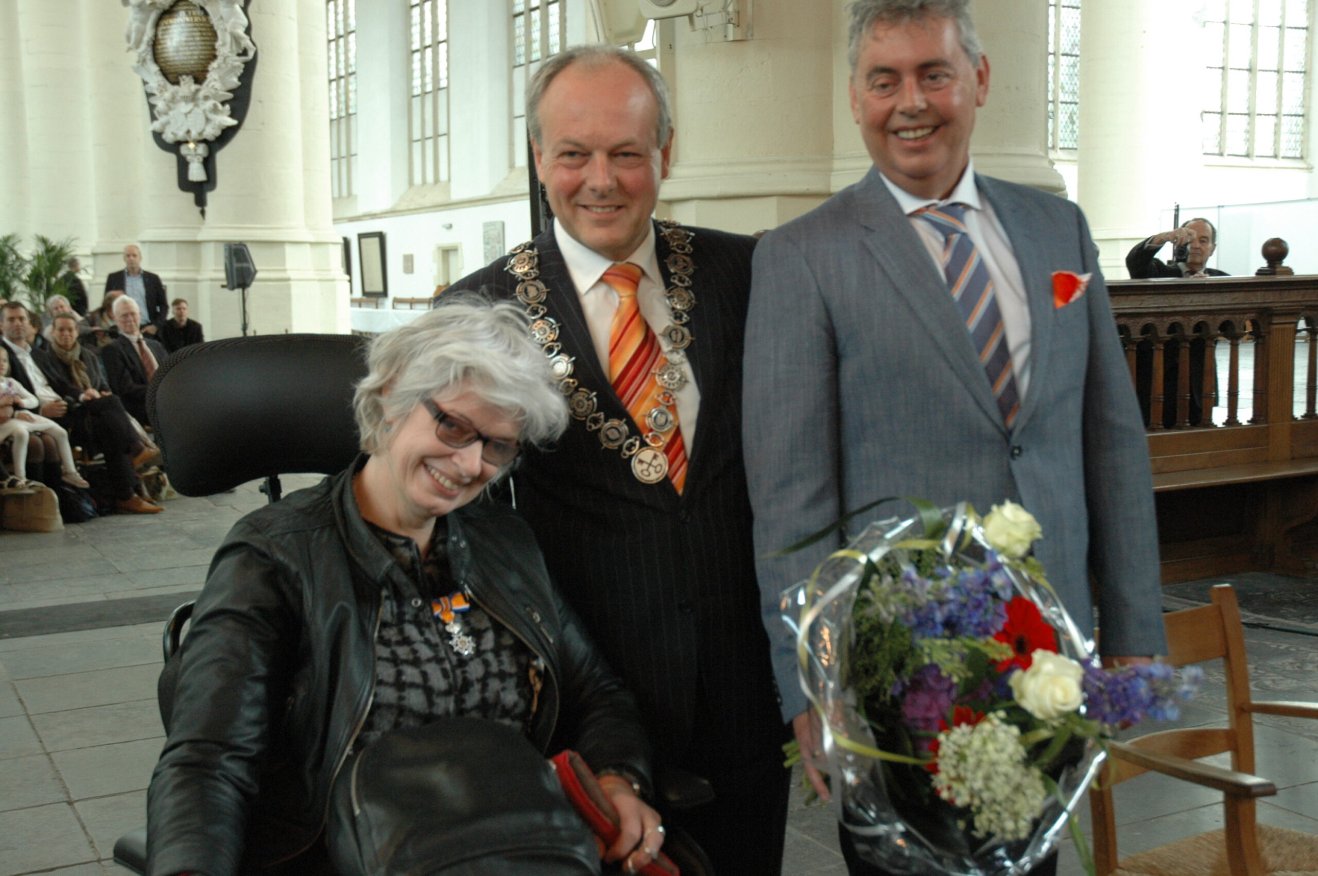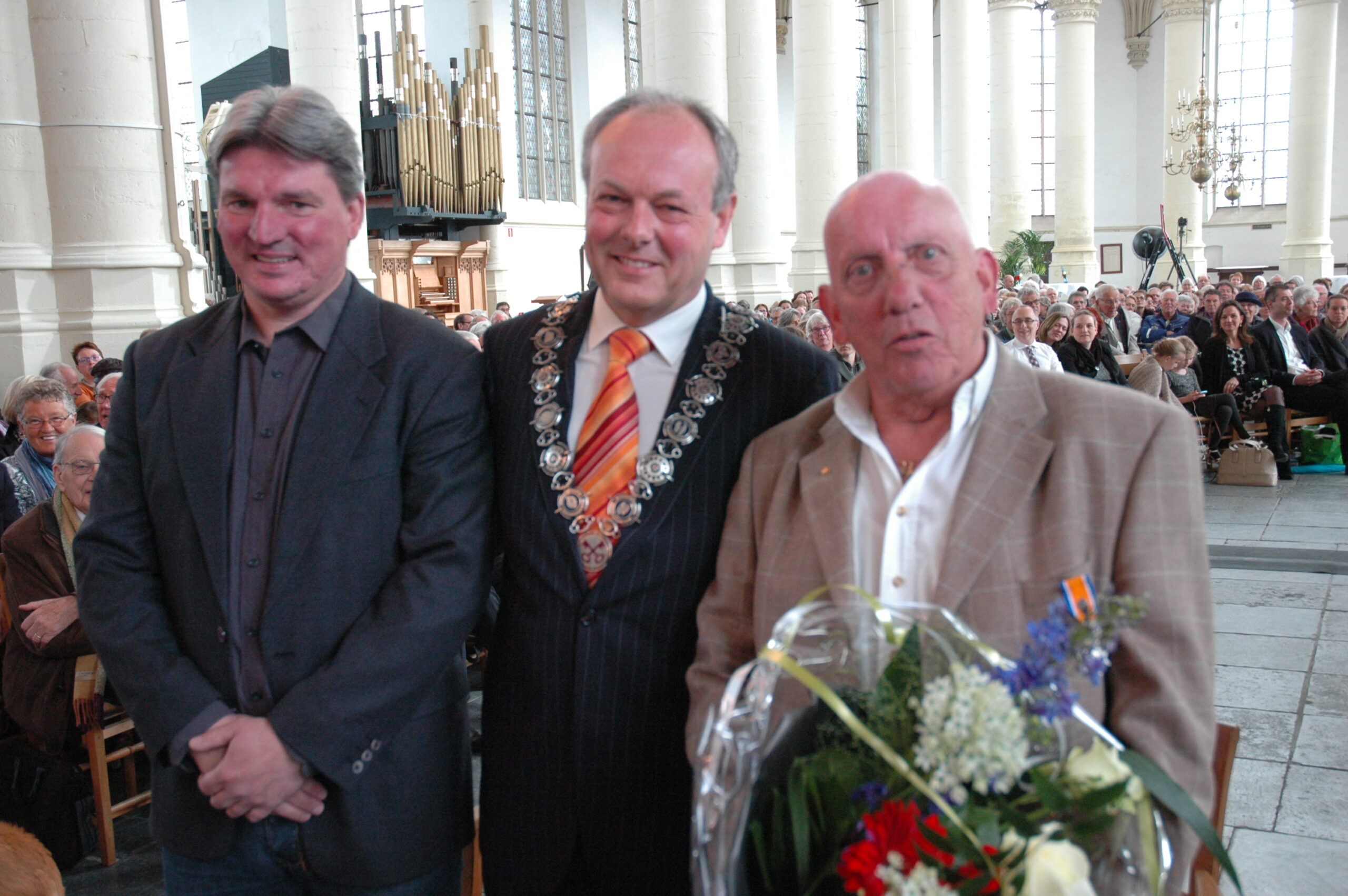 Chris de Waard ging vanmorgen naar de Hooglandse Kerk en sprak na de toespraken met drie gedecoreerden, Cor Arnoldus, Wils Spies en Kees Botermans, en met burgemeester Lenferink.