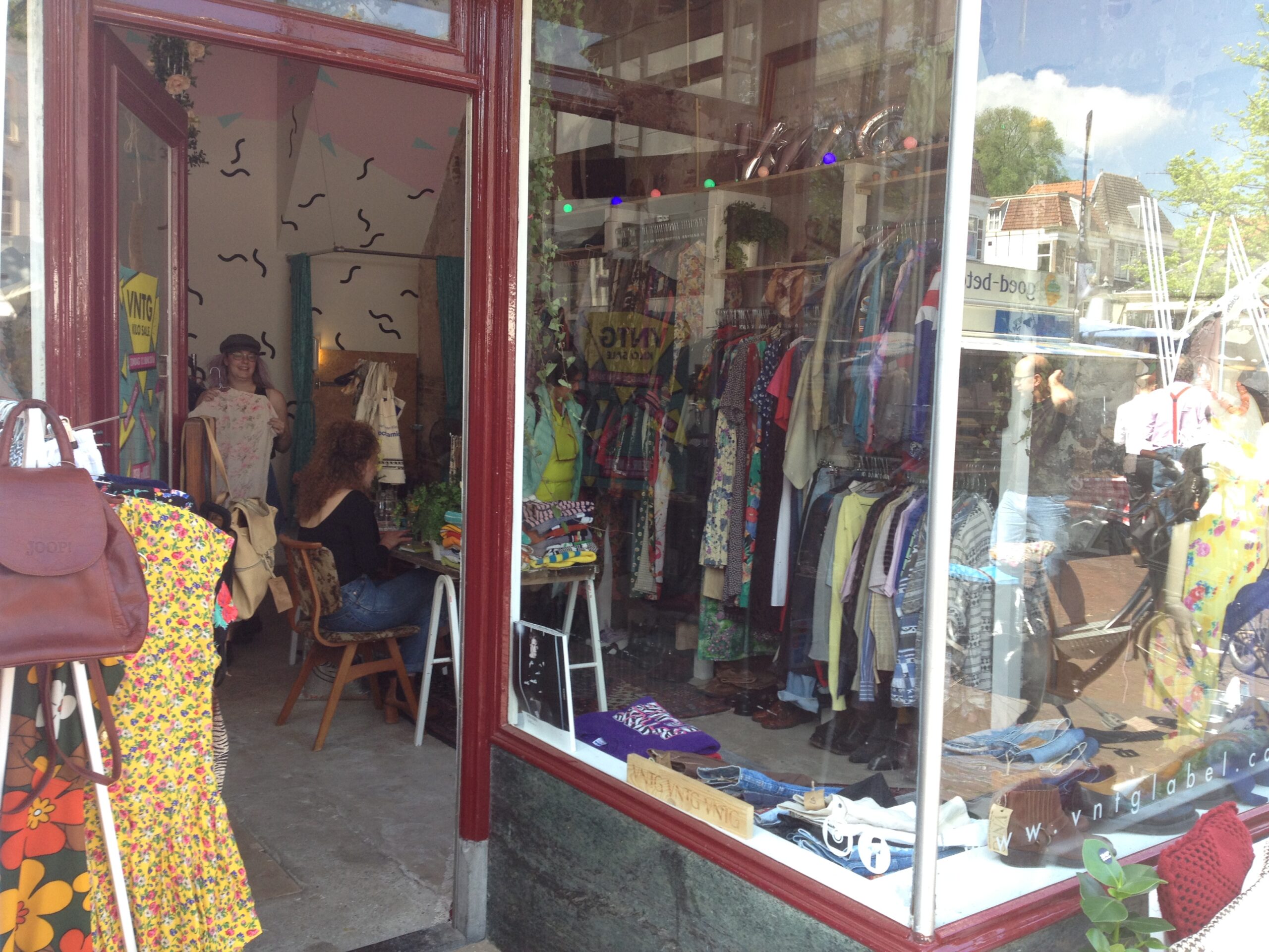 “Het was de sfeer van de winkel die ons meteen aansprak. We zochten eigenlijk een ruimer kantoor, maar vielen hier op. Waarom niet een combinatie van kantoor en winkel?” Marieta van Hoek en Saskia Schrijnen hebben die typerende ondernemershouding: een kans zien en die grijpen. Niet in de Breestraat, niet in de Haarlemmerstraat, maar hier in dít pand omdat de sfeer beviel. Dat de loop naar VNTG er meteen al in zit, is duidelijk. Continue zijn er mensen, jong en oud, in de kledingrekken aan het snuffelen. Ook de gastvrijheid is tekenend. Waar grote ketens vooral lusteloos personeel lijken aan te trekken, spettert de lol er bij beide dames af. Iedere klant is bijzonder, en de vrolijkheid lijkt niet uit de winkel weg te slaan.