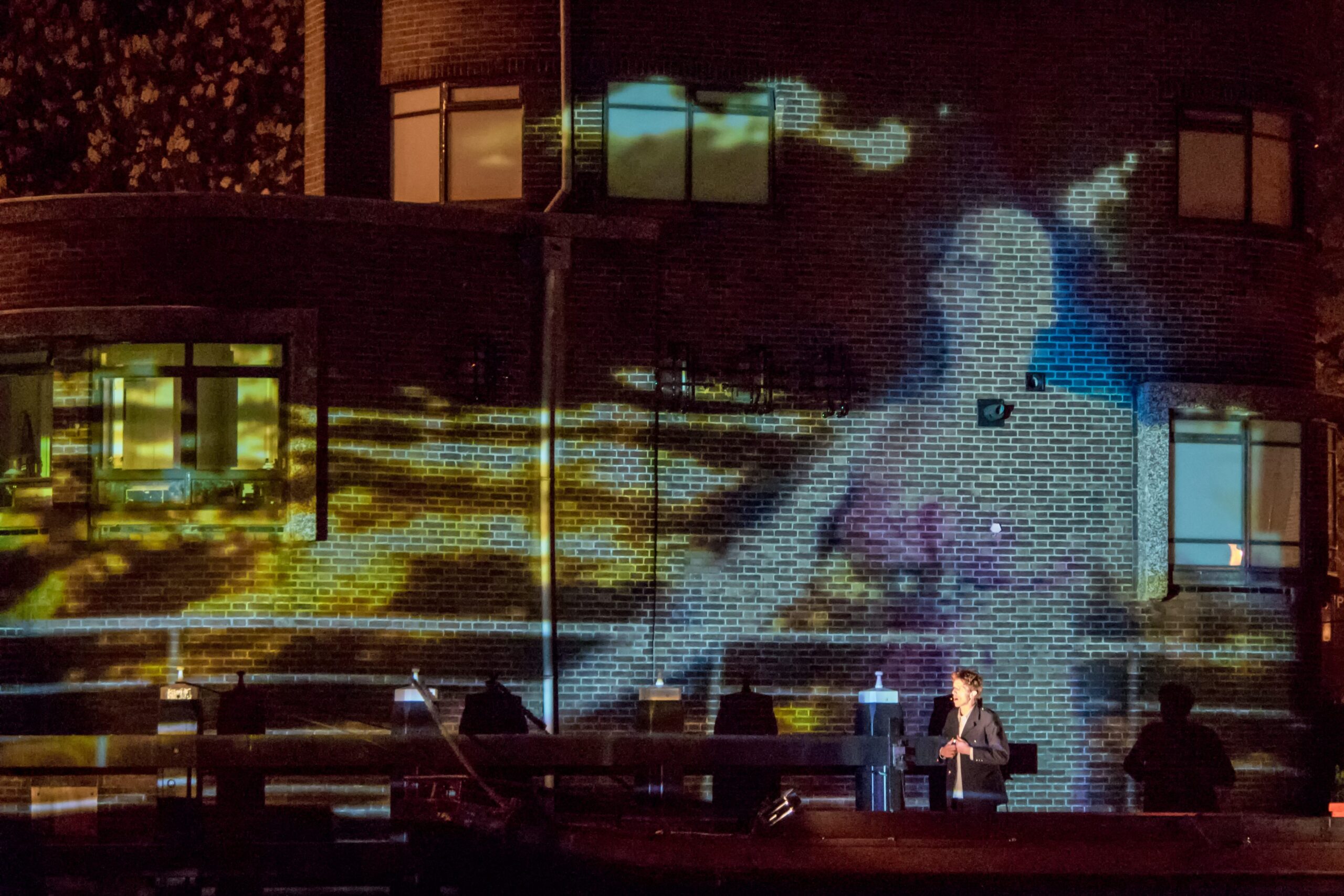 Schemerlampjes heten ze; de voorstellinkjes waar de boten snelheid minderen, maar doorvaren. Sir, Realism (Witte Singel) is dans, maar zó dicht op Het Laatste Oordeel dat je even denkt ‘wéér dans?!’. Da’s best jammer, want locatie én dans rechtvaardigen meer. Puzzelen, dus. Dat geldt zeker voor de té kleine Schemerlampjes. Waarschuwen Voor Wat Komen Gaat (Kraaierbrug) deed niets. In ieder geval niet als het om waarschuwen gaat. Gemaskerde gezichten die vanaf een brug naar beneden kijken, een waarschuwing?! Wat dat betreft deed Op het Leven (Boisotkade) het veel beter in die paar minuten dat je voorbij vaart. Plots staat daar een prinses te springen en doen. Een bord helpt ‘WC gezocht’ ….. en vlak daarna ‘Prins gezocht’. Het wérkt.