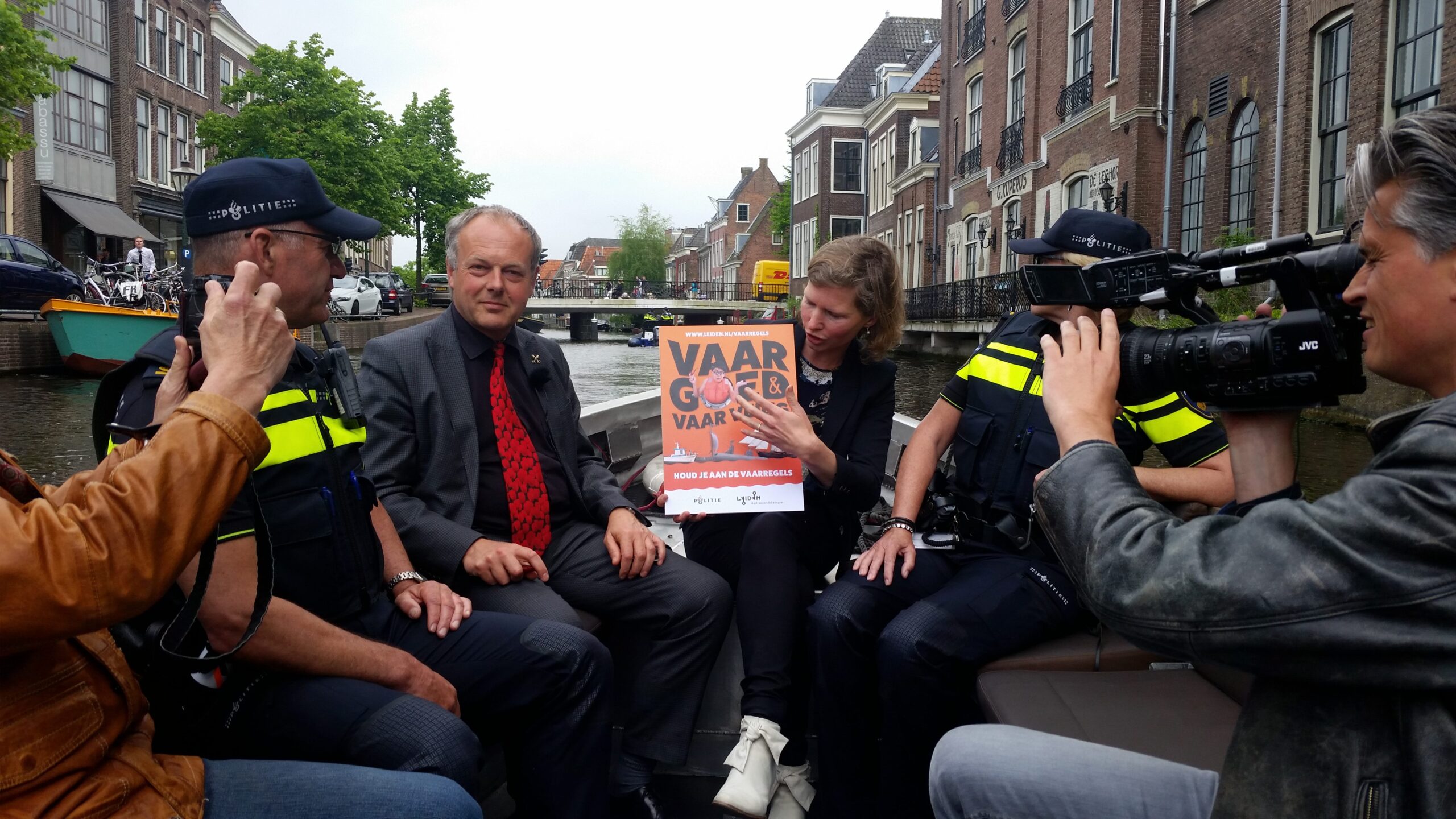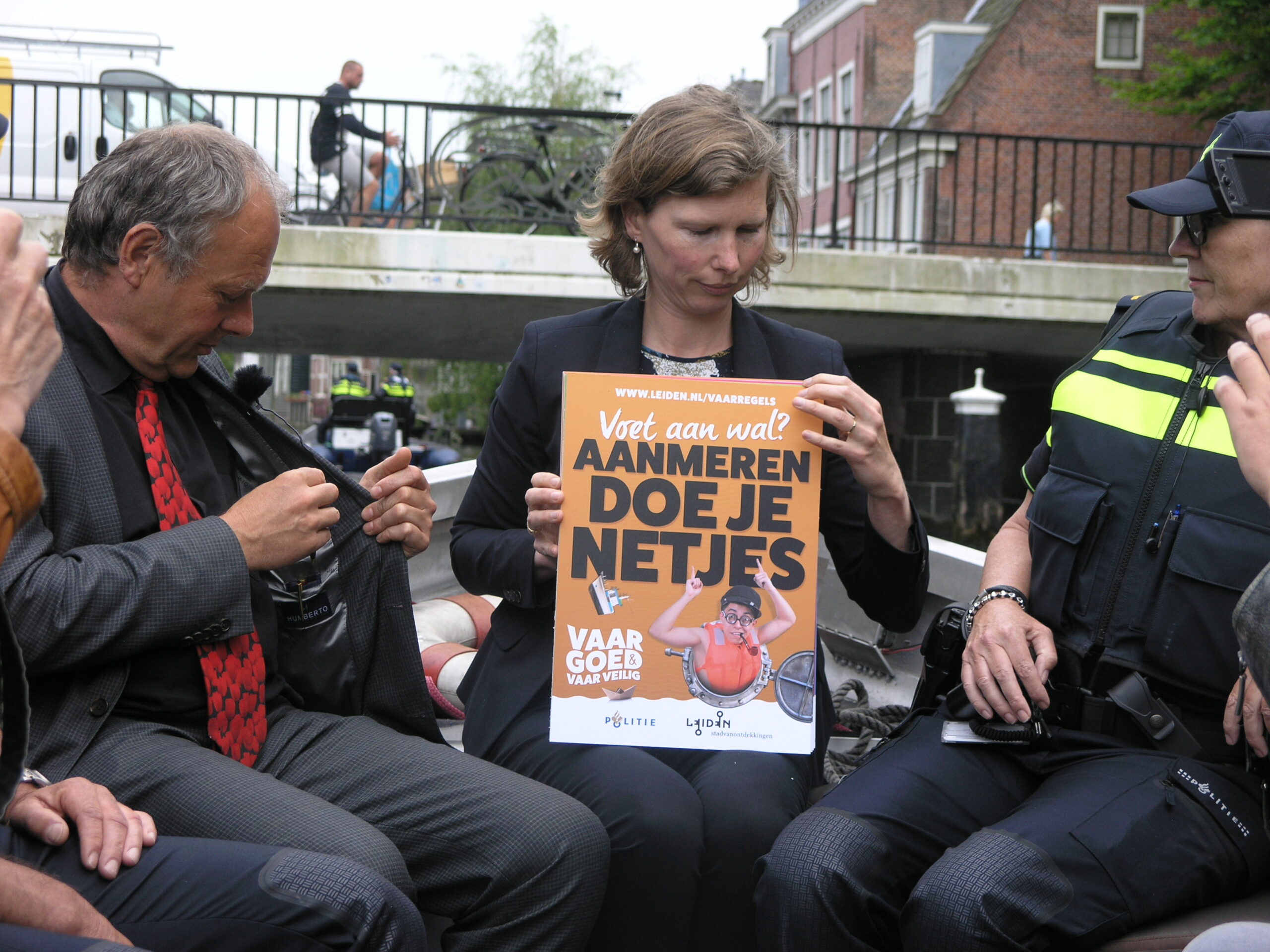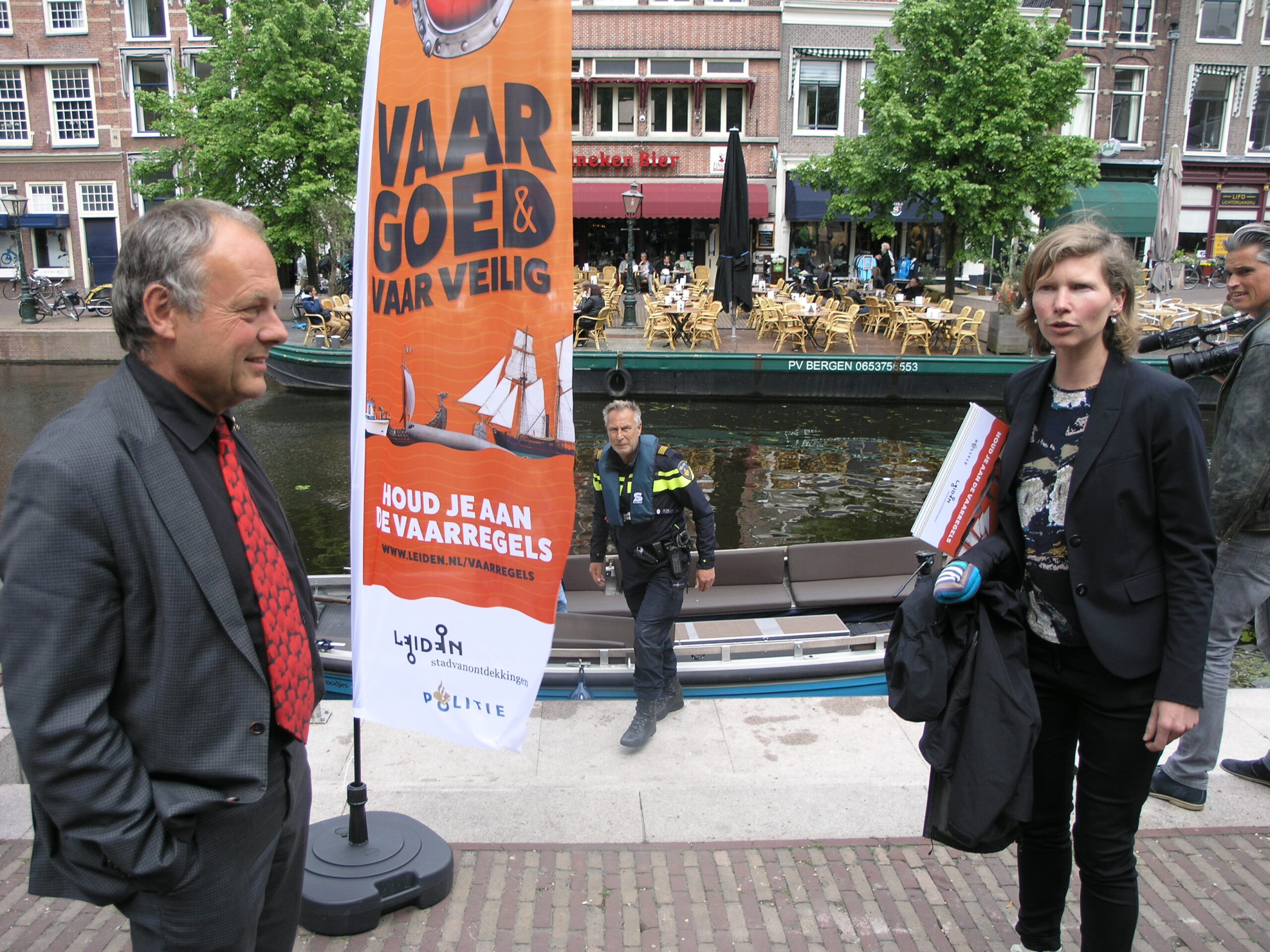Met een serie posters en flyers gaat de gemeente Leiden het komende vaarseizoen aandacht vragen voor de veiligheid op het steeds drukker wordende Leidse water. Donderdag ging die campagne officieel van start met een vaartochtje door het centrum. Daarbij geven burgemeester Lenferink en plaatsvervangend districtschef Hil Renema een toelichting op de belangrijkste vaarregels waar iedereen zich aan moet houden.