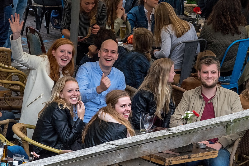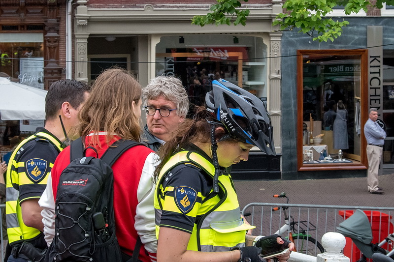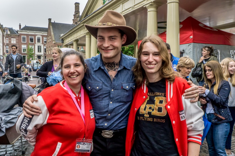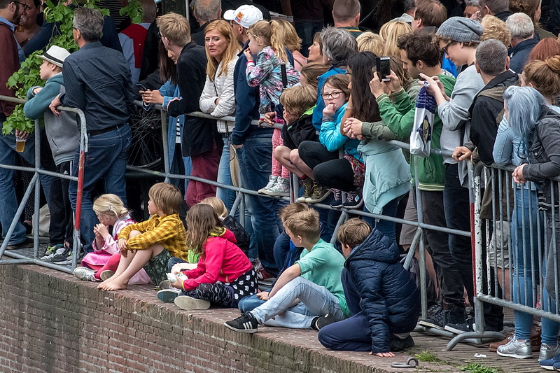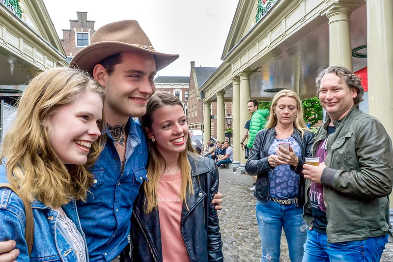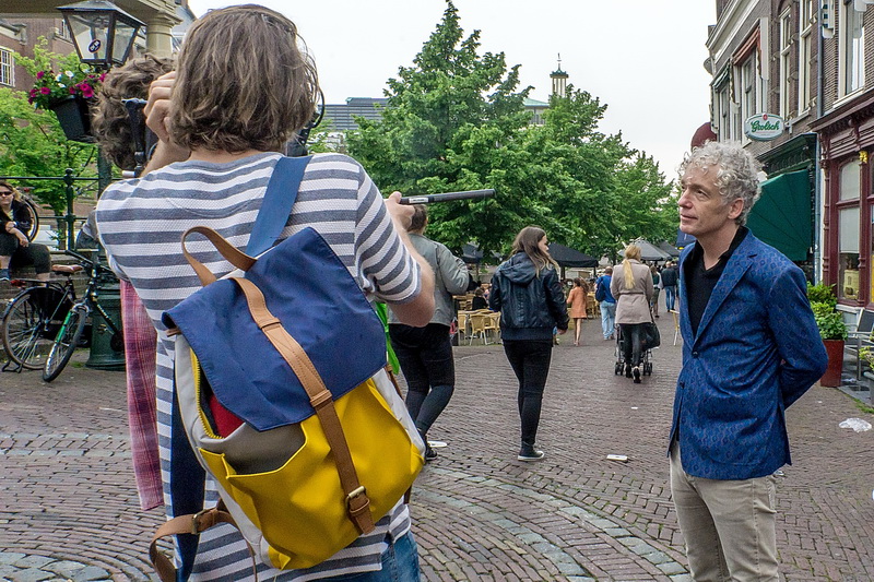 Op de Koornbrug kon je achter het afgeschermde podium langs lopen. De beveiligers hadden nog de handen vol aan mensen die daar tussendoor of overheen een glimp probeerden op te vangen van Douwe Bob. Marije (17) en Anouk (17) “Marije is de grote fan” hadden er zelfs een ijsje bij gehaald en stonden rustig te gluren. Aan de zijkant van het podium was dat anders. Daar leefde hectiek. Geduw, getrek, “kom hier staan” en nervositeit. Drie meisjes van 12, 13 en 17 konden haast niet uit de woorden komen. Ze wilden een foto én een handtekening! Dat lukte, lieten ze zien nadat Douwe Bob was gepasseerd. Hadden ze maar geweten dat tijdens het wachten Douwe áchter het podium op de brug gewillig, geduldig en vriendelijk op de foto ging met passanten.