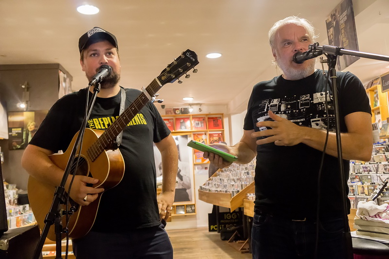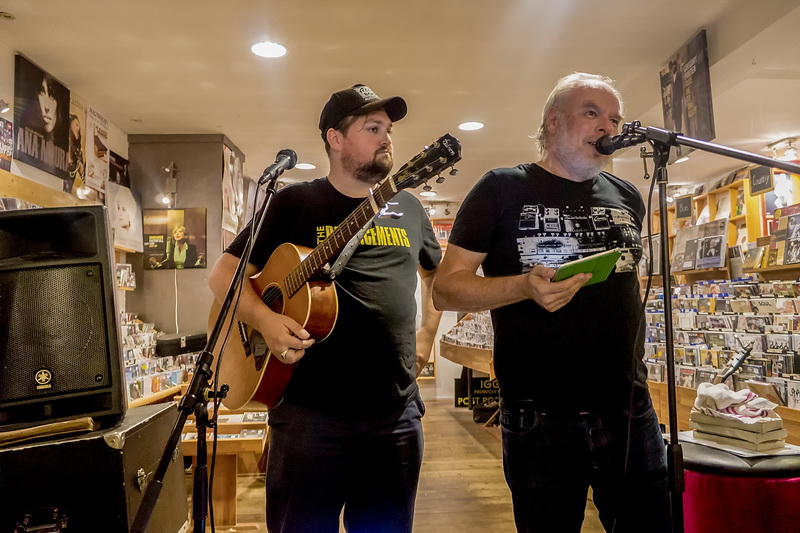 Het tourbusje stond onhandig geparkeerd waardoor een kleine ruimte ontstond waar Douwe Bob doorheen moest. Naar Velvet voor een signeersessie. Maar als die kleine ruimte vol staat met elkaar verdringende meisjes wordt dat een obstakel. Dan moeten vier potige veiligheidsmensen je als een prop door een leiding duwen. Het lukte, maar vraag niet hoe. Douwe Bob was ontegenzeggelijk hét hoogtepunt van ’25 jaar Velvet’. Inmiddels een winkelketen(tje), maar met z’n oudste winkel in Leiden. In de stad waar het begon, was het dus feest. En, hoe kan dat ook anders met muziekfanaten als Maarten, Mark en Robert, met muziek. Doen ze met Peel Slowly And See de in hun ogen aanstormende talenten, dit feest was er een van bekende namen: Mister and Missisippi, Max Meser, Spinvis, Douwe Bob, Kraak&Smaak, en ín de zaak een duo Tim Knol/Nico Dijkshoorn.