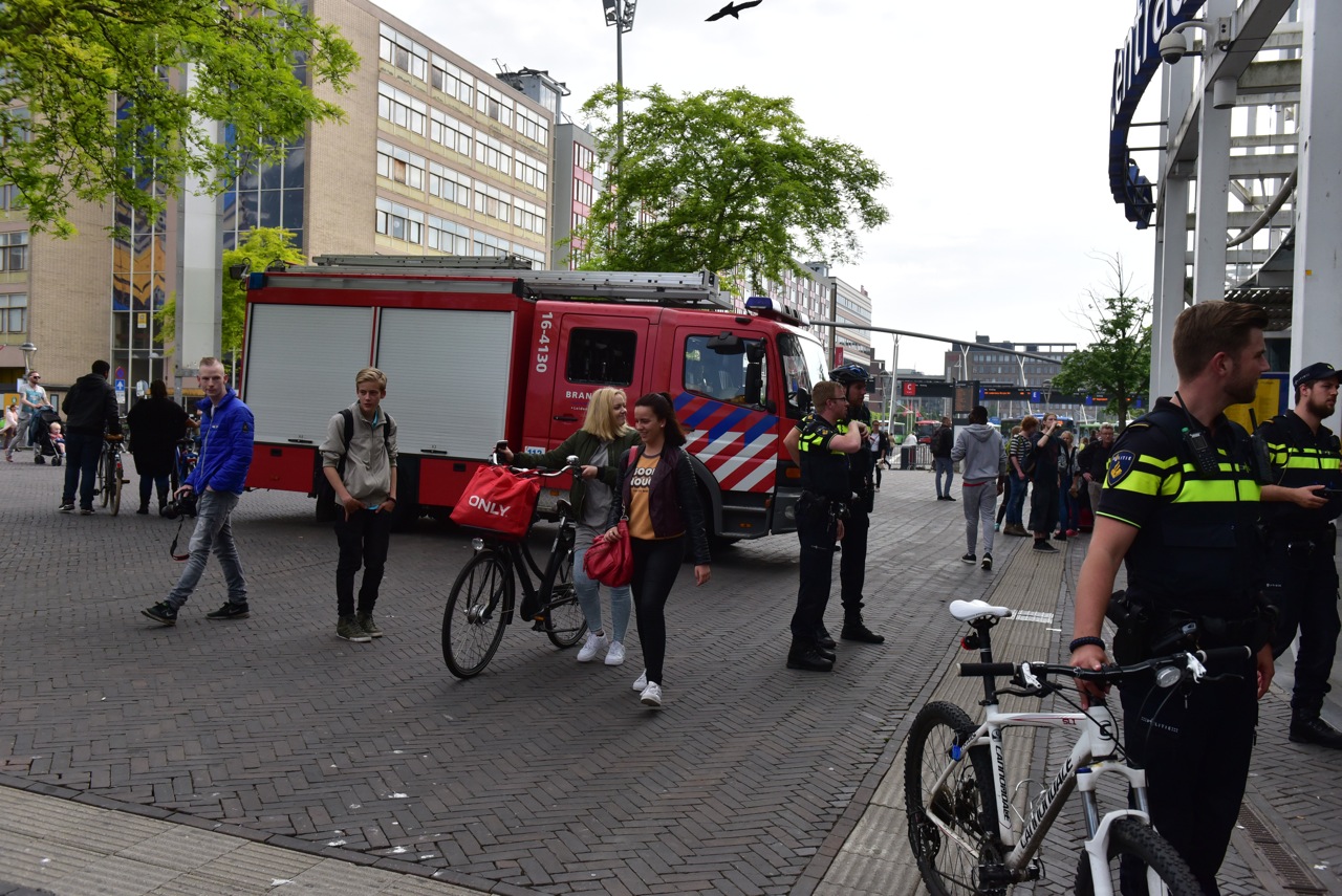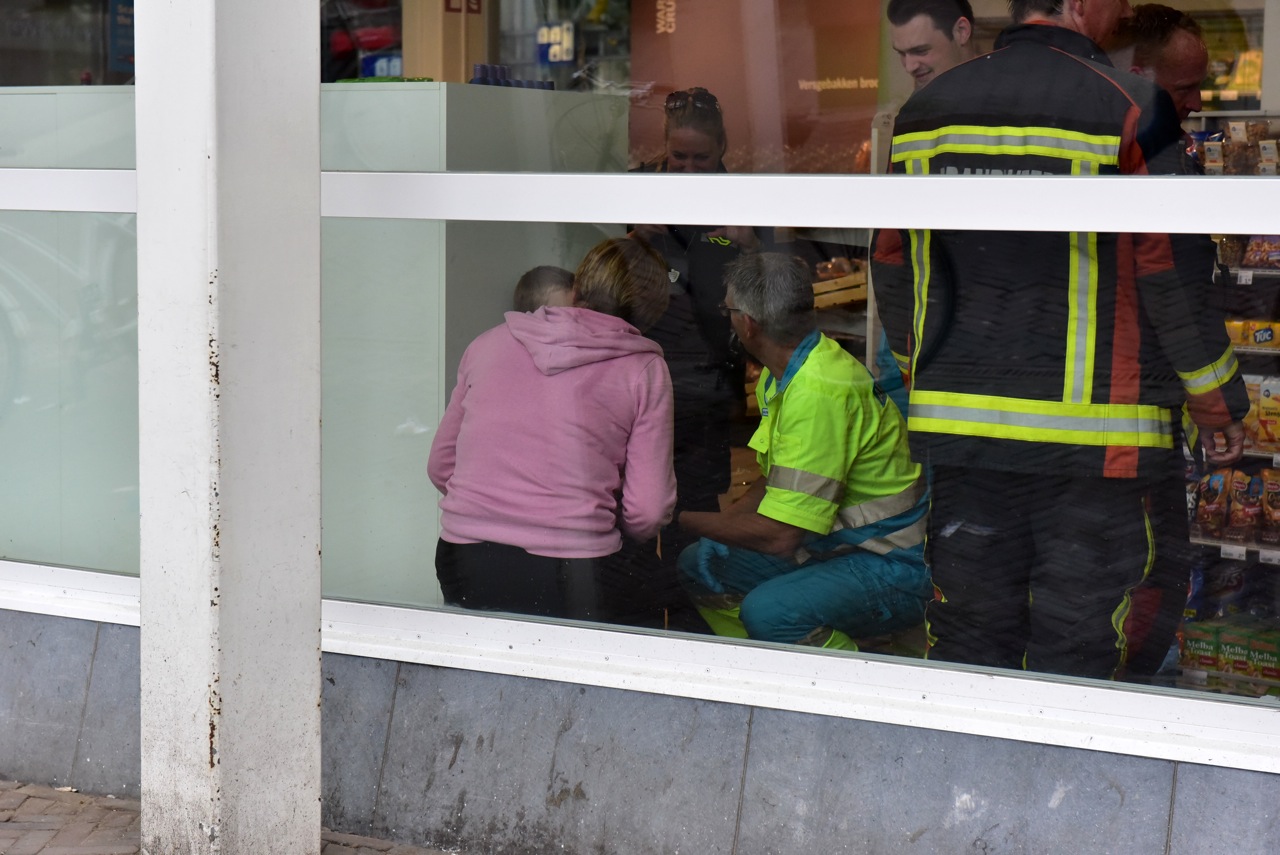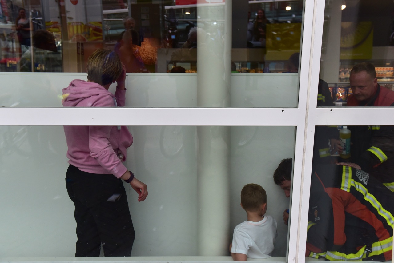 Een jongetje kwam gistermiddag met de schrik vrij nadat hij vast kwam te zitten achter een stelling in een winkel op station Leiden Centraal. Het kindje kroop achter de stelling en kwam daar met zijn voet vast te zitten.