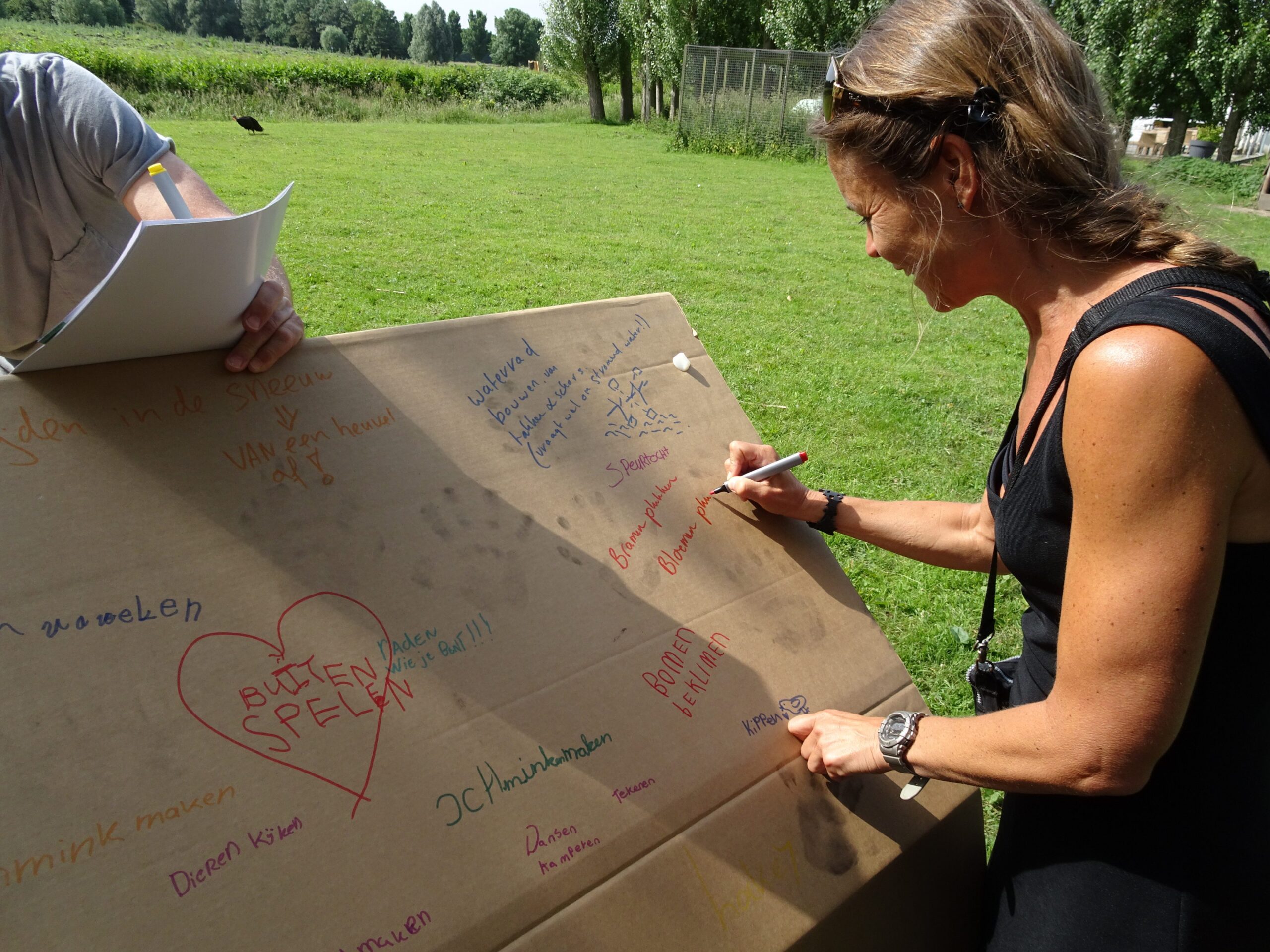 Het eerste exemplaar van de Buitenspeelkaart werd overhandigd aan Dieuwke Hovinga, lector ‘Natuur en Ontwikkeling Kind’ aan de Hogeschool Leiden. Volgens Hovinga is zo’n kaart heel belangrijk: “We zijn het niet meer gewend om met kinderen naar buiten te gaan. Terwijl buiten in de natuur zijn zo gezond is voor mensen in het algemeen en in het bijzonder voor kinderen.”