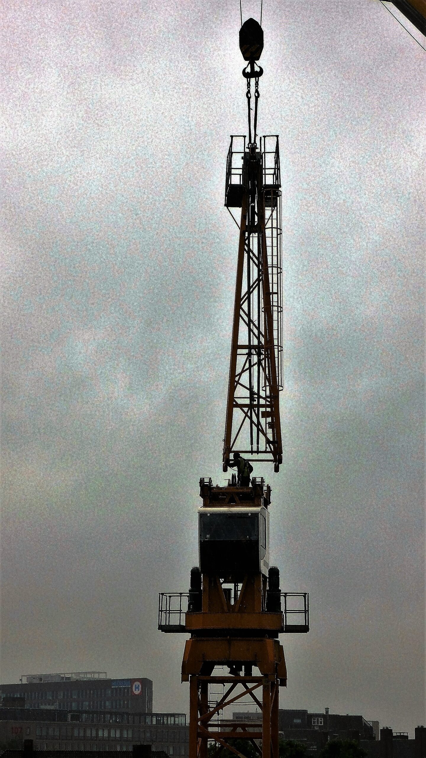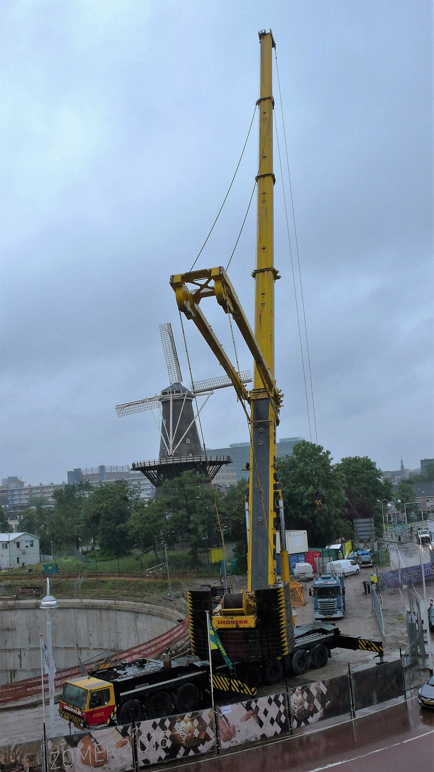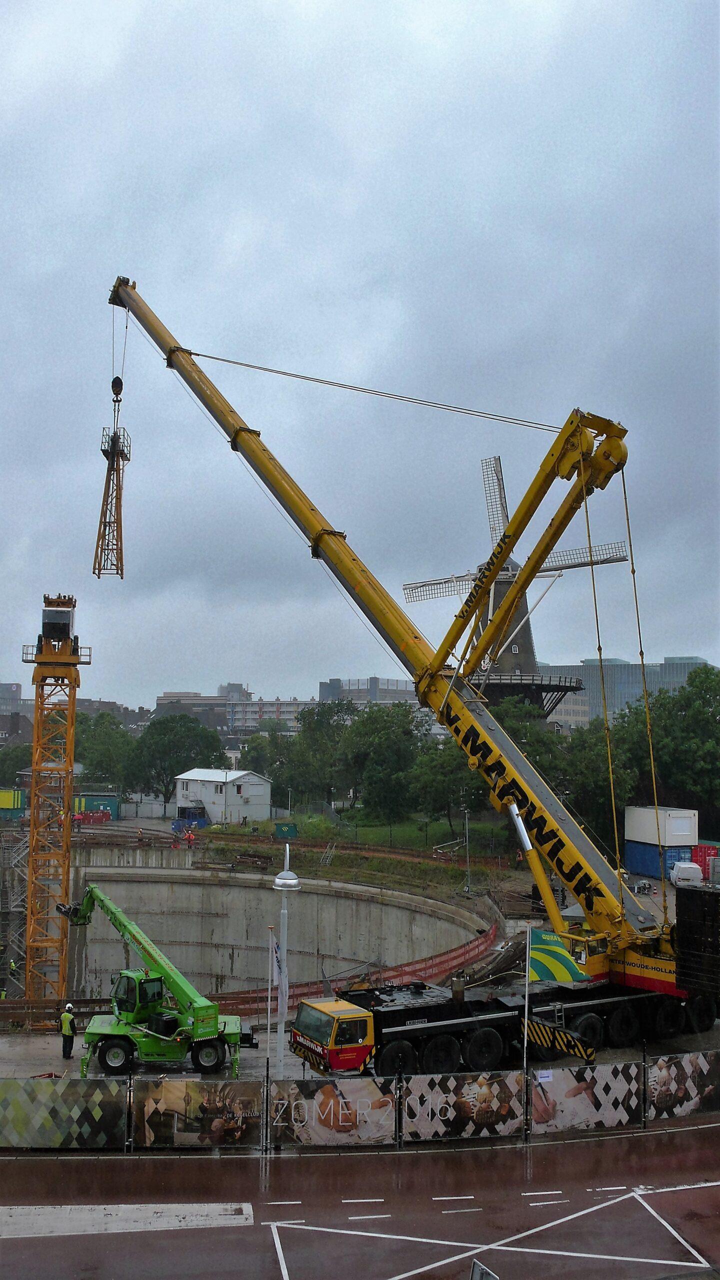 In de bouwkuip van de ondergrondse parkeergarage aan de Lammermarkt wordt een enorme bouwkraan opgebouwd. De kraan staat op de vorige maand gestorte vloer van de diepste parkeergarage in wording in Nederland. De komende veertig dagen worden de verdiepingen aangebracht.