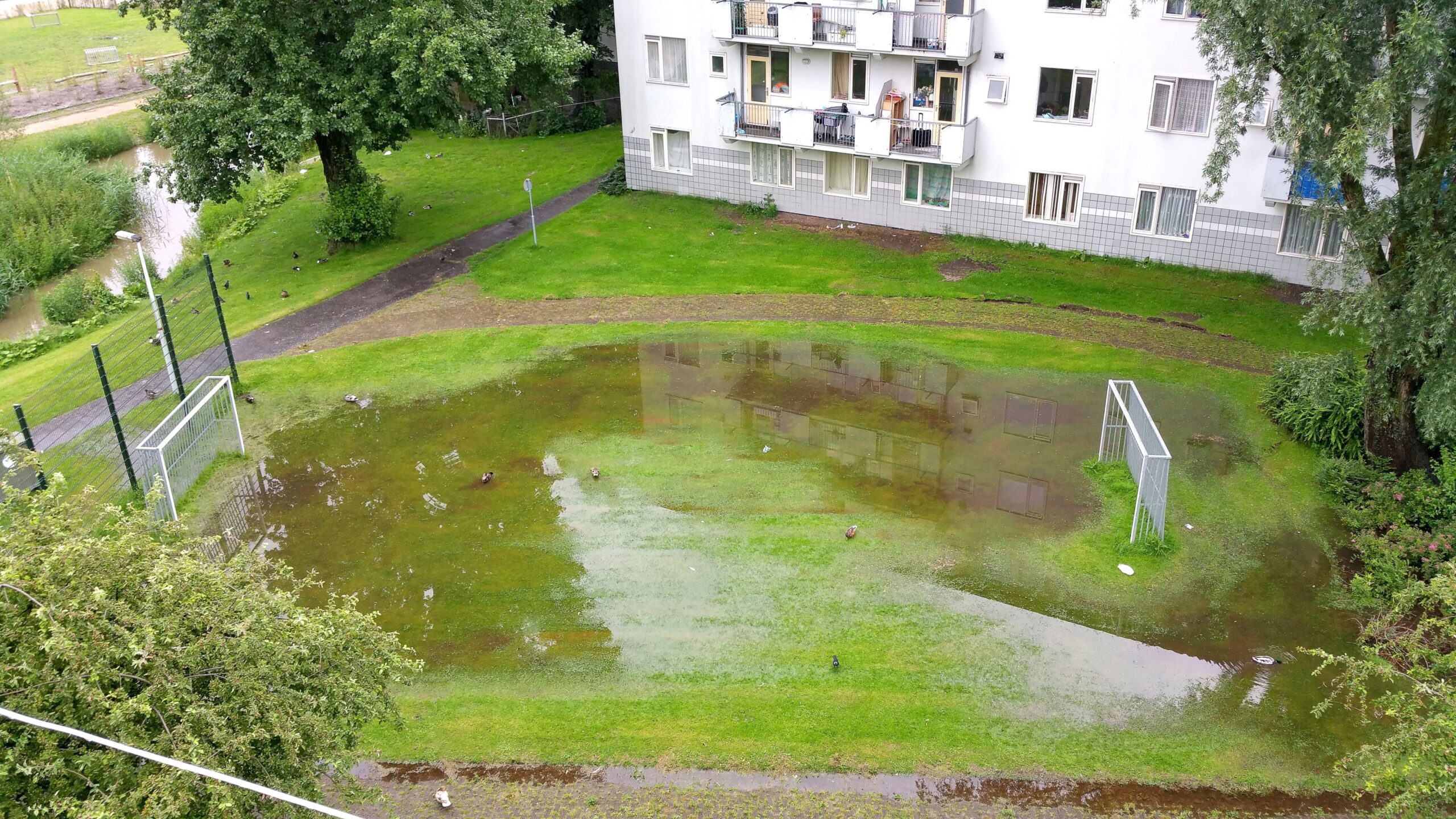 De enorme regen- en onweersbuien hebben in Leiden niet voor grote problemen gezorgd. Hier en daar ontstonden enorme plassen op de weg en ook een enkele kelder liep onder. Dat gebeurde bijvoorbeeld bij de kelderboxen aan het Stationsplein. In Leiden Noord veranderde een grasveld bij de Hoven in een vijver. Compleet met eendjes.