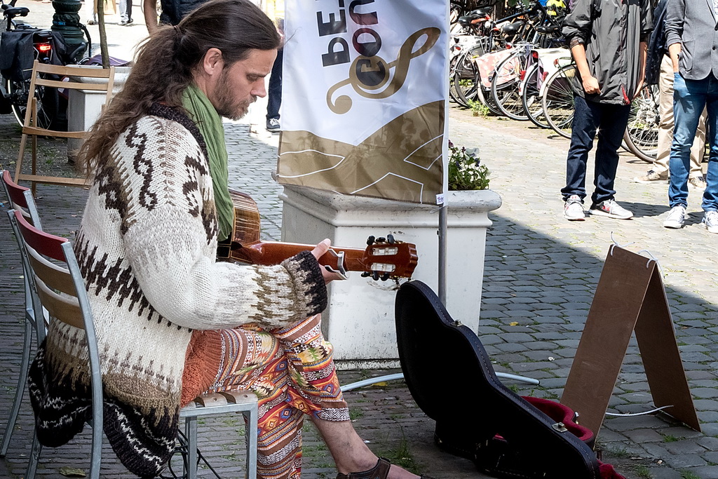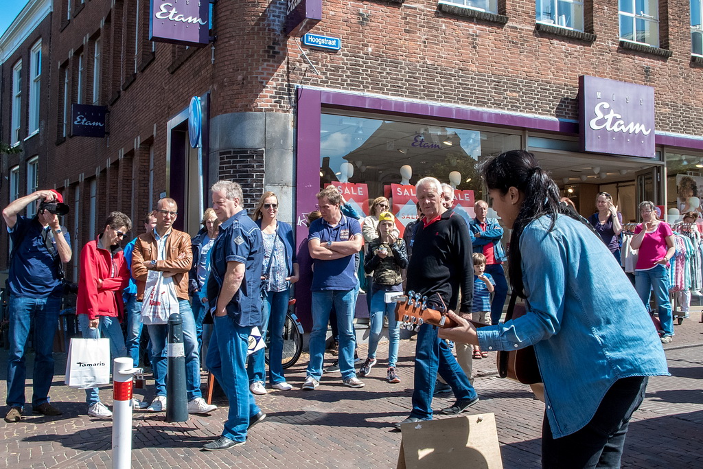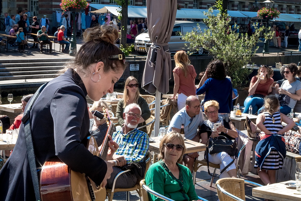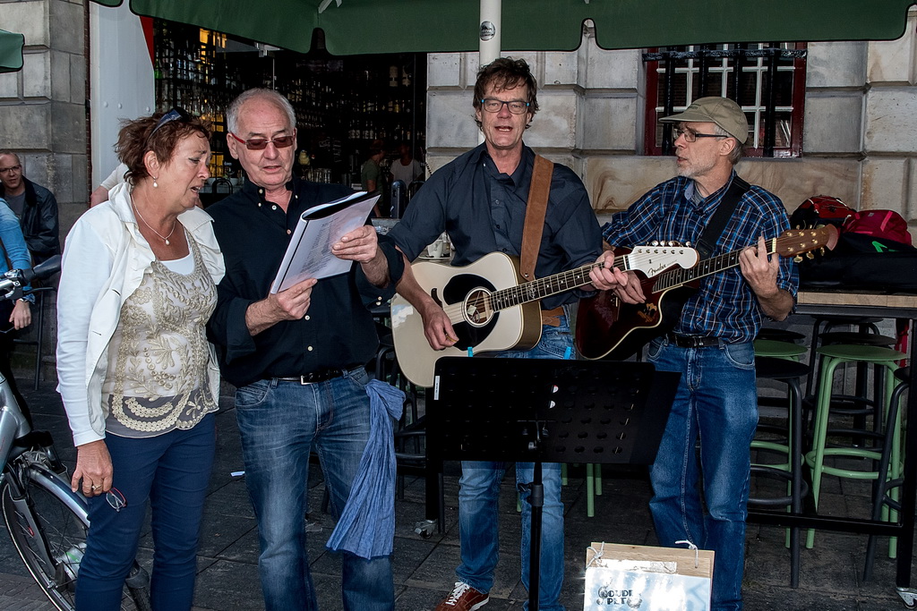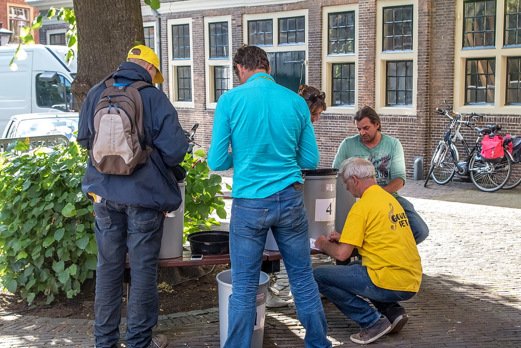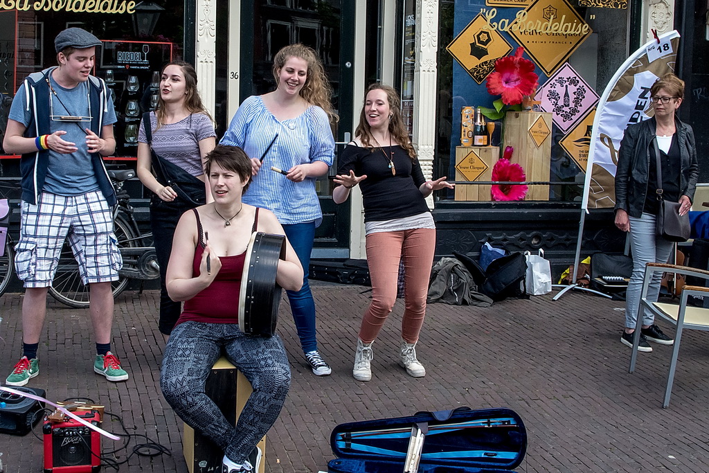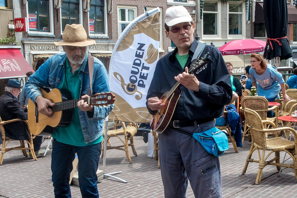 Zes genomineerden uit veertig acts: Marloes Claasen, Take4, Twibv, Joni Sheila, A’Little Late en W8FF. Heel jammer was dat Take4 al weg was en dus niet meedong naar plaats één. Het viertal jonge – tussen 17 en 20 jaar, uit Katwijk e.o. – blazers maakte in de Leidse stegen indruk: aanstekelijk en toegankelijk. Zij hadden geen last van een typisch straatmuzikantprobleem: achtergrondgeluid waar je overheen moet zien te komen. Dat heeft nogal wat muzikanten parten gespeeld, zeker degenen die op Nieuwe Rijn/Botermarkt speelden. Bands als Twibv en A’Little Late kunnen dat aan, maar het roept ook wel de vraag op waar de grens ligt tussen straatmuzikant en band. Arnold Veeman, GerBard, Amajunzi, Per Ongeluk: ’tere’ muziek die kopje onder gaat in omgevingsgeluiden.