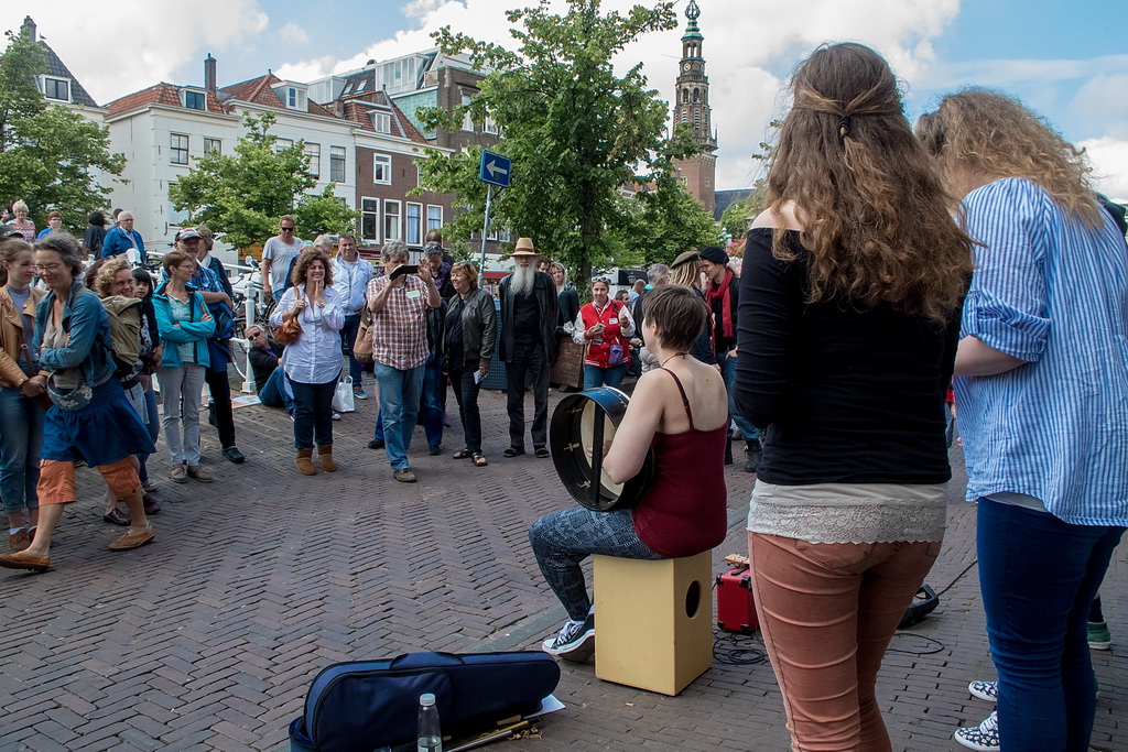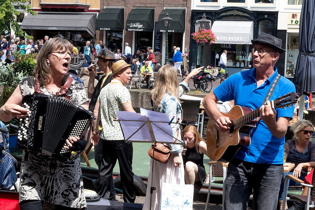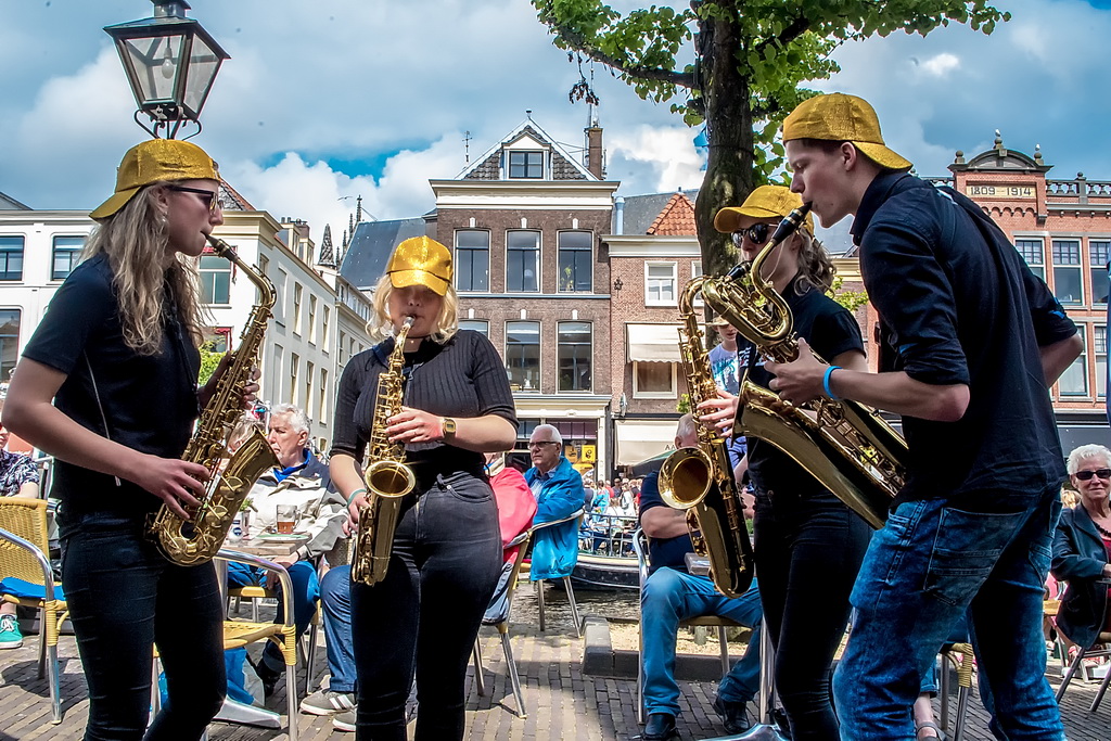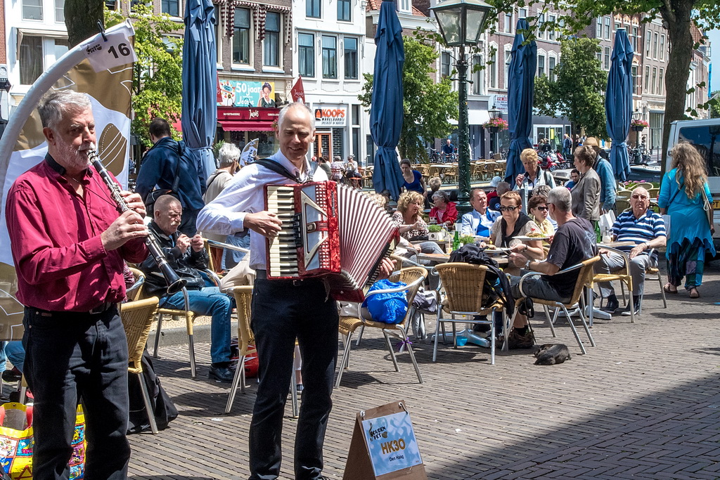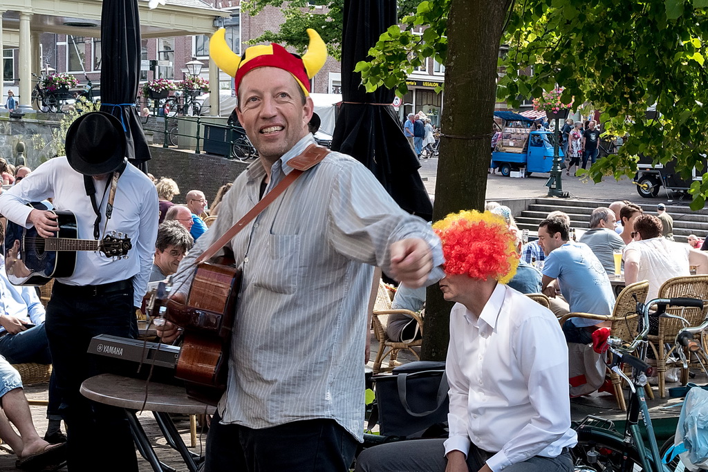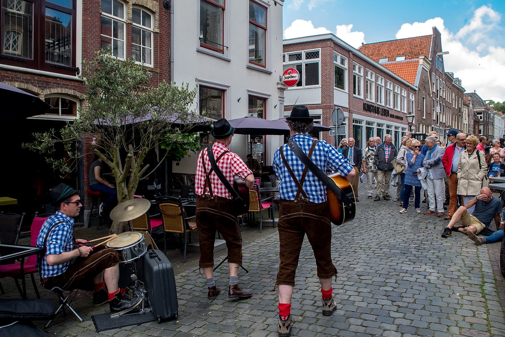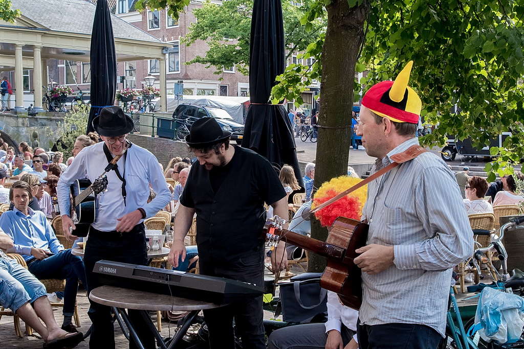 Wat weer opviel, is dat Leiden zich niet heel erg veel gelegen laat liggen aan festivals. Ook nu kruisen fietsen dwars door optredens heen, maar ook scooters (aan de hand met de motor aan). Bij Palaver, Lanyok en Eldorado stoorde dat. Het is al lastig om publiek te laten stoppen en vast te houden. De Kelvinators kunnen er best iets van, maar op de Nieuwe Rijn kostte het moeite mensen tot luisteren te bewegen. Waar ‘m dat in zit? Aan de overkant bleven mensen wel staan bij de Schwarzwalderkirschband. Maar die spelen met z’n drieën, gekleed in Lederhosen, dan ook meedeiners. Aan kwaliteit ligt het niet. Iets als HK30 dat prachtige klezmer speelt, had baat bij het steegeffect: minder geluid én lagere passeersnelheid waardoor hun vrolijk-melancholische muziek je in de kraag kon vatten.